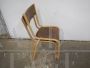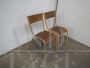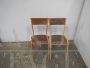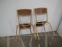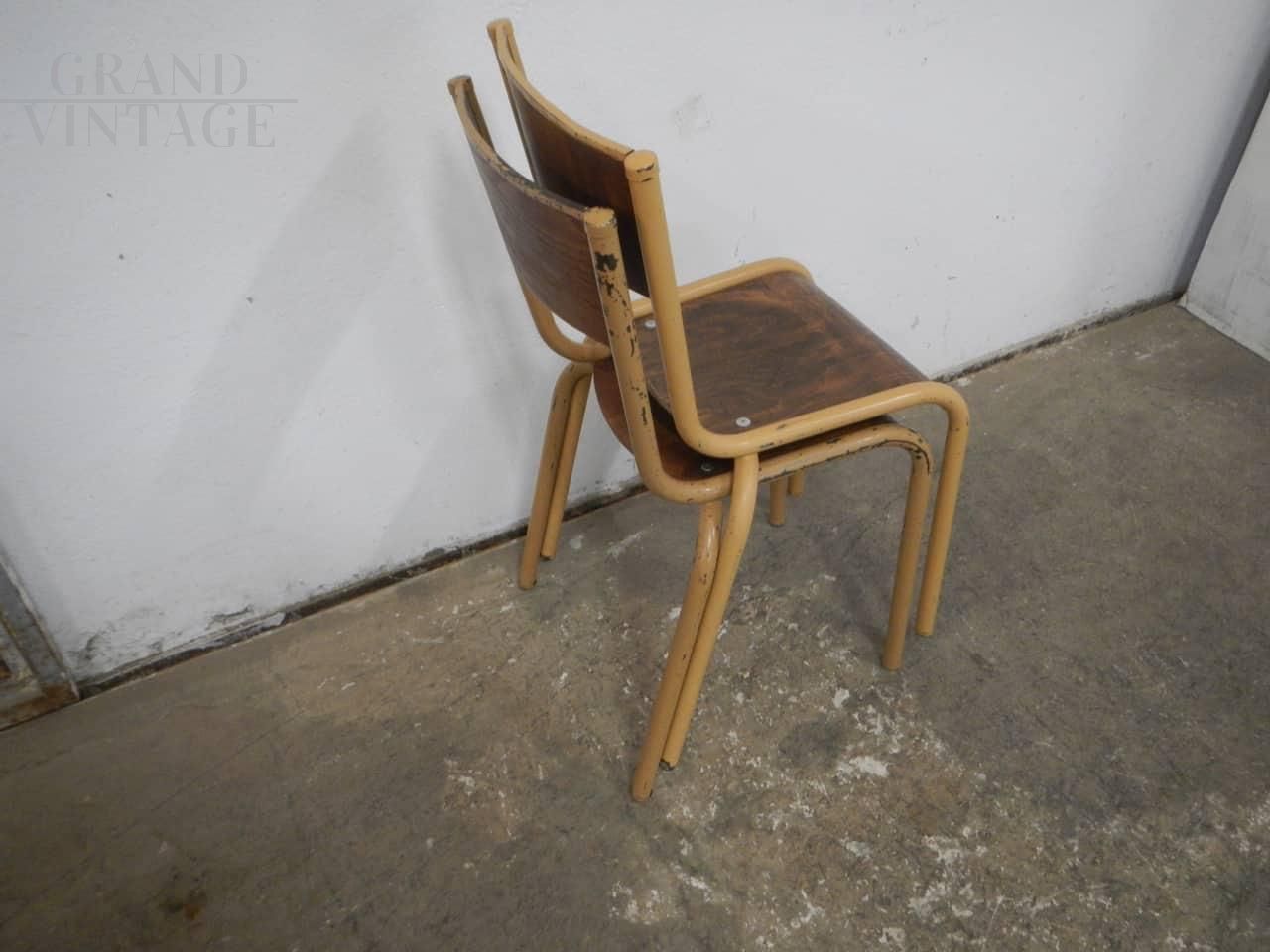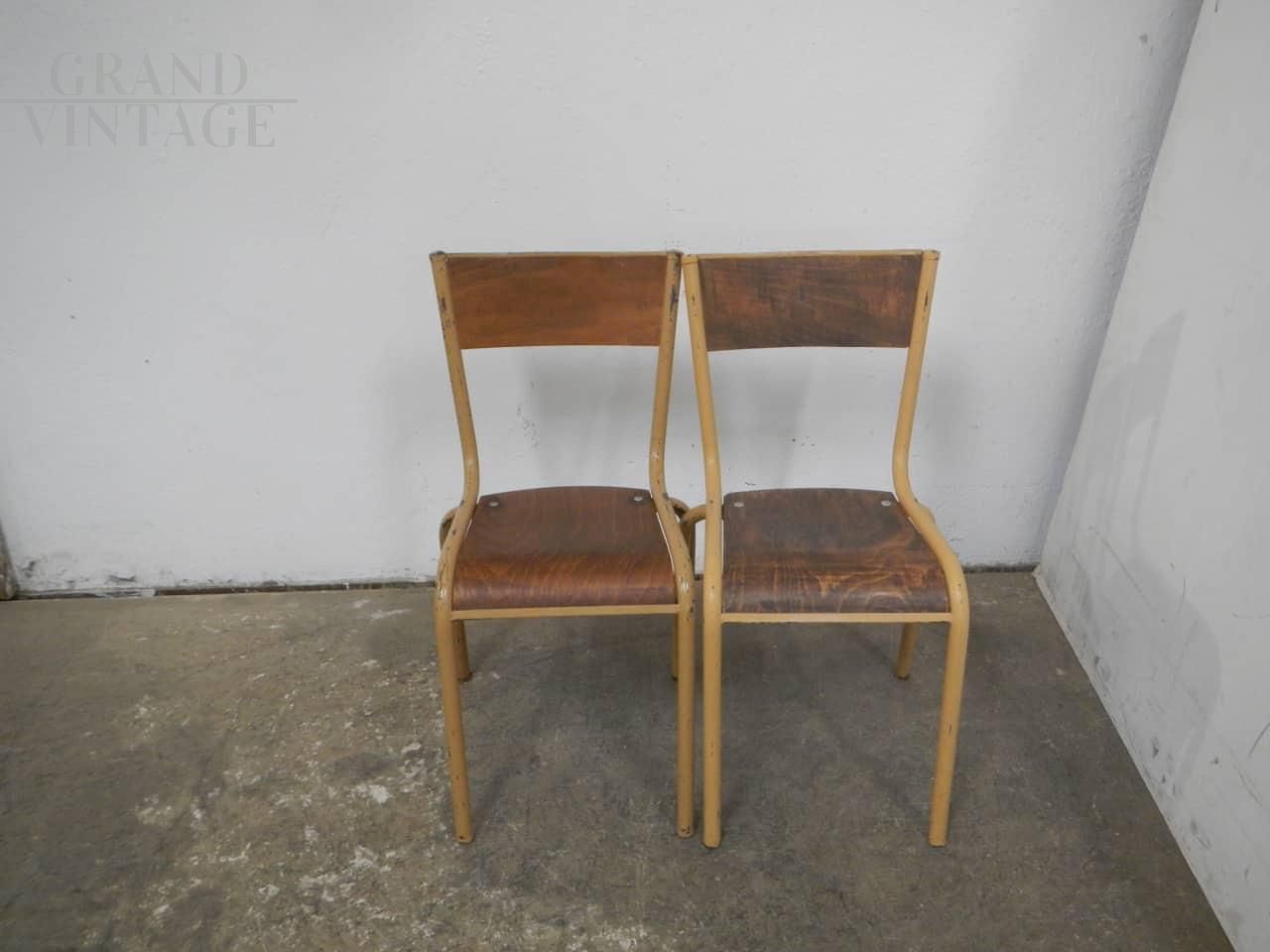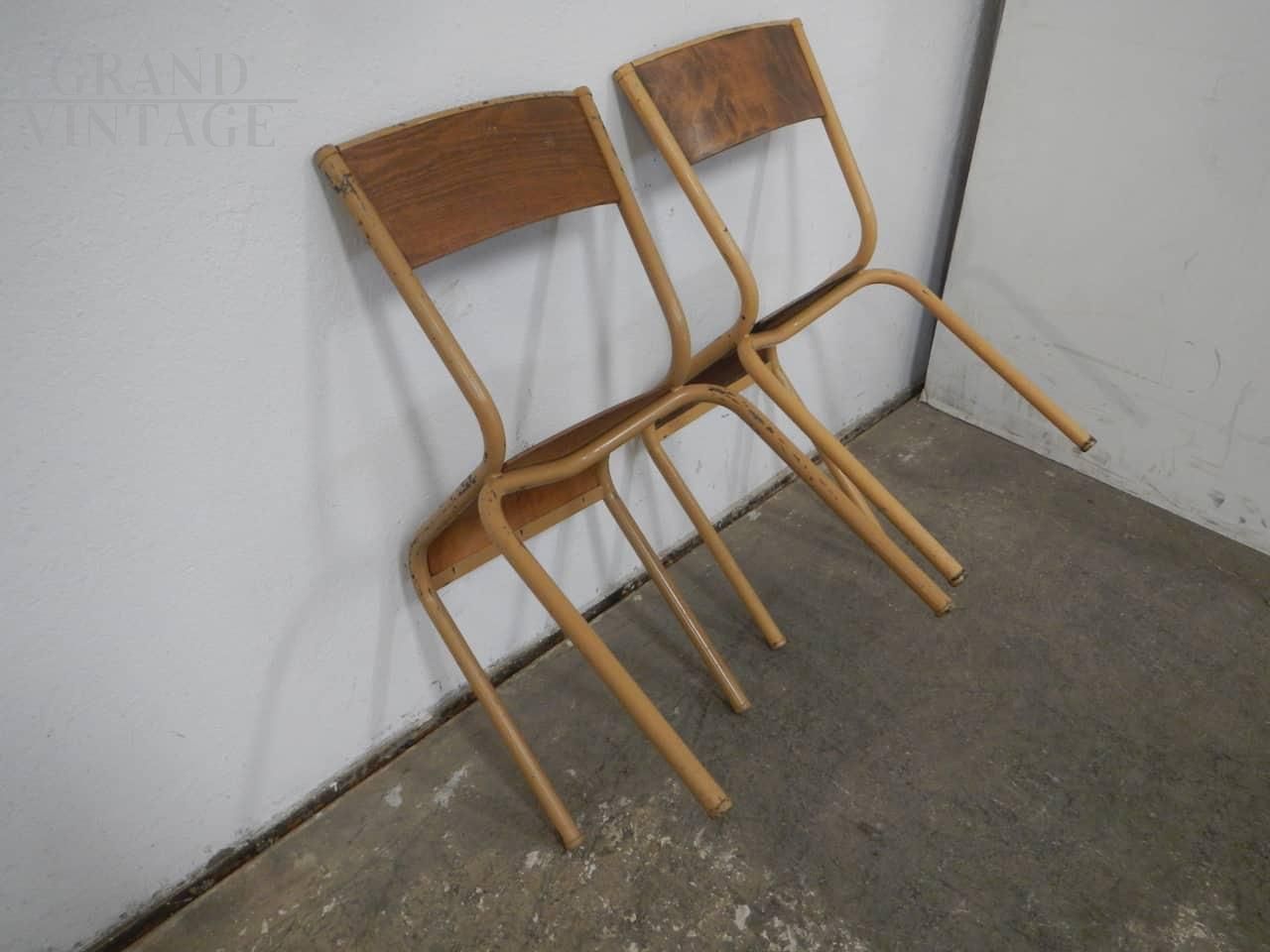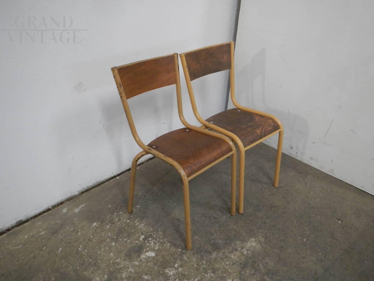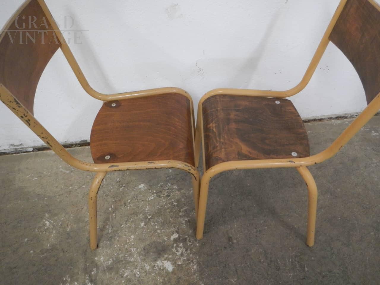 Pair of stackable chairs made by Mullca in France, 1960s, in light brown colored iron and seat in dark birch blockboard. Seat measures 45x45 cm.