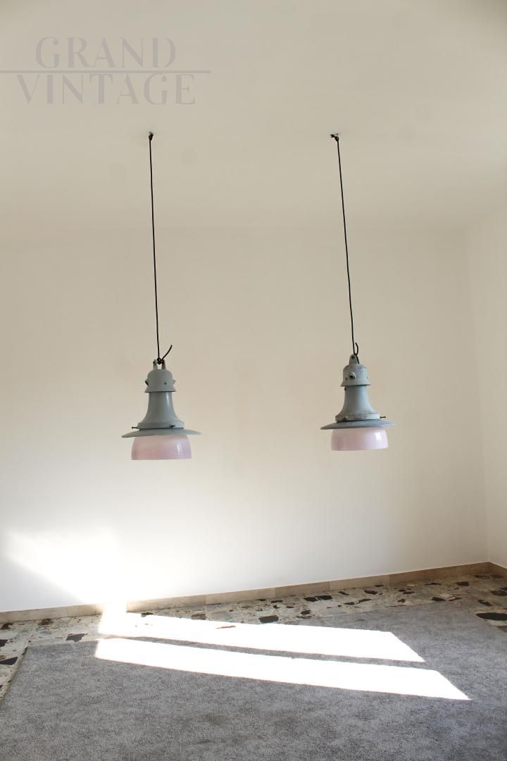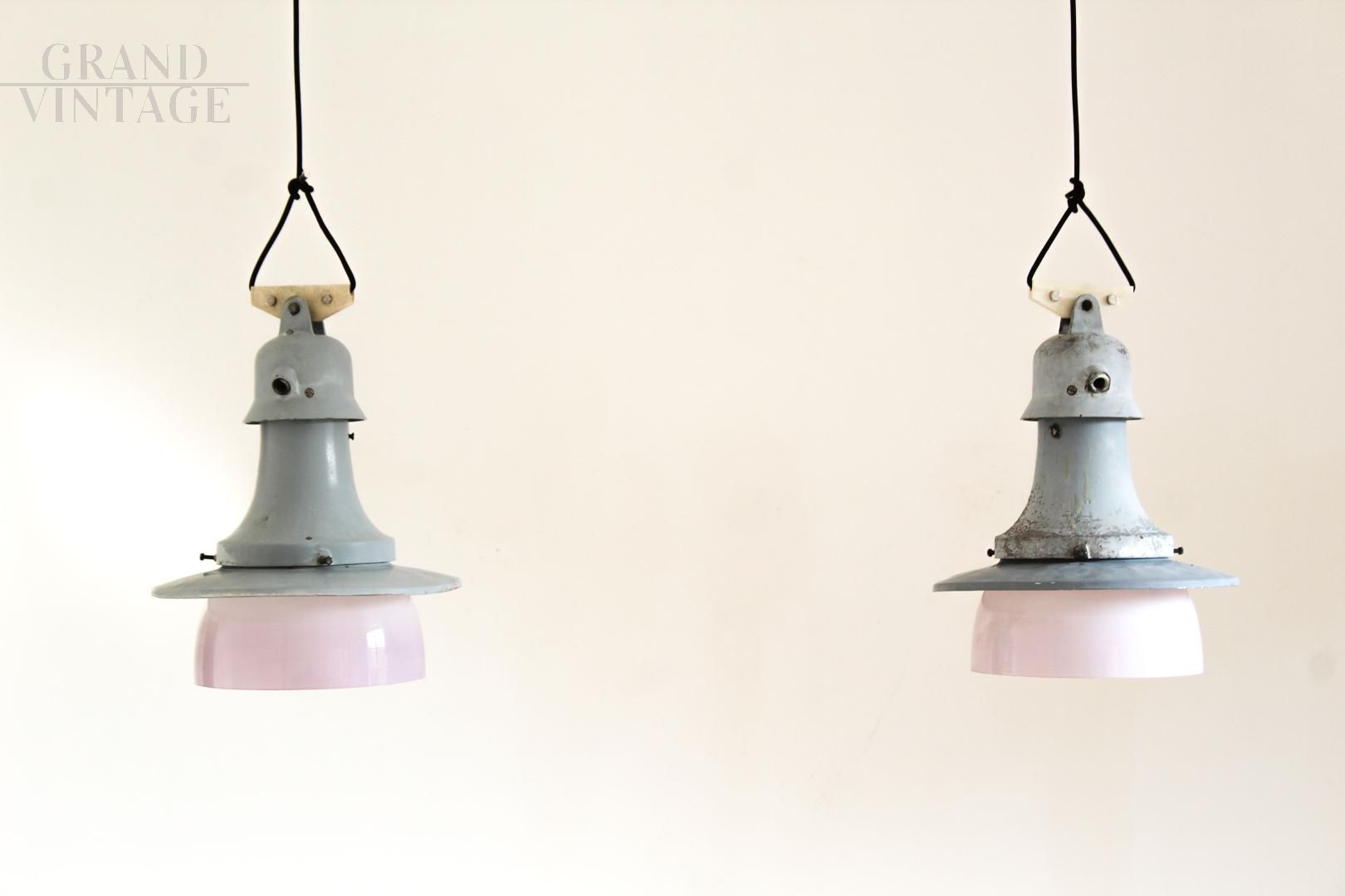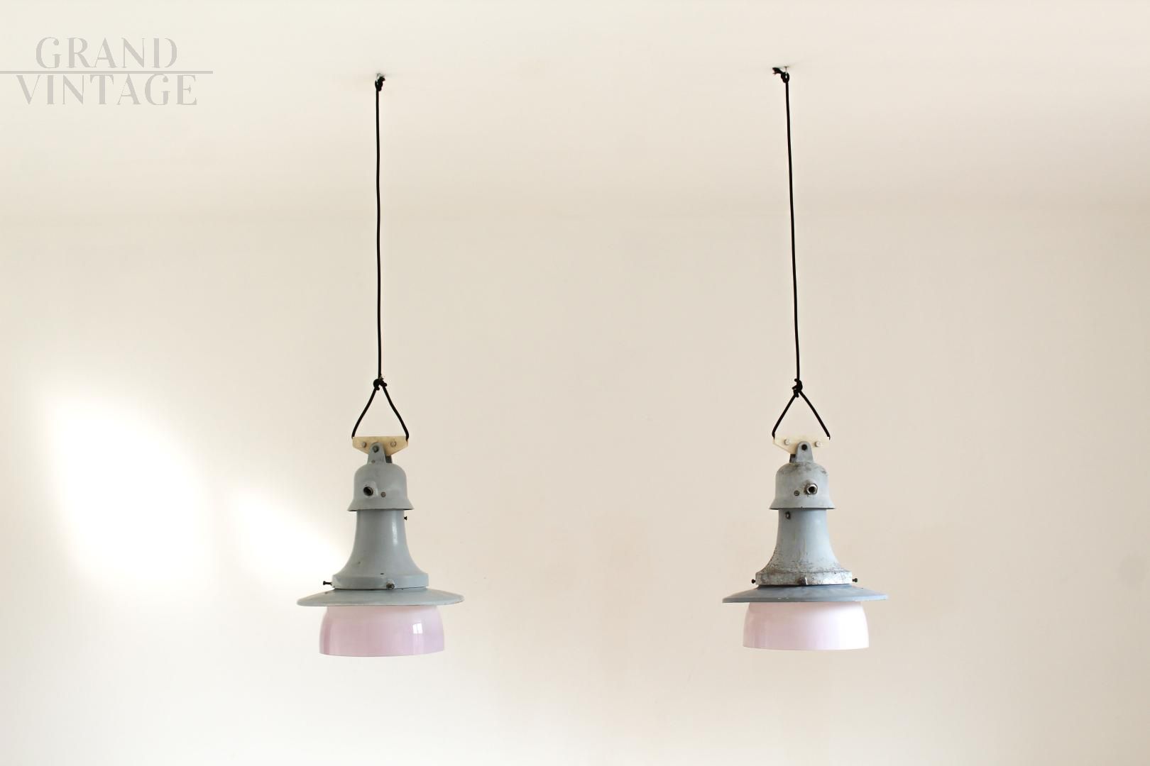 Pair of suspension street lamps, Italy 70s, with grey lacquered aluminum and alloy structure, easily dismountable, the surface can be scratched and re-lacquered in another color. The electrical system can be easily modified.