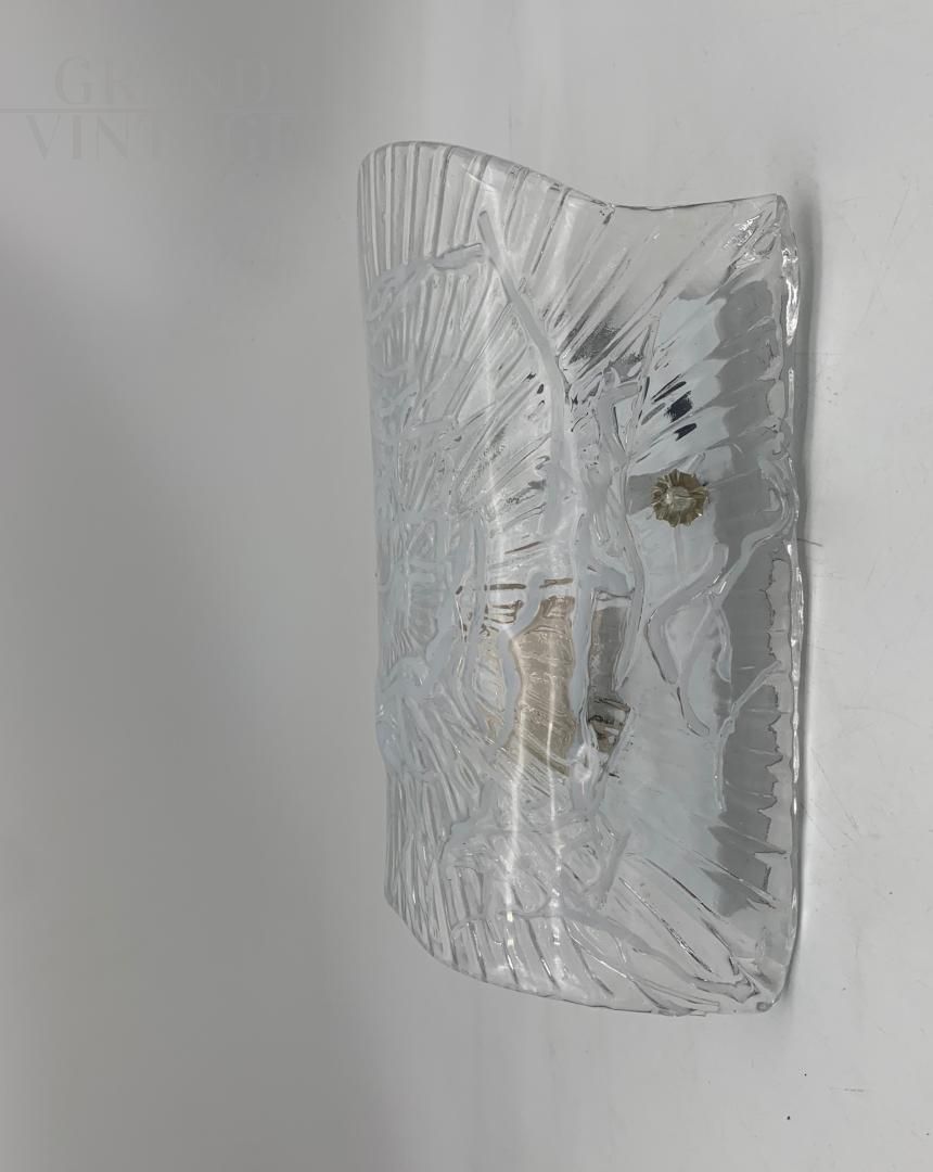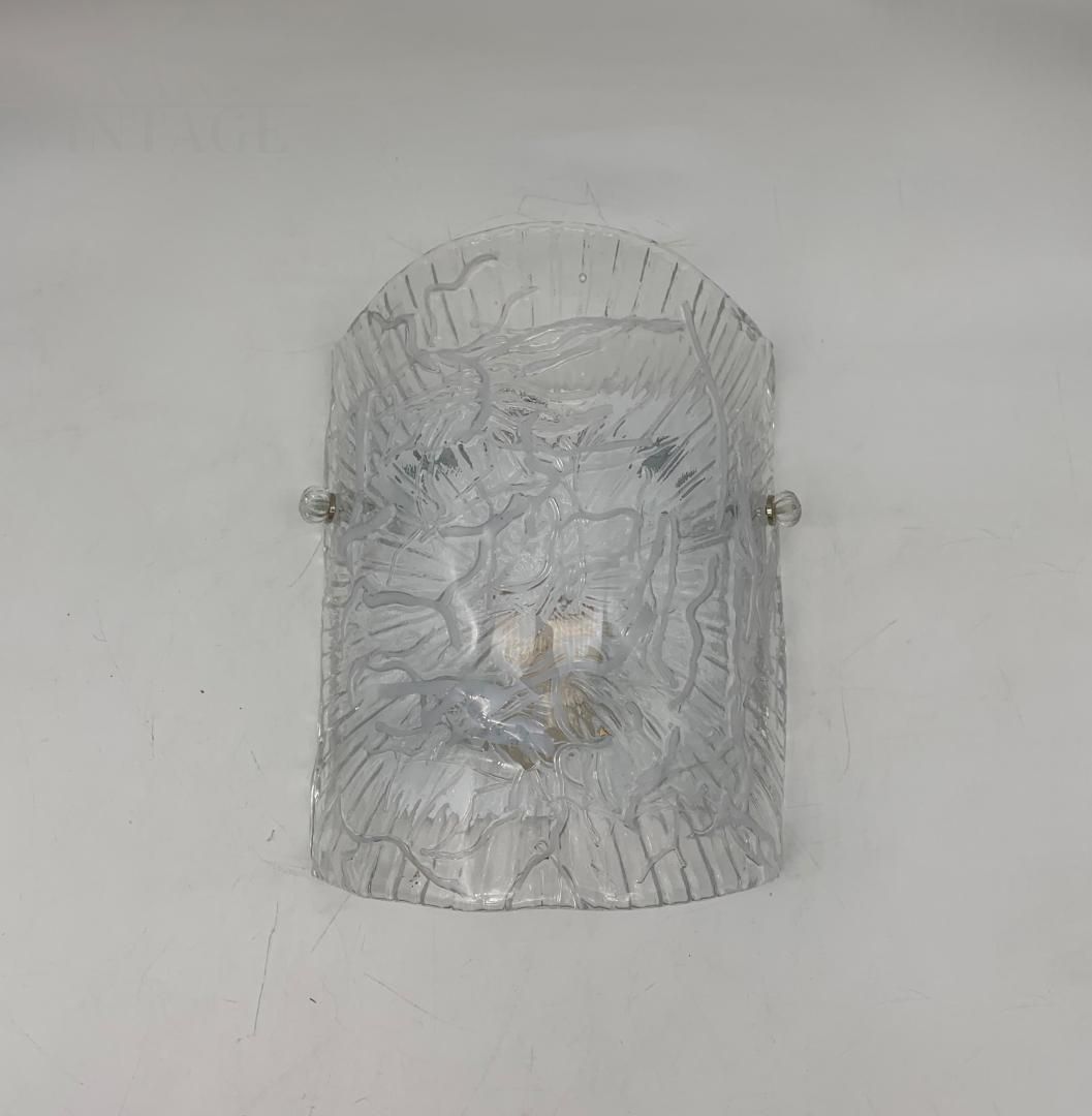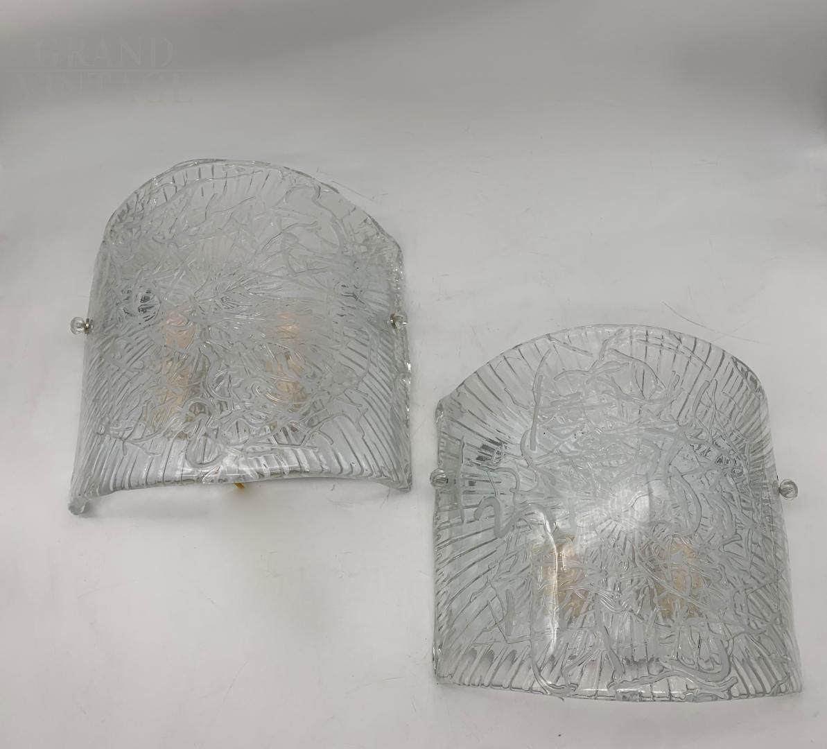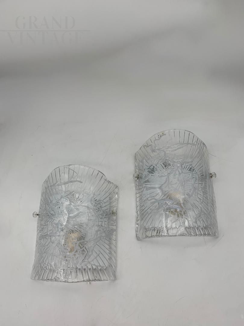 Pair of very particular wall lamps from the Sylcom company in Murano glass hand-worked on a plate and finely decorated, with white lacquered metal structure. The appliques are a warehouse item, made around 2010, and have never been used. Each wall light has two connections for E27 plastic bulbs, new electrical system. In excellent condition, the glass is not cracked.