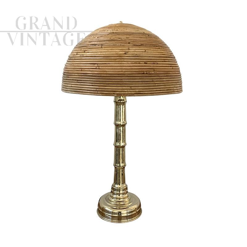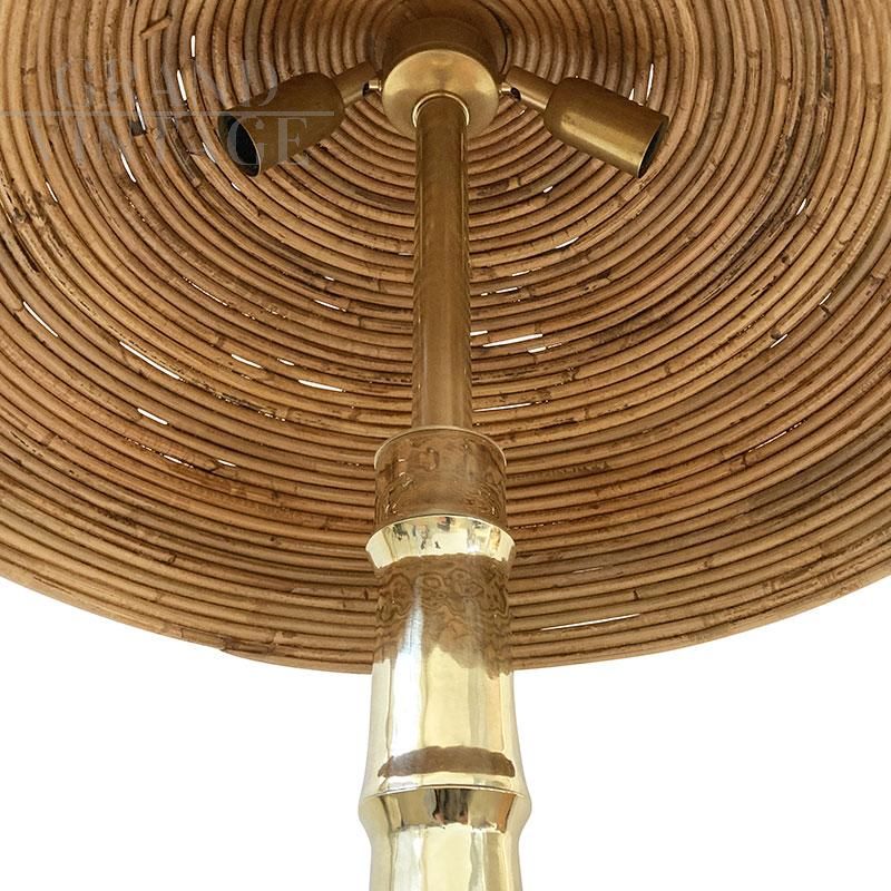 Pair of table lamps with base and stem in polished brass with bamboo effect and natural bamboo lampshade, each lamp is characterized by two adjustable light points for E14 type bulbs.