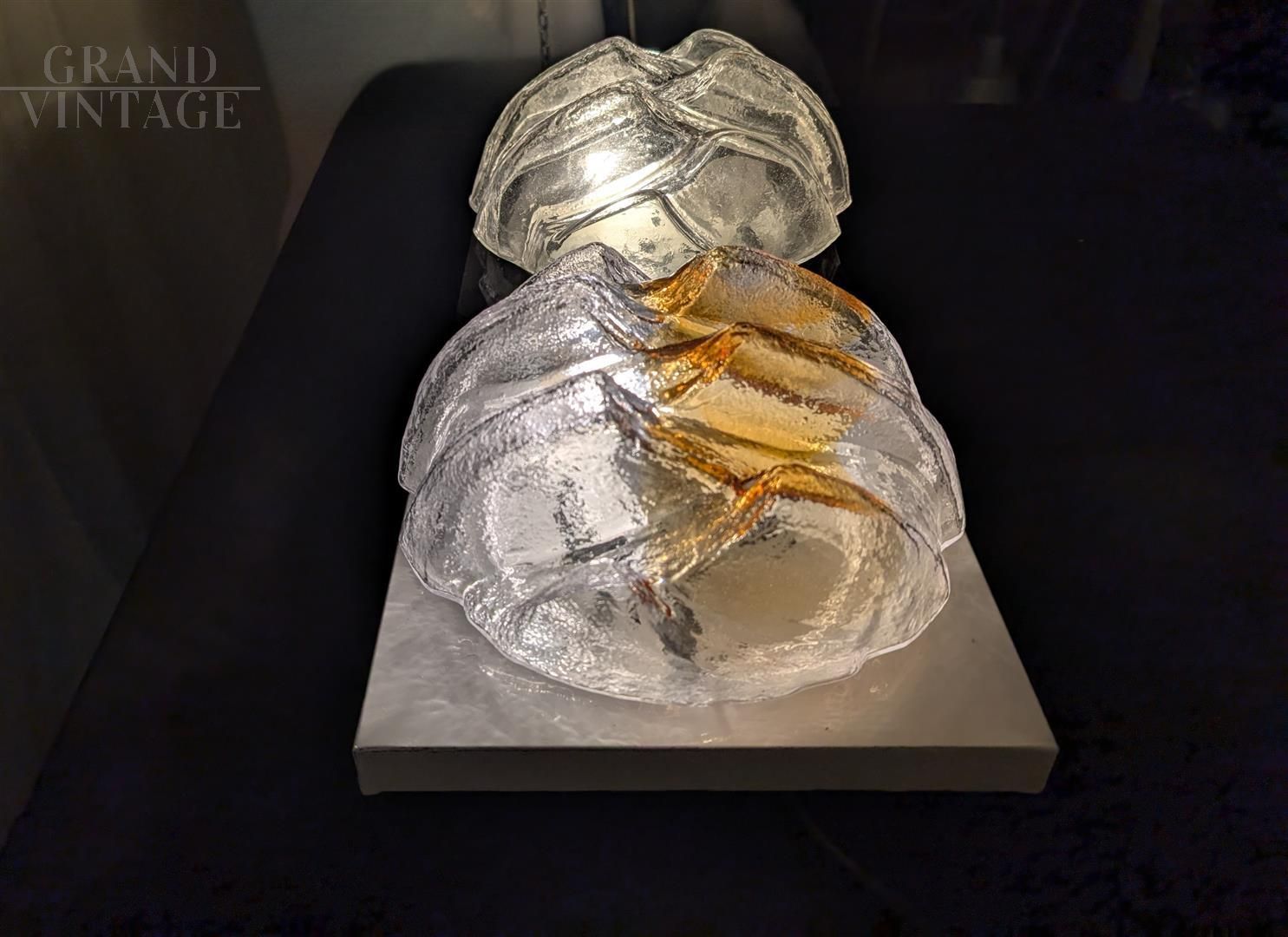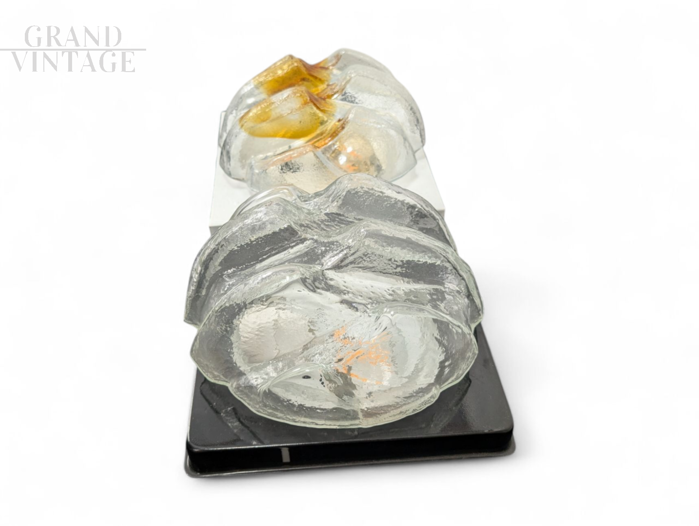 Pair of Murano blown glass appliques sconces in transparent and amber colors on black and white lacquered iron panel, made in the 70s. Preserved and in perfect condition.
