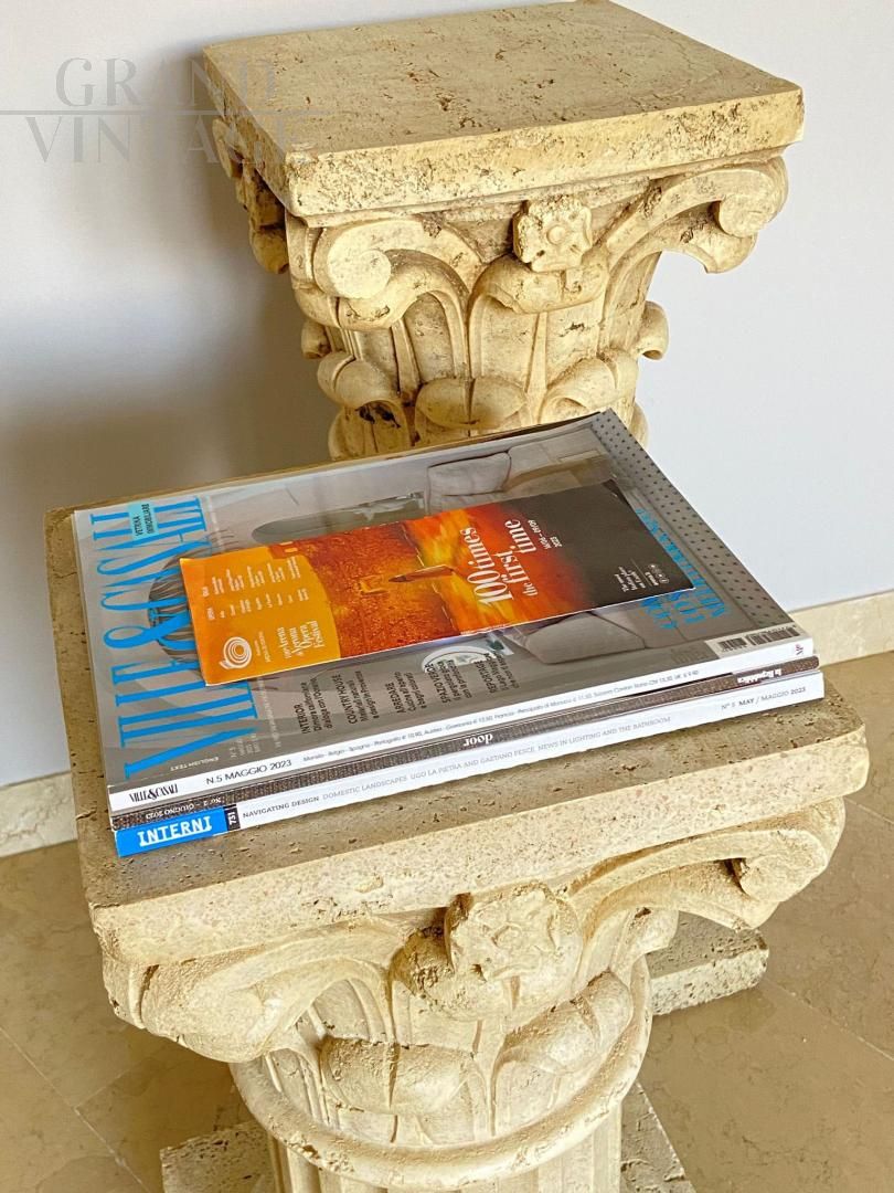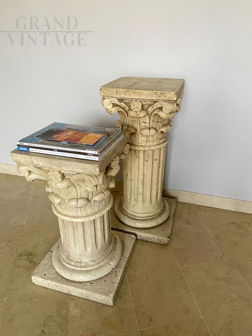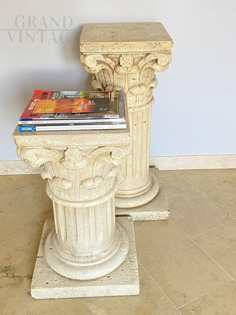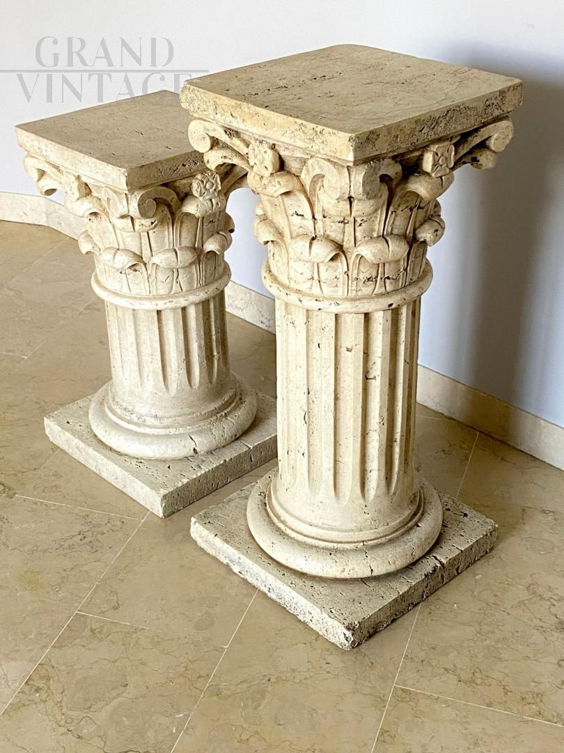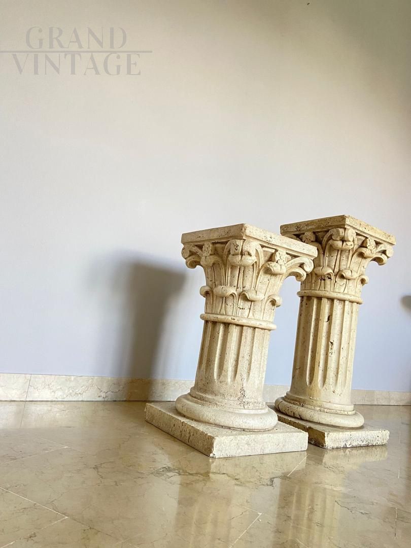 Pair of indoor columns in Travertine marble with Corinthian style capitals, Italy 1940s, perfect as a decorative element to hold sculptures or lamps. The scenographic impact of these objects is indisputable and timeless. The tallest column has a height of 75 cm and a side of 36 x 36 cm, the lowest has a height of 60 cm and a side of 36 x 36 cm.