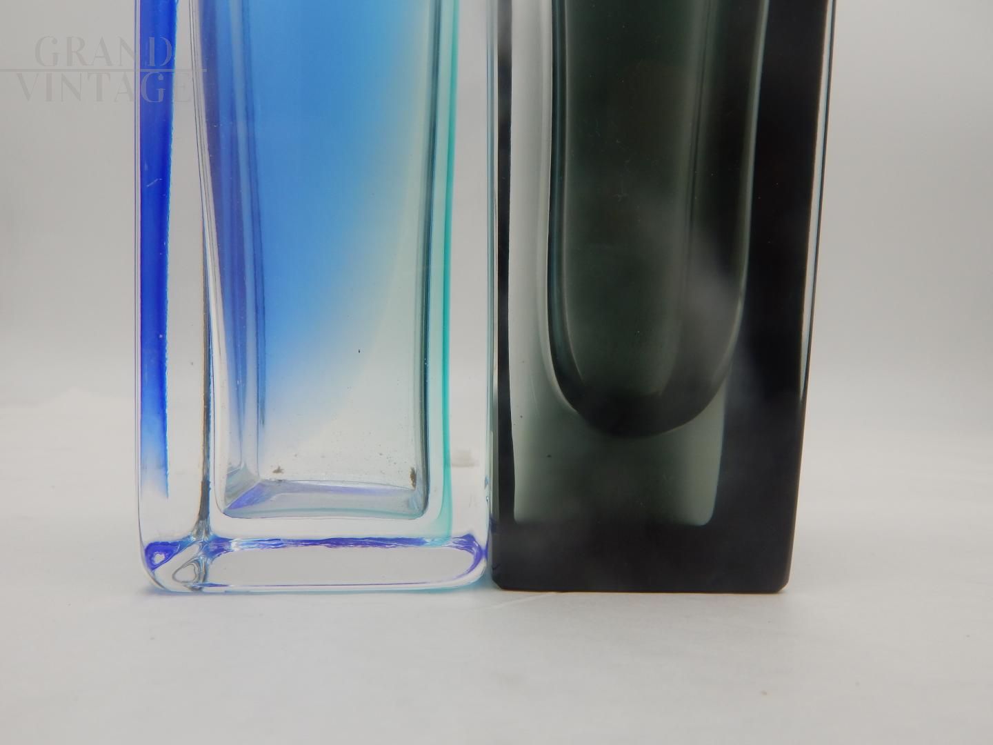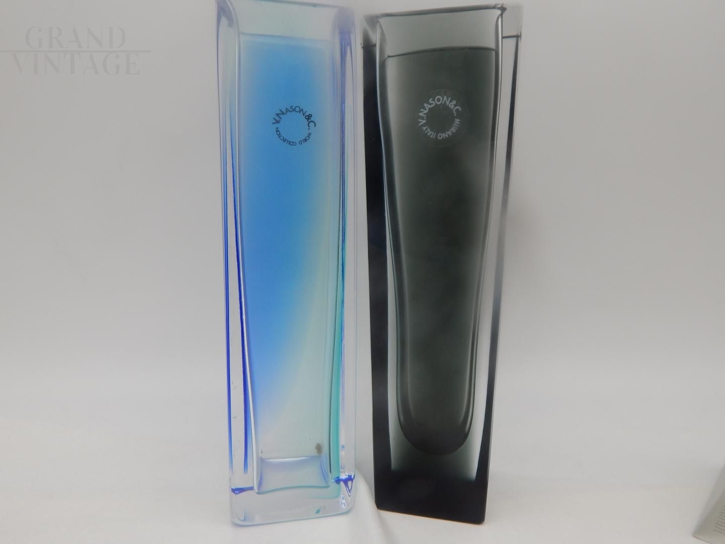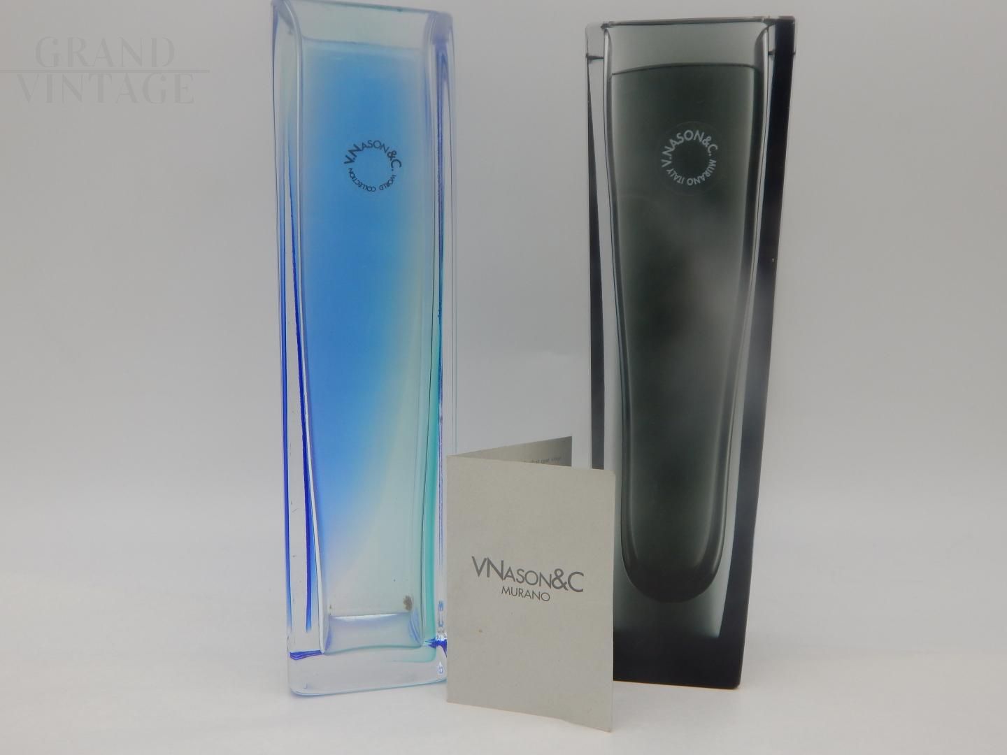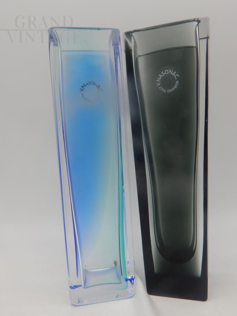 Pair of Murano glass vases by V. Nason, from the Eklettika line, 1970s, made with the submerged glass technique, one in blue and the other in black. The set is new, complete with boxes, with original documentation and anti-counterfeiting seal.