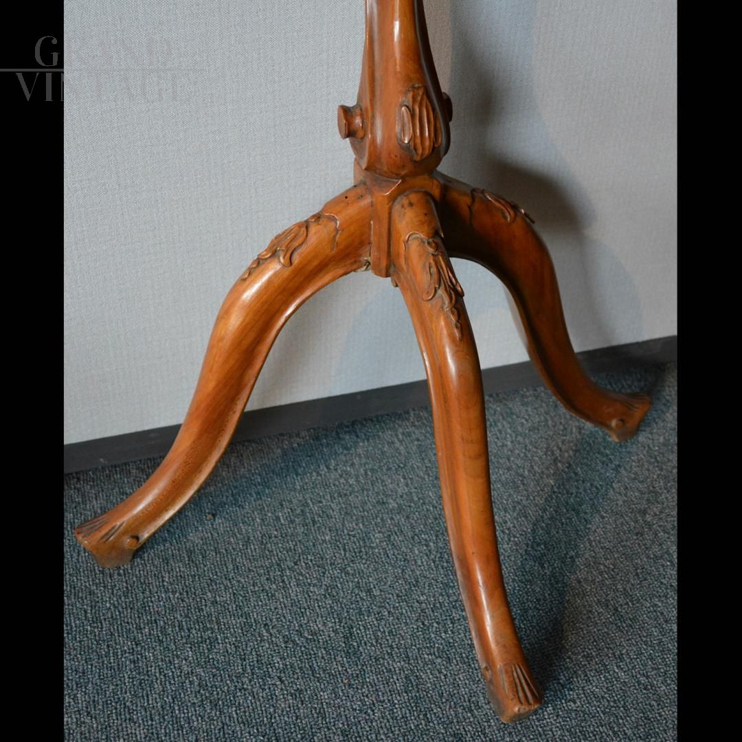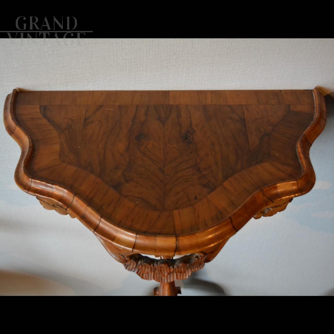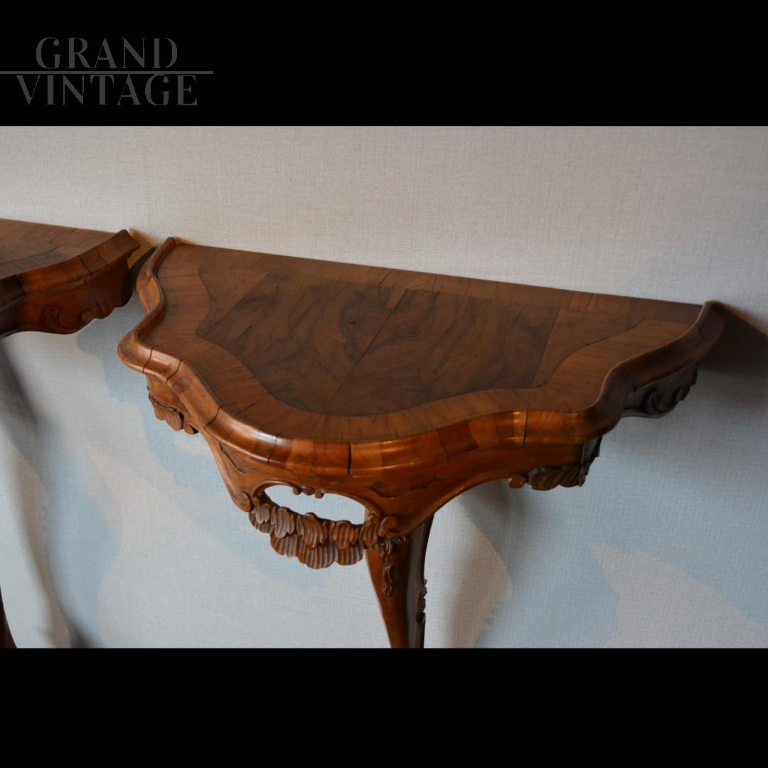 Two small consoles of the twentieth century of Venetian origin, with a delightful and refined rococo-style carving, the support is in cherry wood and the top in olive wood, the whole perimeter of the top is edged with olive wood for the head, while the support it is slightly curved and very well carved. By joining the two consoles, thanks to a hook in the part that goes to the wall, a table is formed. They do not need a real restoration, but a simple wax.