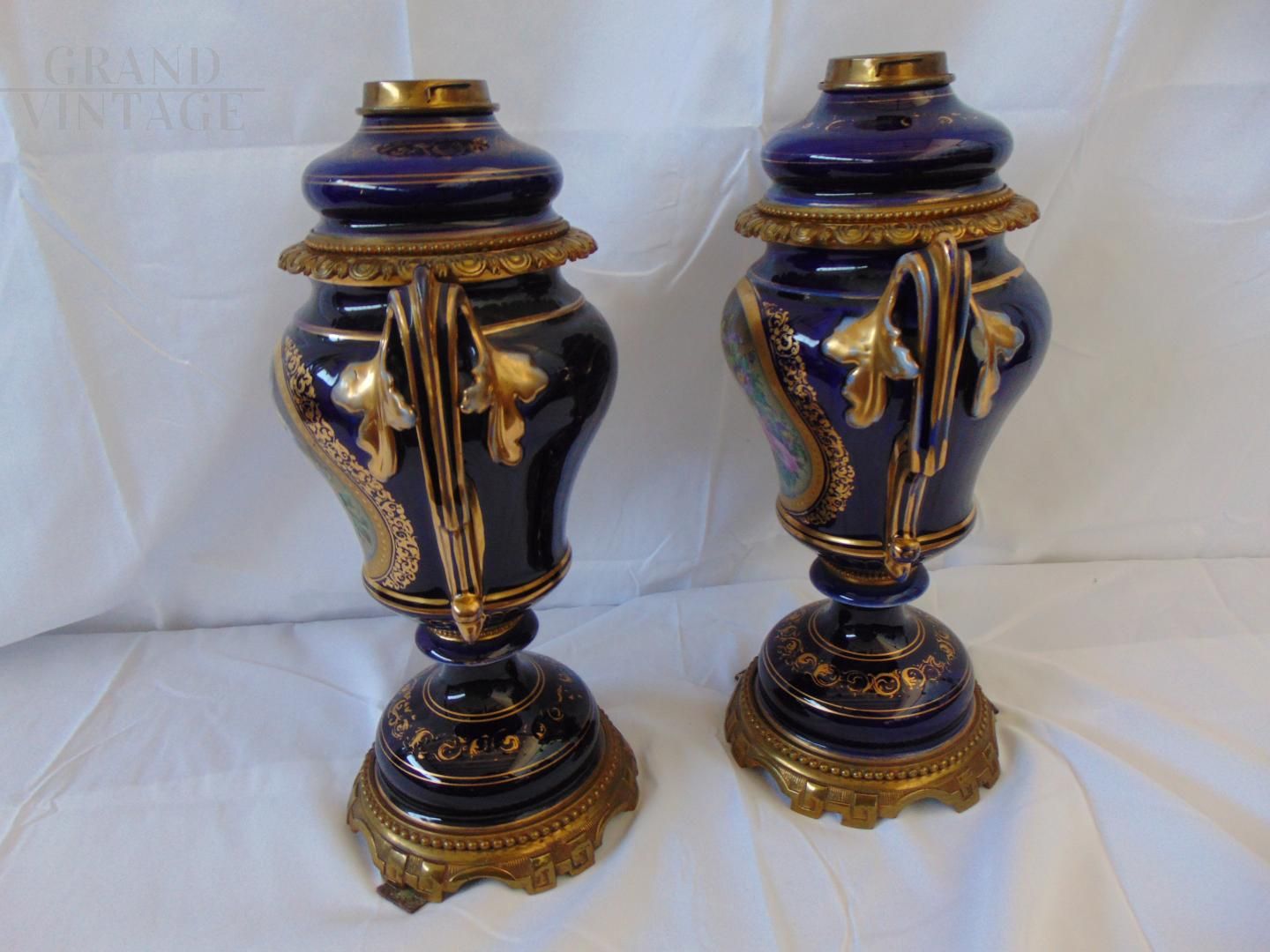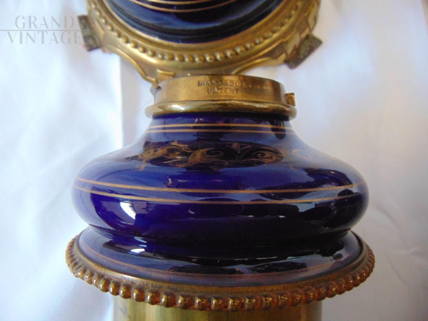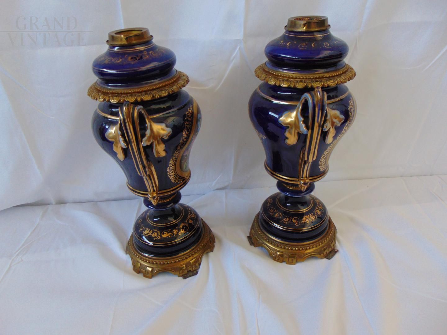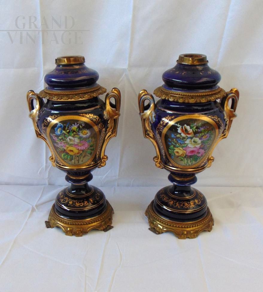 Pair of beautiful Hinks & Son British Victorian oil lamp vases in blue ceramic decorated with hand painted floral central medallion and gilt details, base and parts in bronze. In good condition.