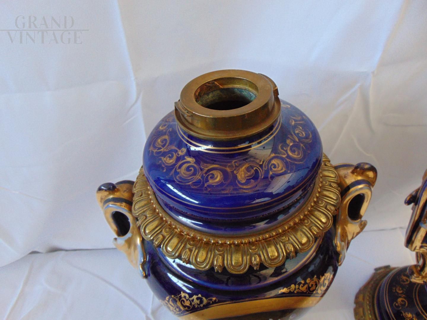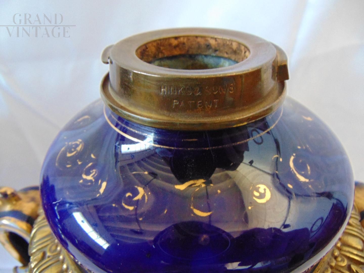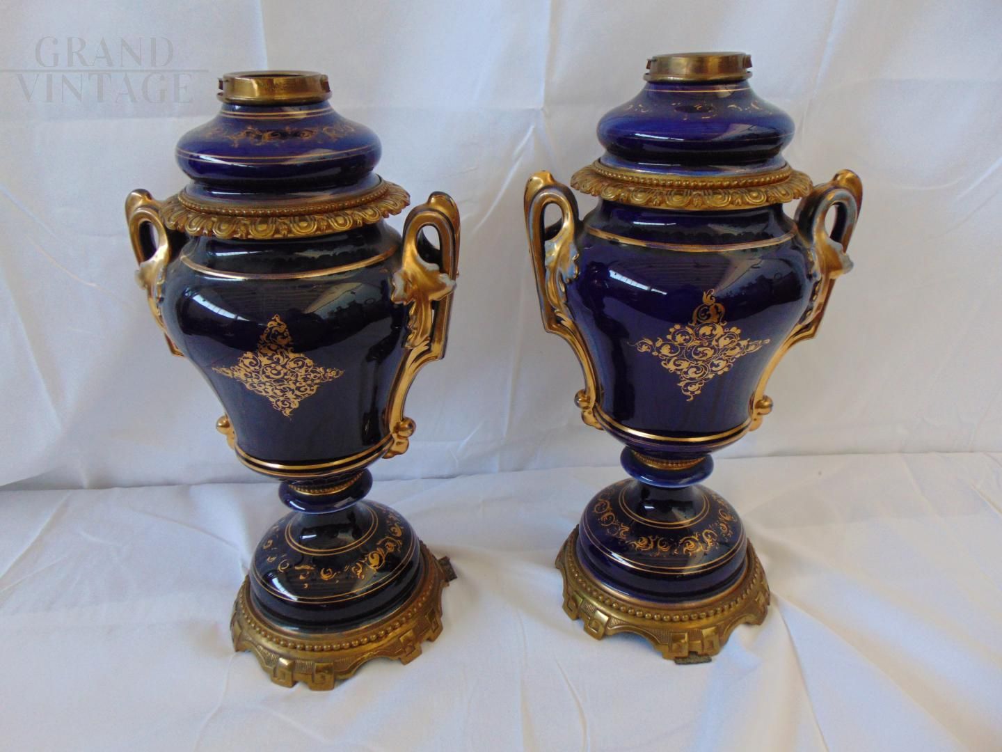 Pair of beautiful Hinks & Son British Victorian oil lamp vases in blue ceramic decorated with hand painted floral central medallion and gilt details, base and parts in bronze. In good condition.