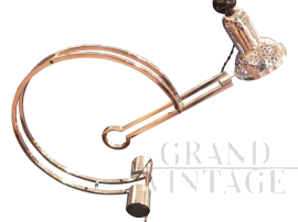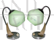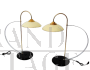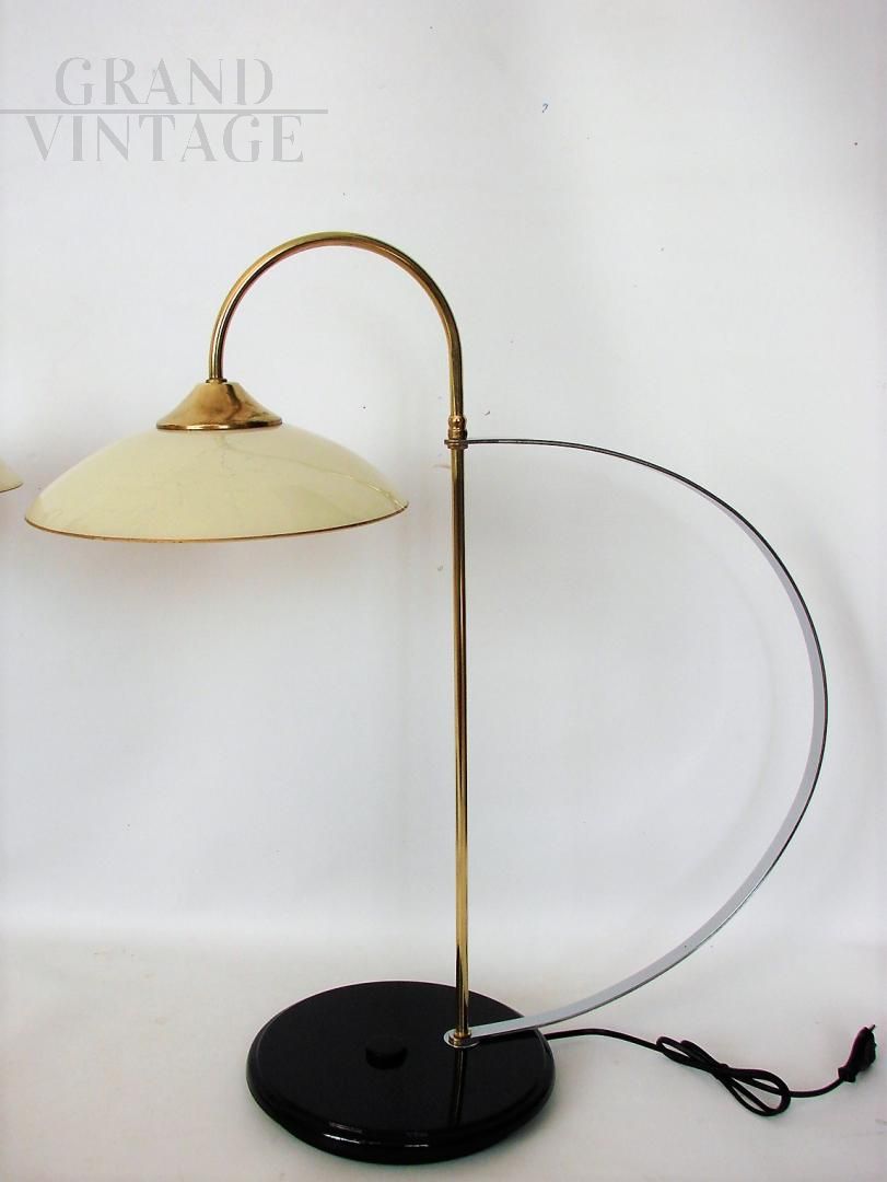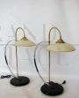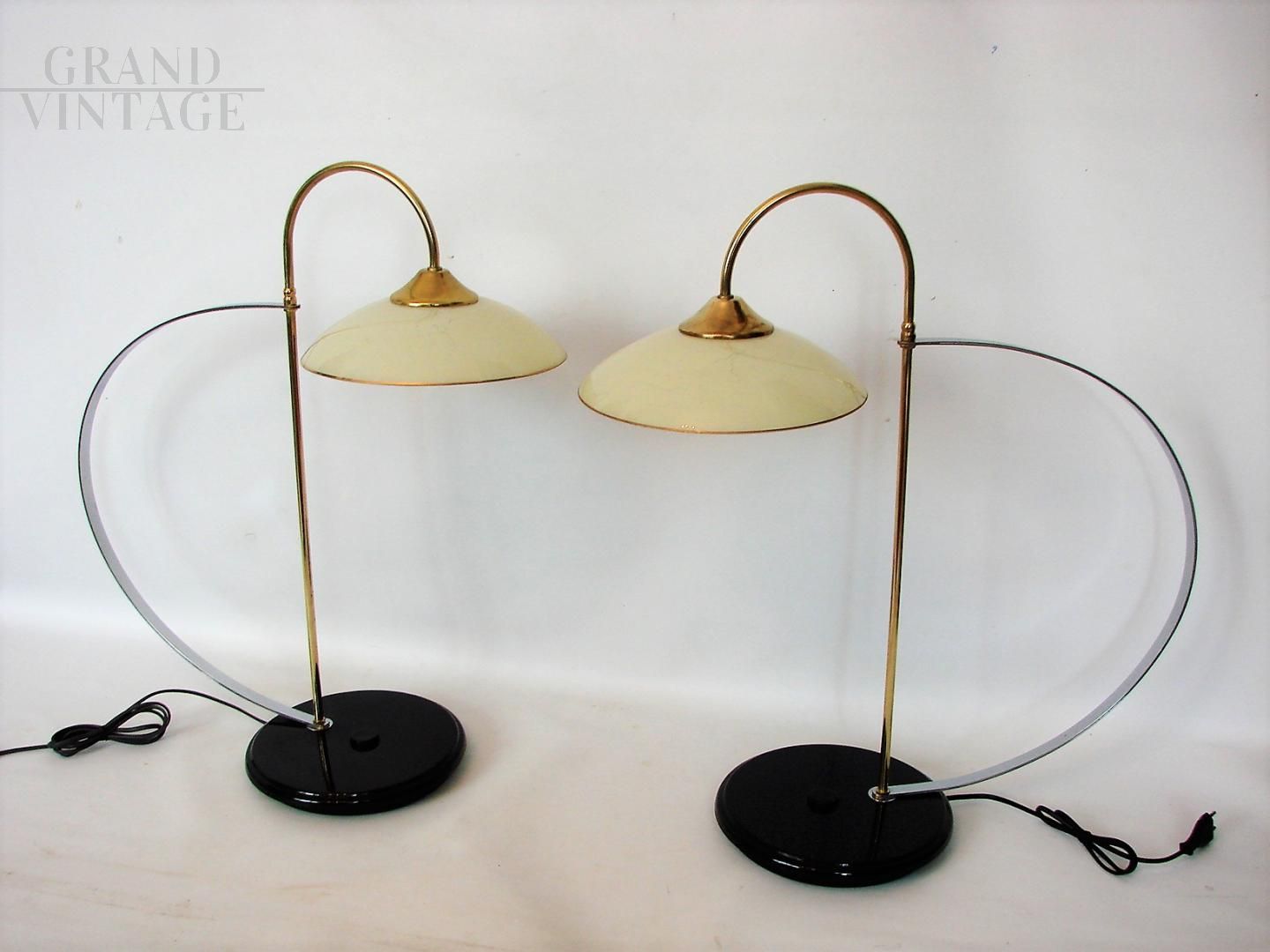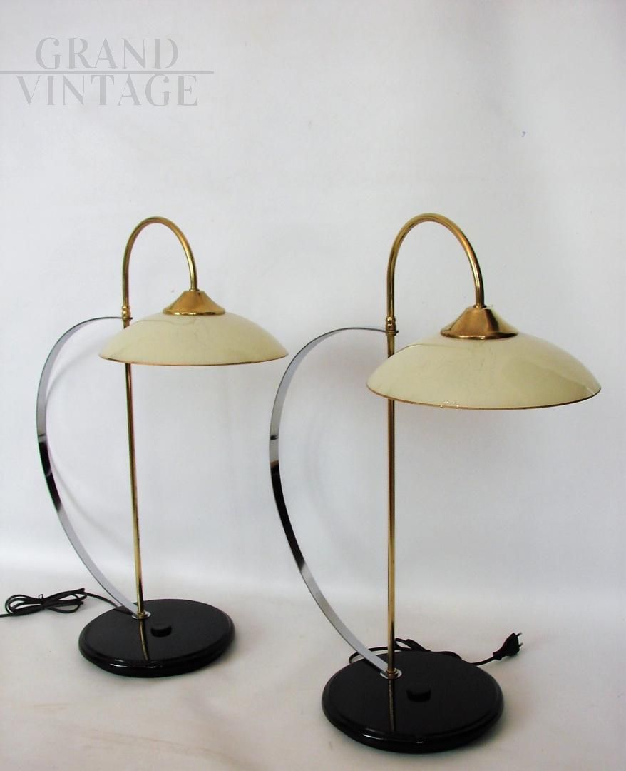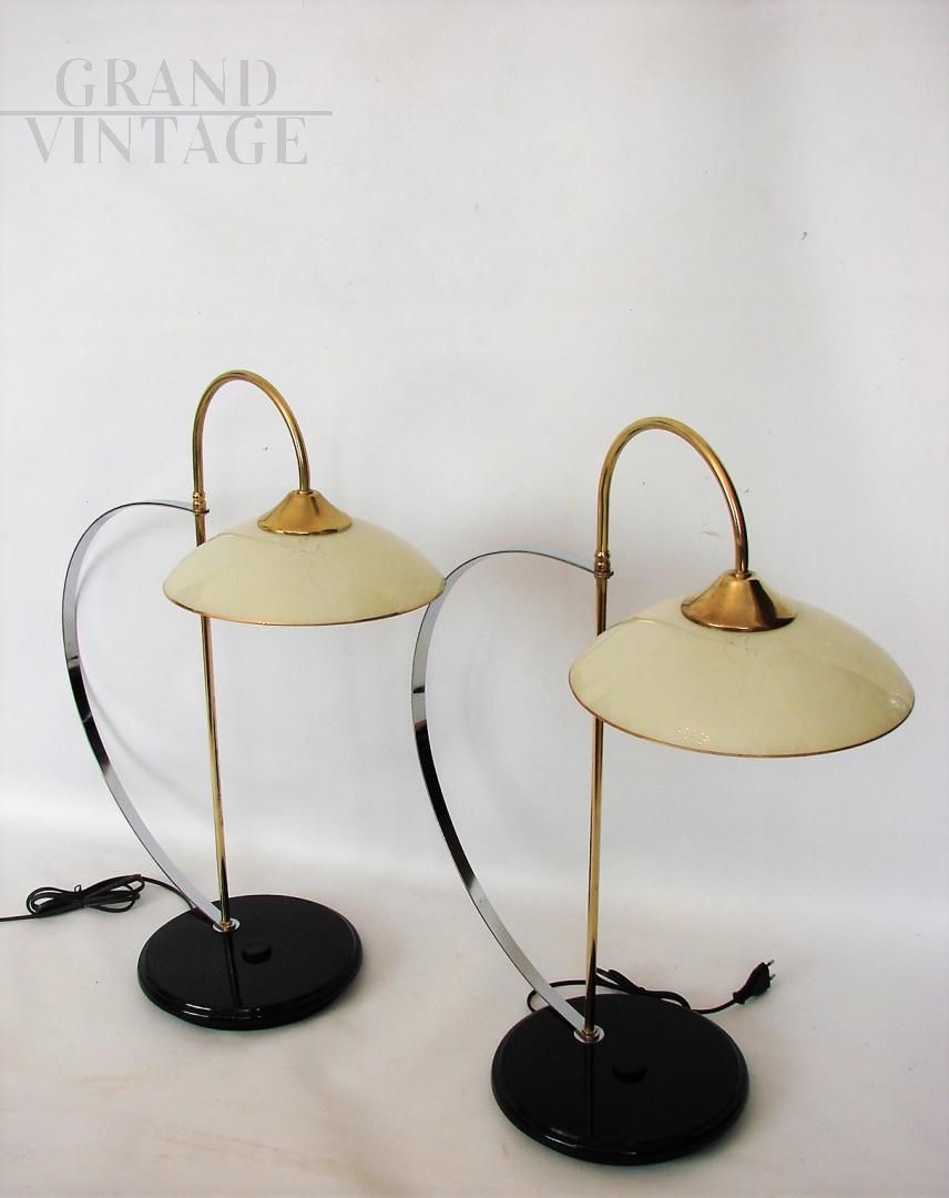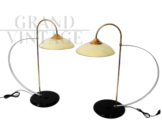 Pair of minimalist 70s table lamps in brass, metal and glass. The lamps require an E27 bulb.