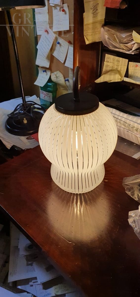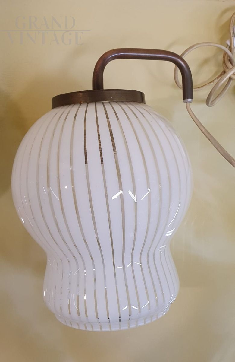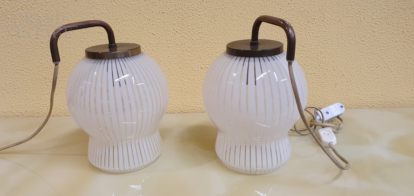Pair of beautiful 70s abat-jour lamps in white striped transparent glass with brass structure, rare shape and quality workmanship. The lamps are in excellent condition, no visible defects, the brass is kept in patina but it is possible to polish it and make it gilded, according to taste.