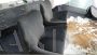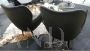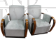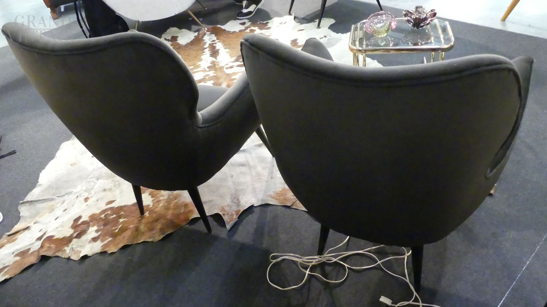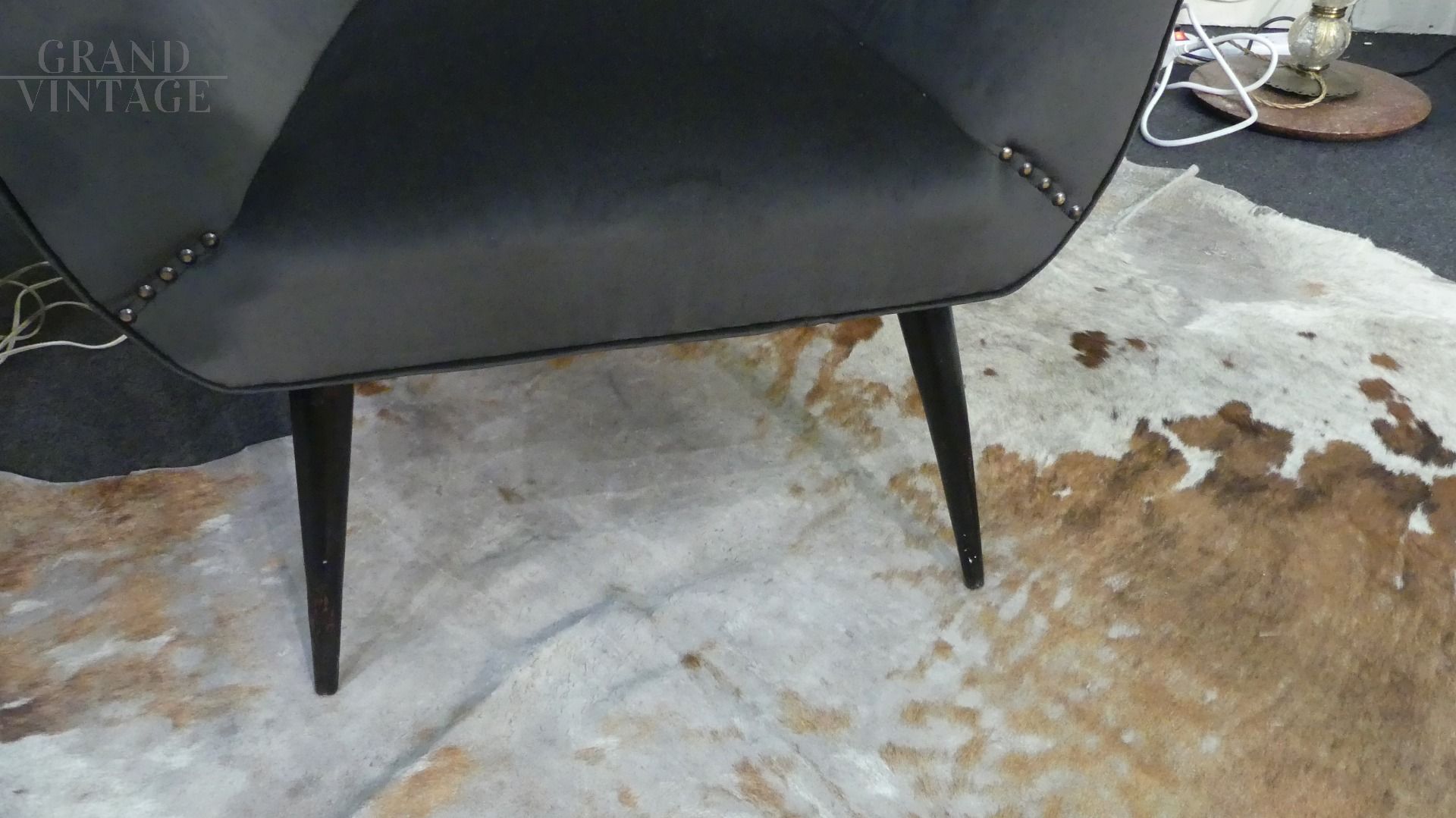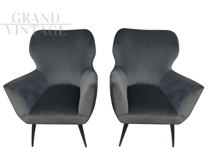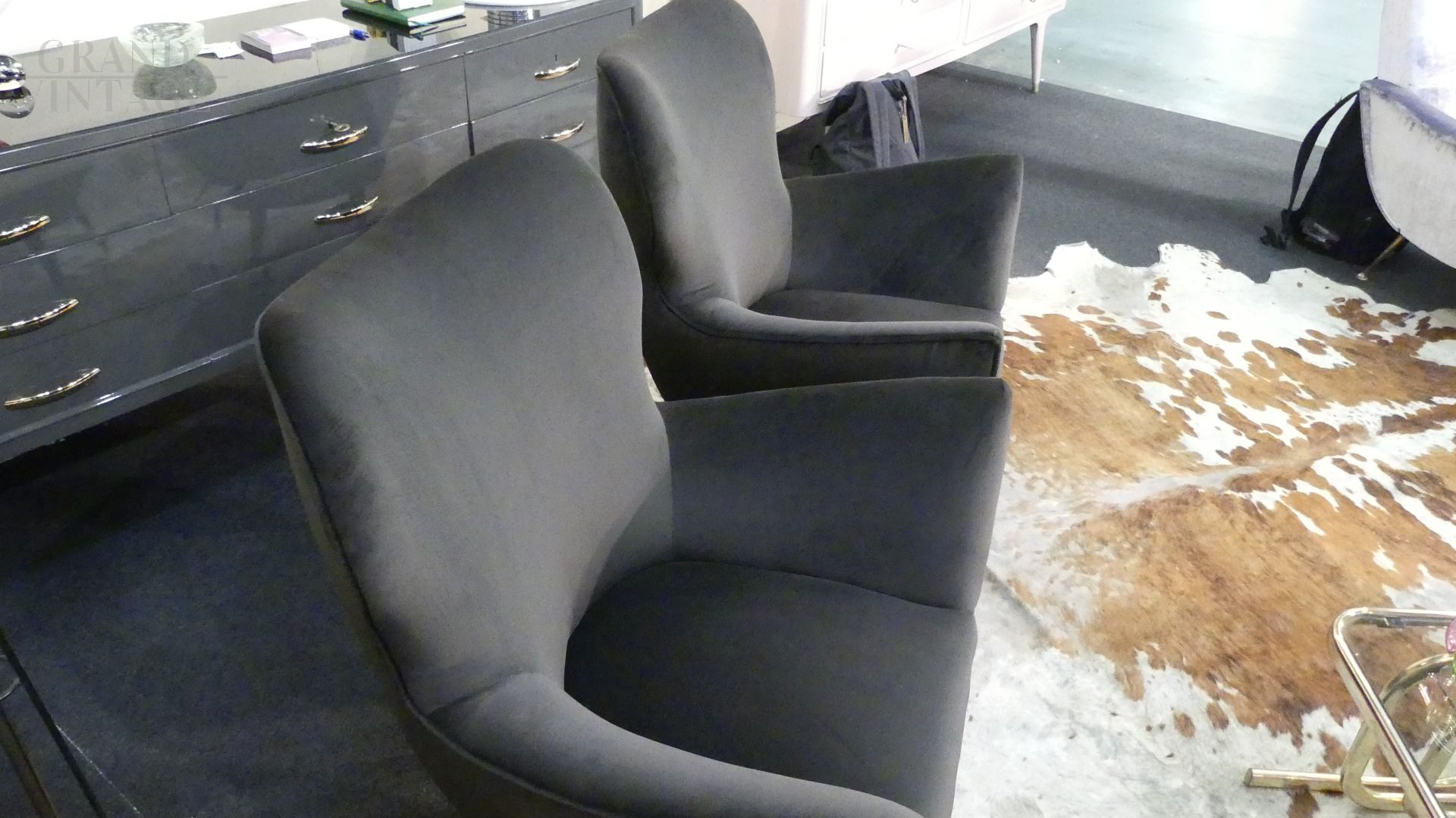 Pair of vintage armchairs with wooden legs, newly upholstered with an elegant anthracite-colored alcantara fabric.