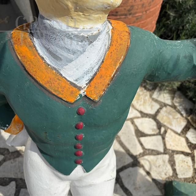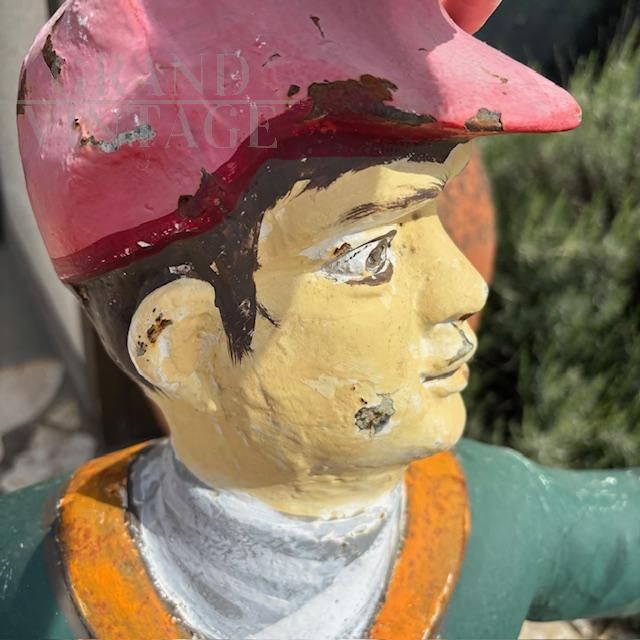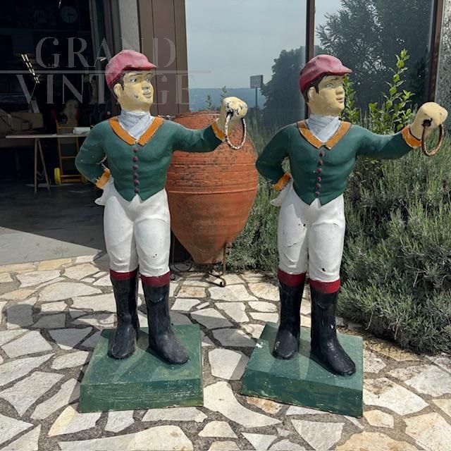 Pair of rare American cast iron garden sculptures depicting two jockeys with horse rings, hand painted, have undergone restoration over time, are in very good condition.
