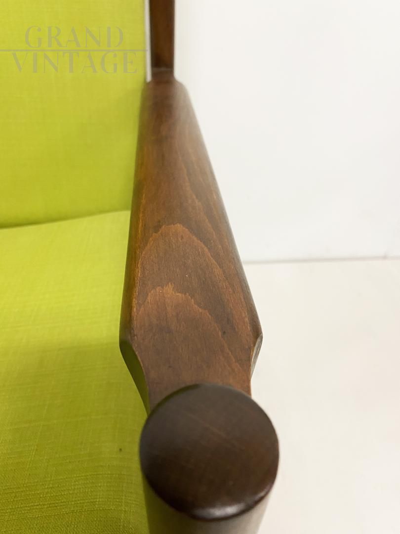Pair of vintage design armchairs with a Scandinavian taste with cherry wood structure and original lime green cotton upholstery, Italian mid-century modern design from the 70s.