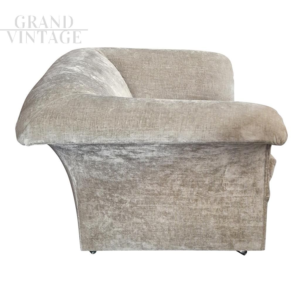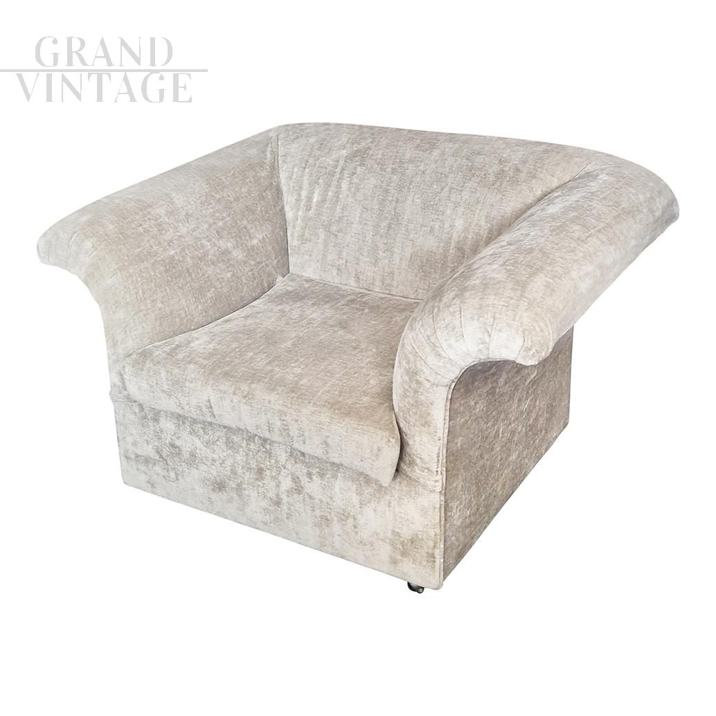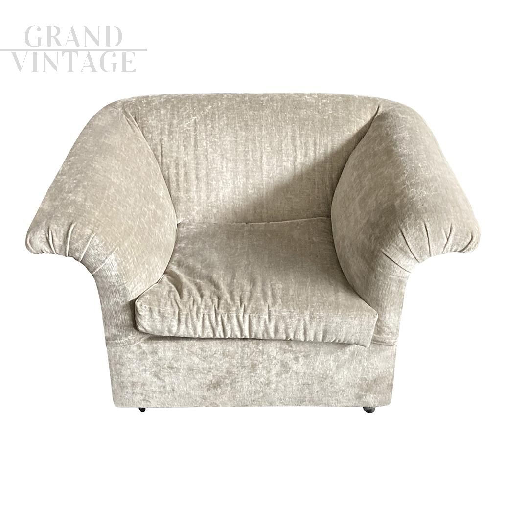 Pair of vintage armchairs with padded wooden structure and covered in beige velvet. The two armchairs are solid and comfortable.
