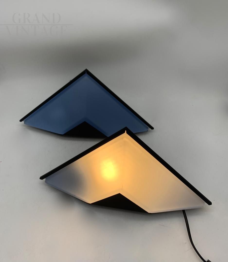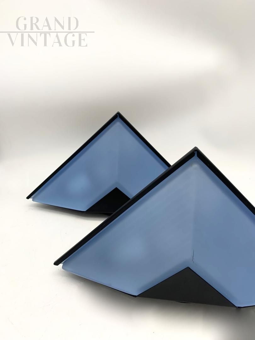 Pair of pyramid table lamps with geometric design. The structure has a shape that resembles an arrow pointing upwards or a pointed roof, with a central hollow towards the bottom; Sandblasted ble glass, which diffuses the light in a soft and uniform way. The sandblasting of the glass and the sculptural shape make it more than a simple source of light: it is a true luminous work of art. Metal frame. Each lamp Has a lamp holder and 14 ; original and functioning electrical system.