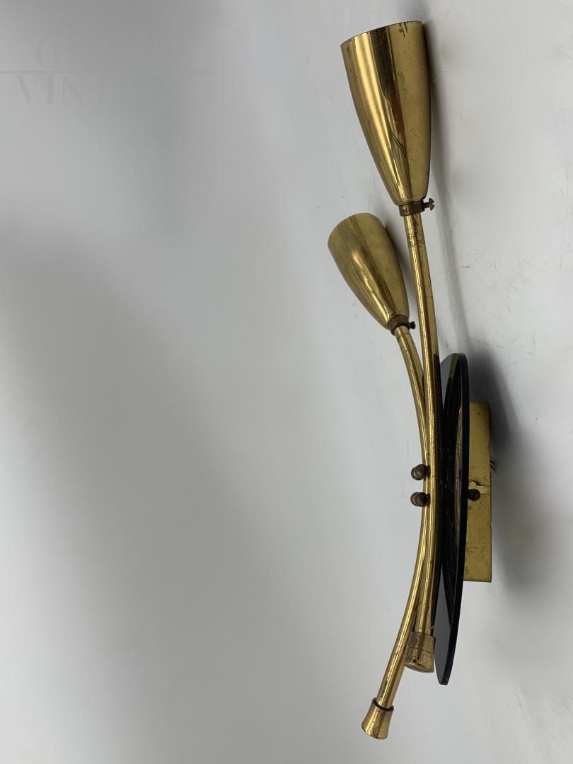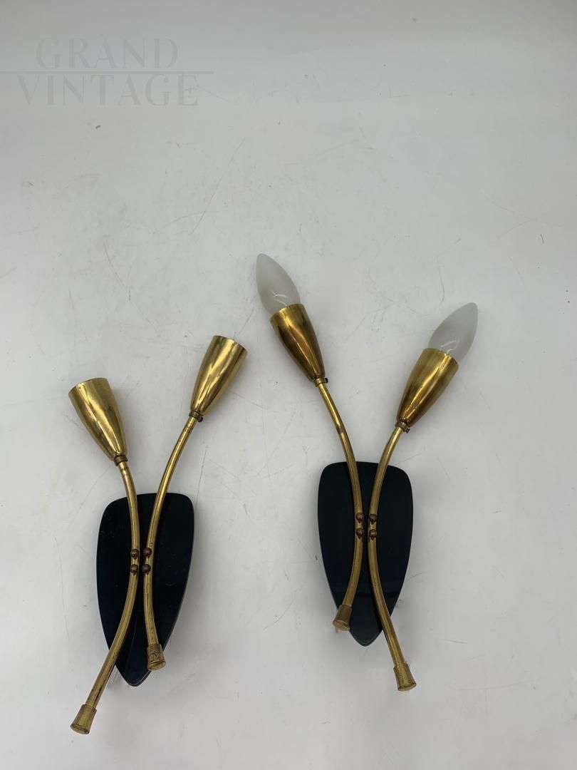 Pair of vintage brass wall lights with black bakelite base, Italy circa 1950s. Each lamp has two sockets for E14 type bulbs, working with a new electrical system. If desired, you can use LED bulbs.