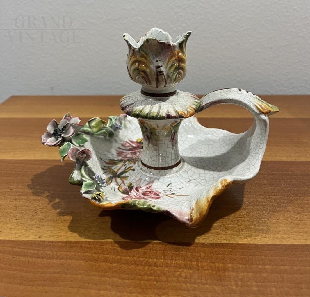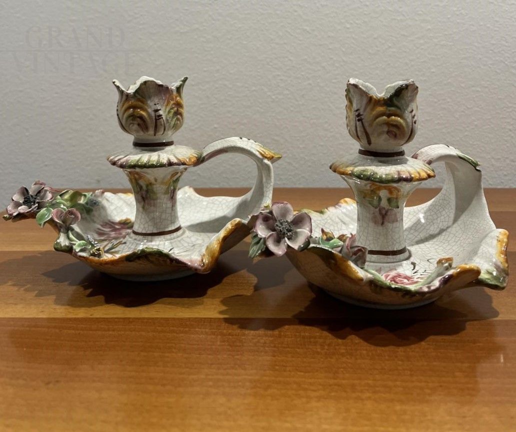 Pair of vintage ceramic candlesticks by Carpié Nove Bassano, 1960s, decorated with floral motifs. Items in excellent condition.