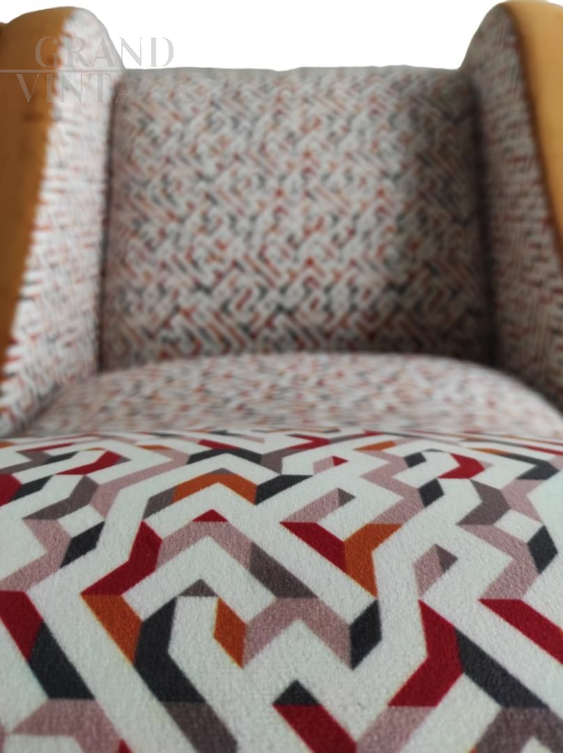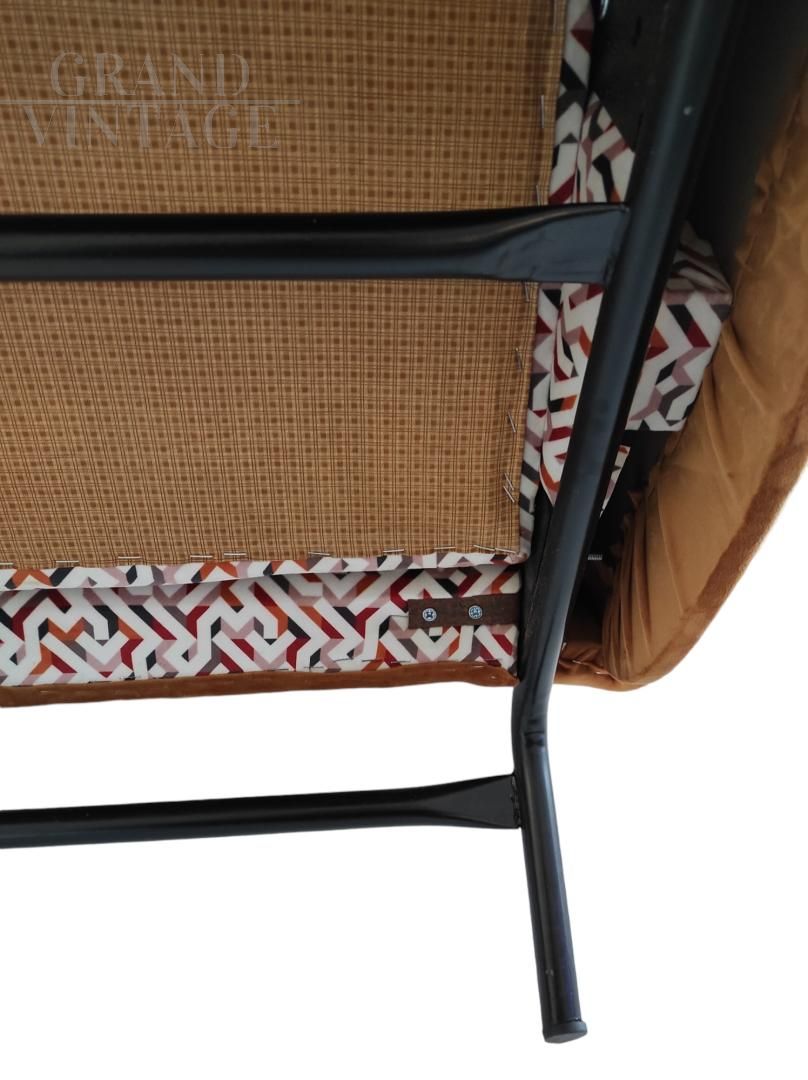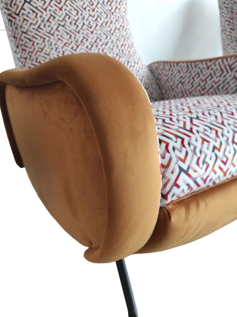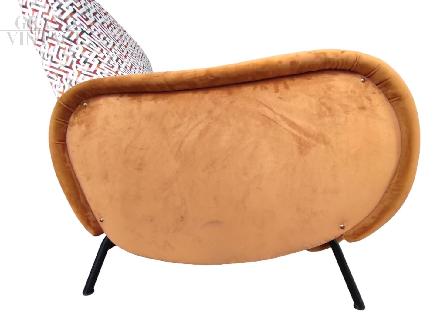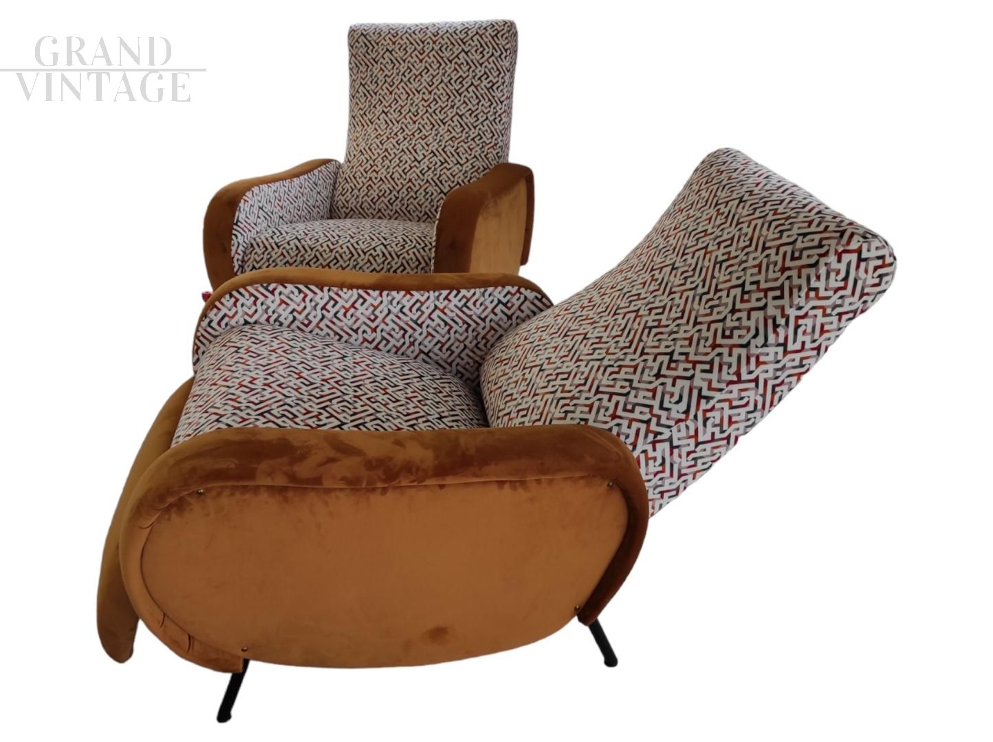 Pair of comfortable 1960s reclining armchairs reupholstered in cognac-coloured and patterned velvet fabric, in like-new condition.