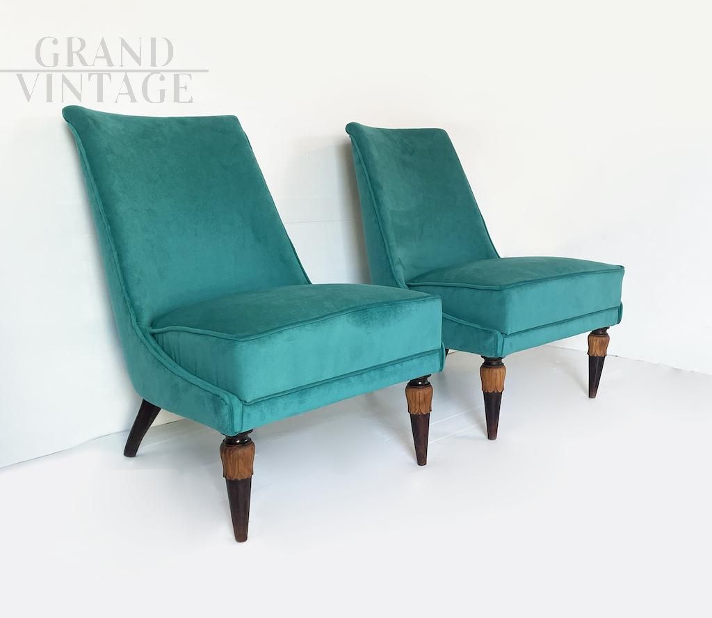 Particular pair of vintage armchairs with original beech structure and new upholstery in teal velvet, Italian mid-century modern design from the 70s.