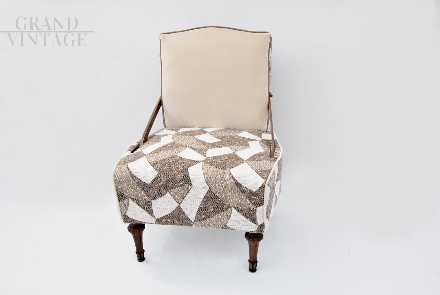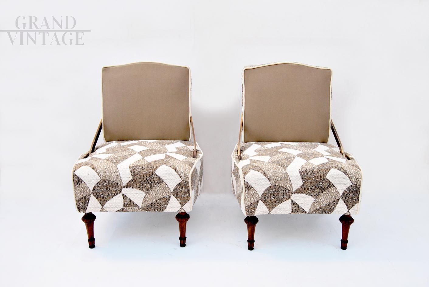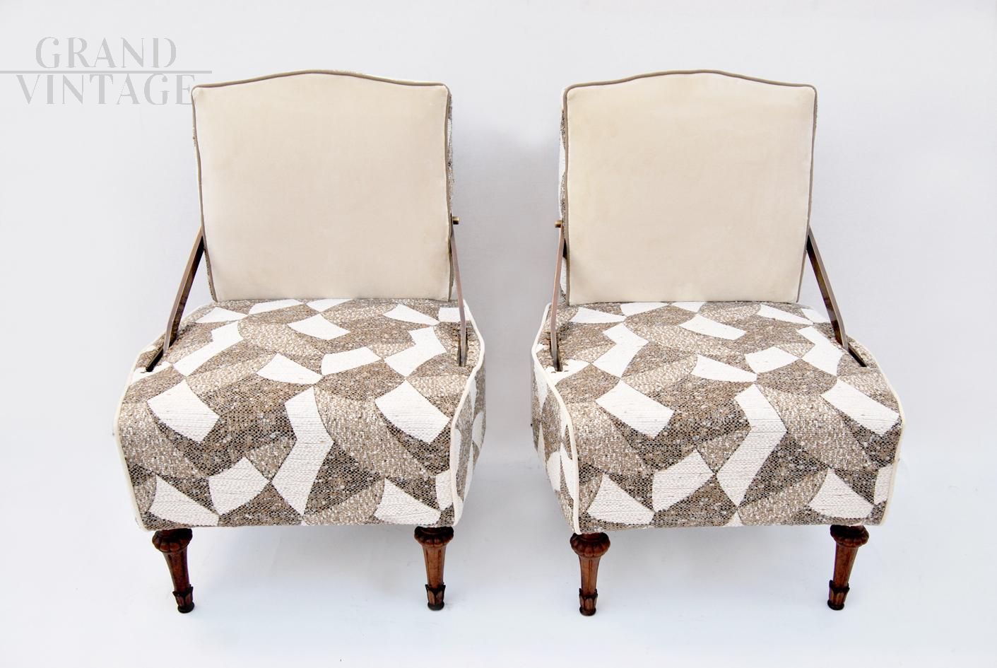 Very rare pair of vintage armchairs dating back to the 1940s. The peculiarity of these armchairs, produced in Italy, is that they can arrange the backrest in two positions via an internal mechanism made up of side bars and a visible brass release button. The wooden structure is completely original and restored; the padding has been redone, as has the fine cotton covering, with a backrest in two matching colours. The conditions are like new.