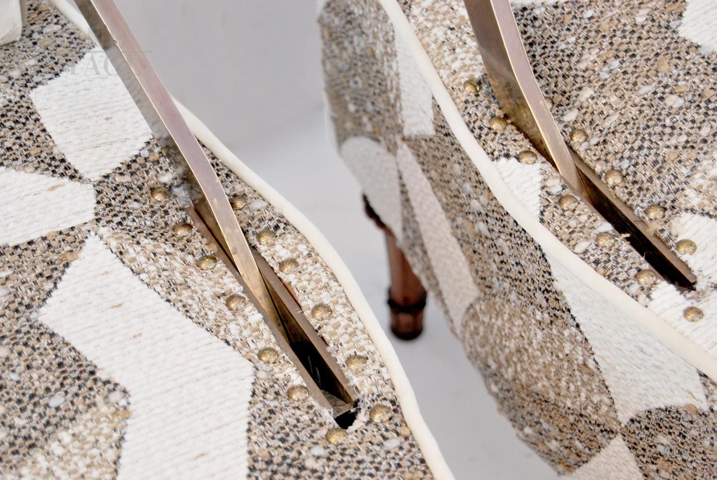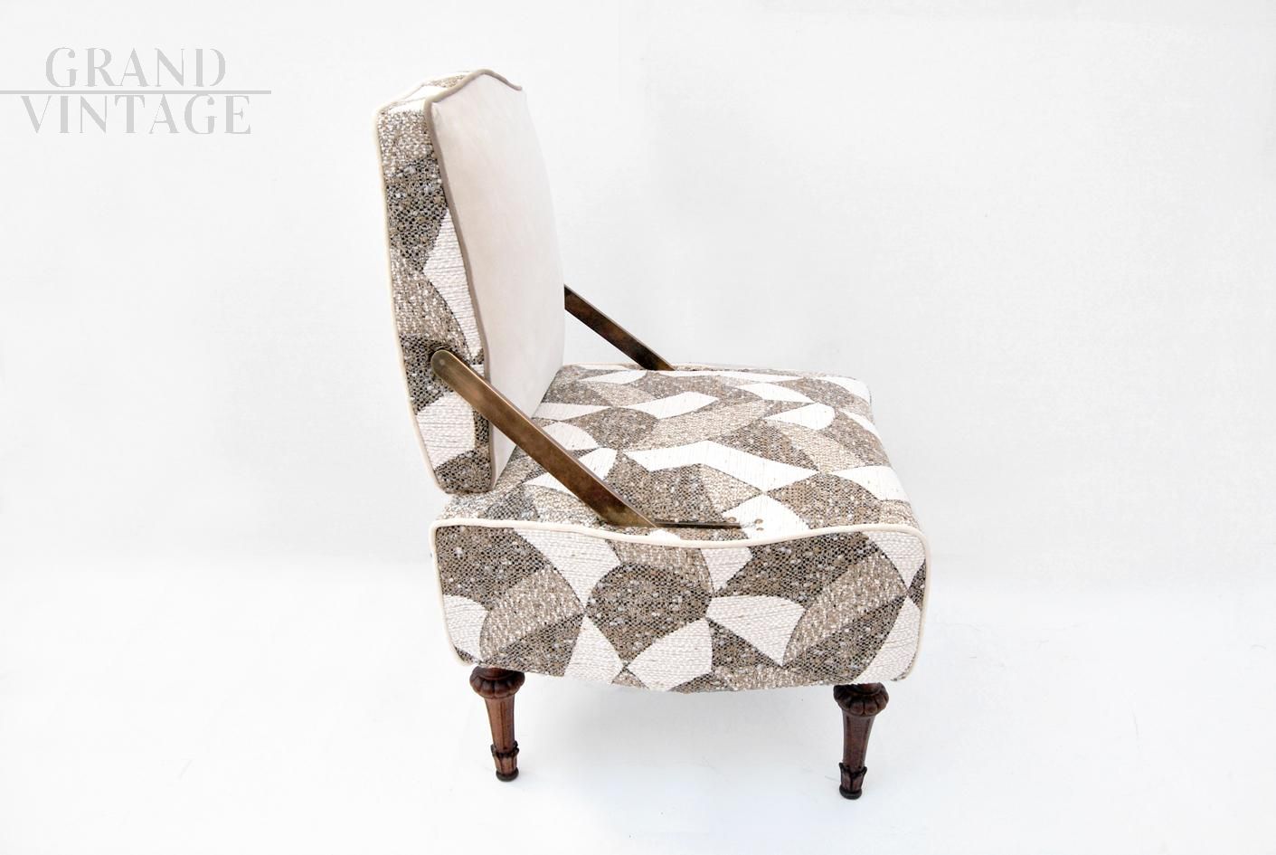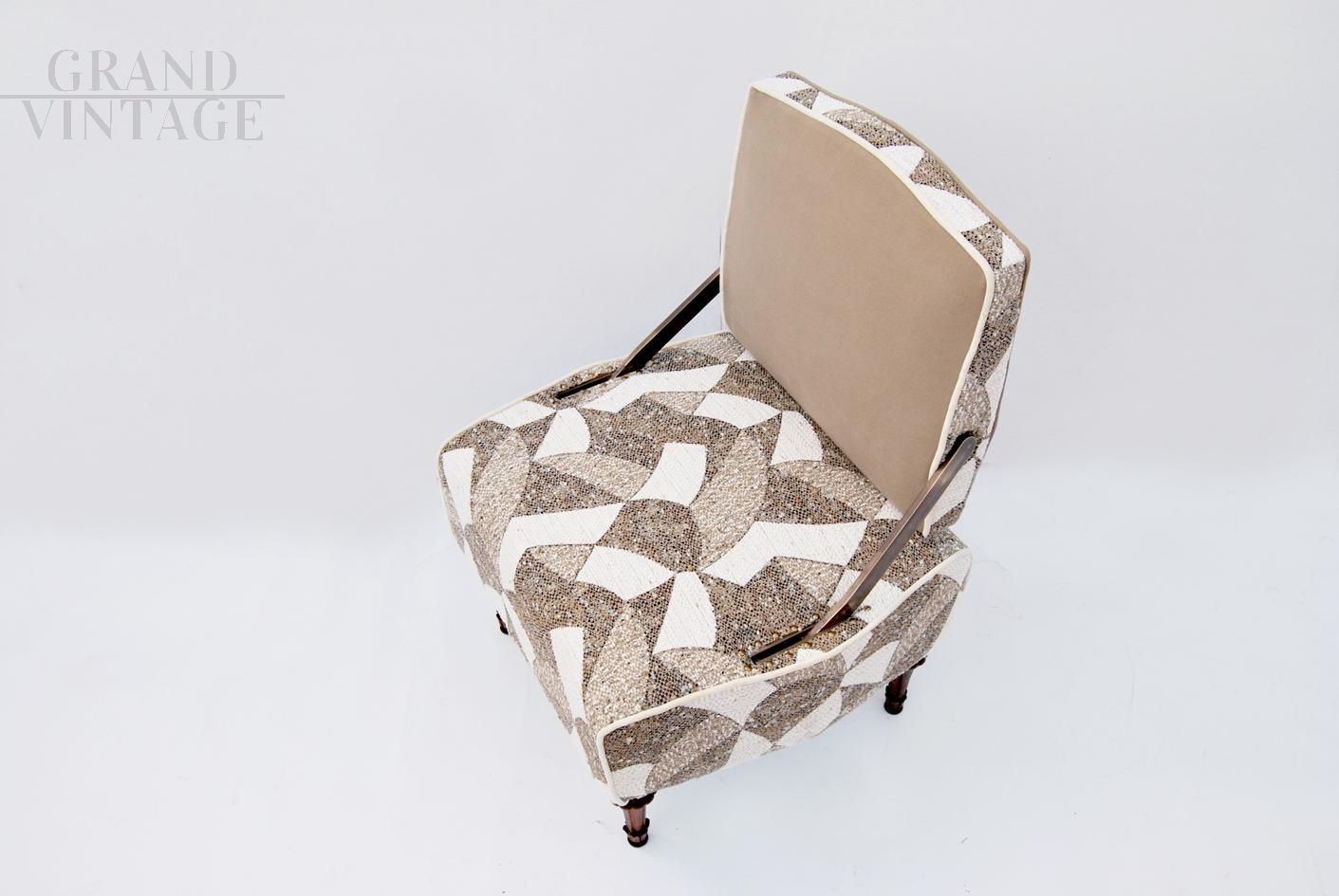 Very rare pair of vintage armchairs dating back to the 1940s. The peculiarity of these armchairs, produced in Italy, is that they can arrange the backrest in two positions via an internal mechanism made up of side bars and a visible brass release button. The wooden structure is completely original and restored; the padding has been redone, as has the fine cotton covering, with a backrest in two matching colours. The conditions are like new.