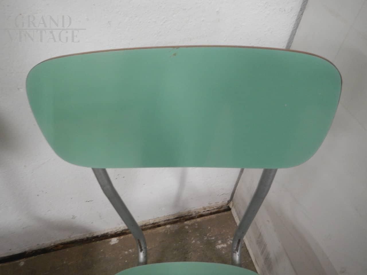 Pair of vintage green formica dining chairs with gray painted metal structure, Italy 1960s. In good condition, with some flaws highlighted in the photos. The seat measures 45 cm in height.