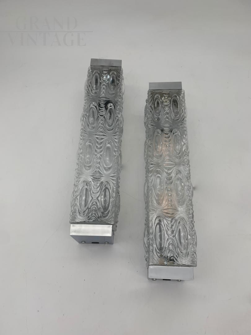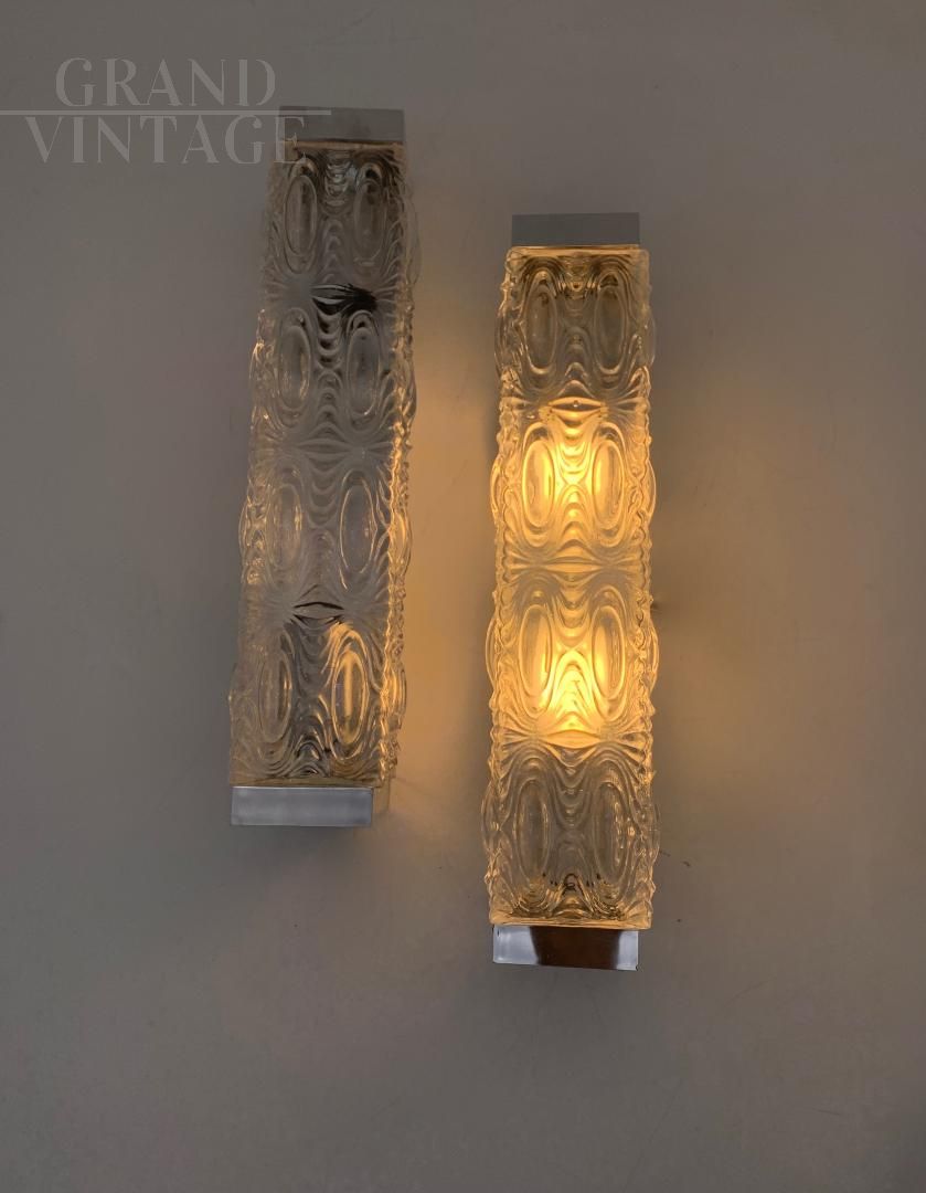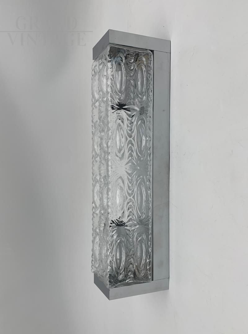 Pair of classic vintage vertical wall lights in Murano glass worked in relief and printed on a plate, with chromed plastic structure, Italy, 1970s. The two lamps are old stock, therefore they have never been used. Each lamp has two sockets for E 14 type bulbs. The chrome plating is excellent. Few signs of aging despite its age. The glass is in good condition, in transparent crystal effect color.