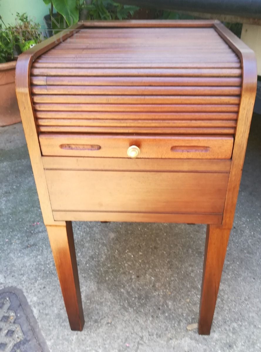 Pair of vintage office archive cabinets with roller shutter closure, made in the 20th century, in mahogany wood, inside the compartment there are dividers that can be removed or changed in place. The cabinets have been restored and are in excellent condition.