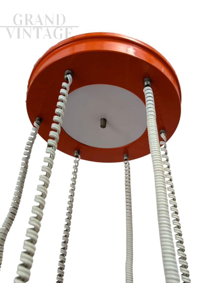 Pair of vintage orange glass pendant lamps in space age style, Italy 1970s in excellent condition, no particular signs of wear. As can be seen in the photo, one chandelier is composed of 5 lights and the other of 3.