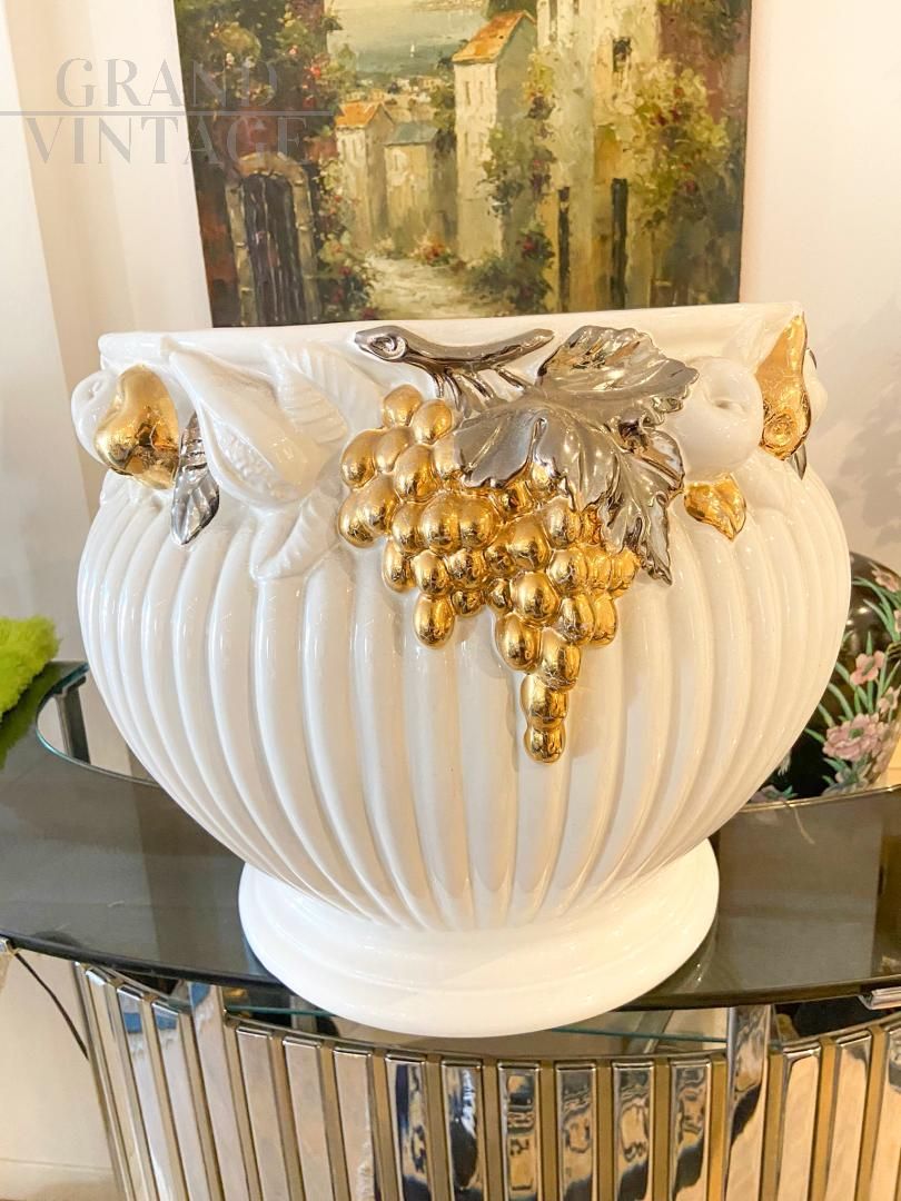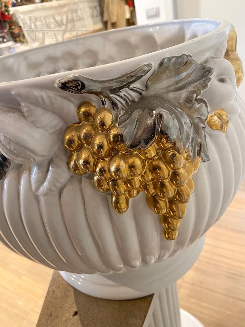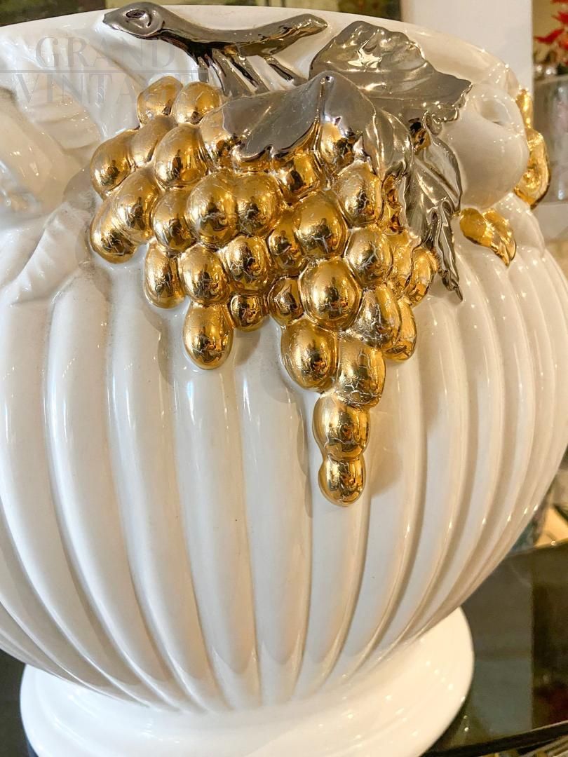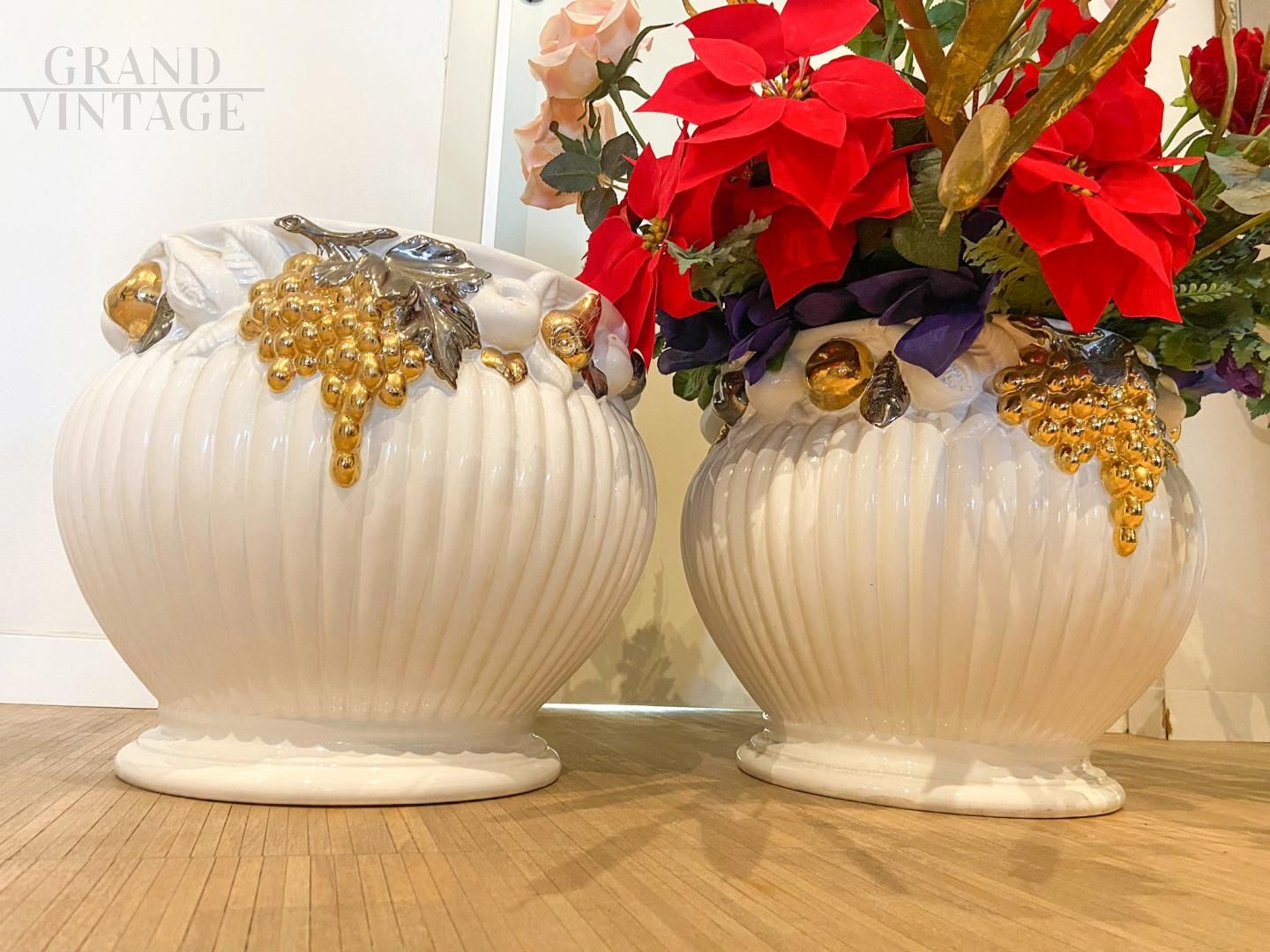 Pair of vintage white lacquered ceramic vases with gold grape decorations, Italy 1970s, in excellent condition, very spectacular.
