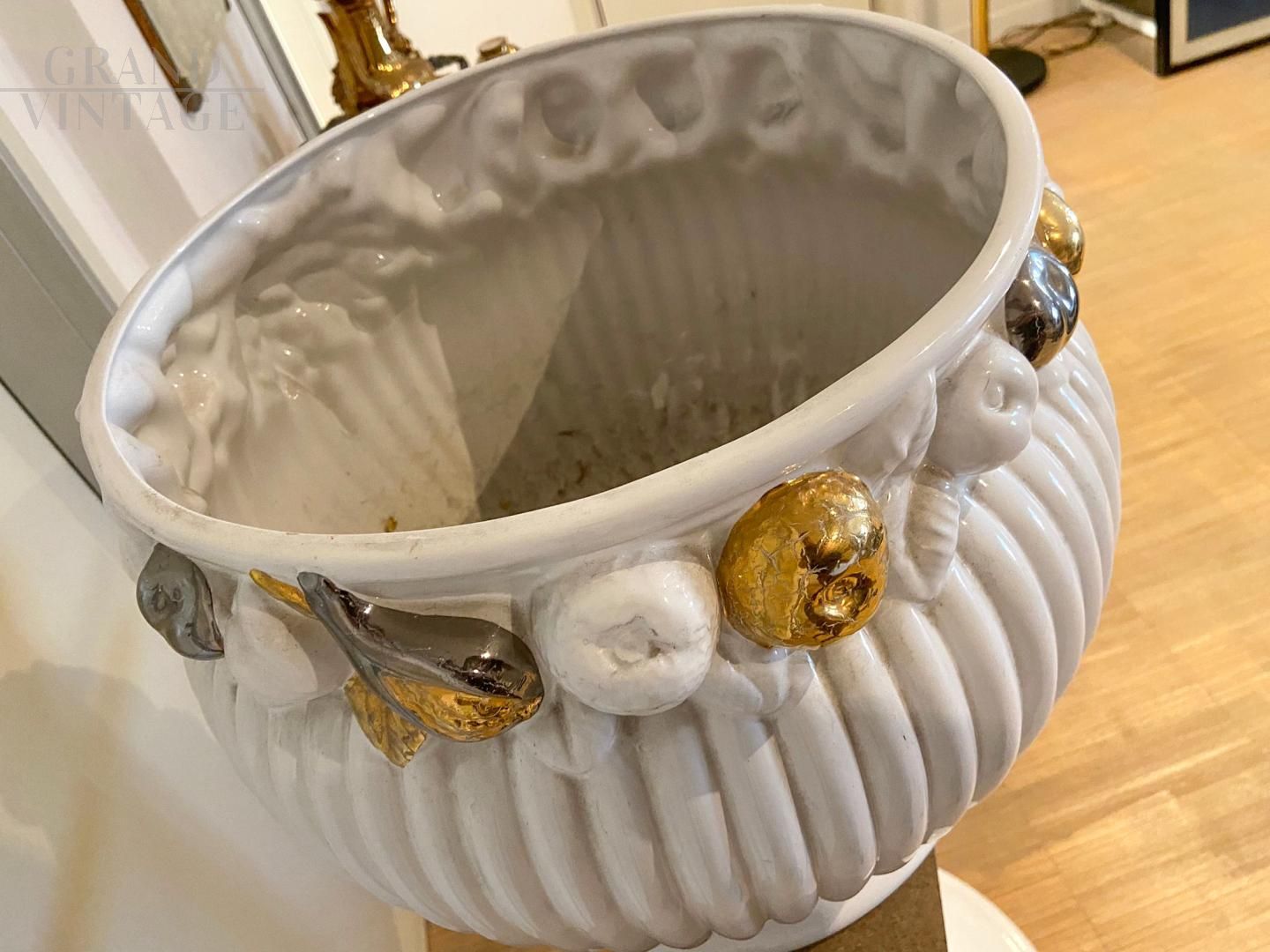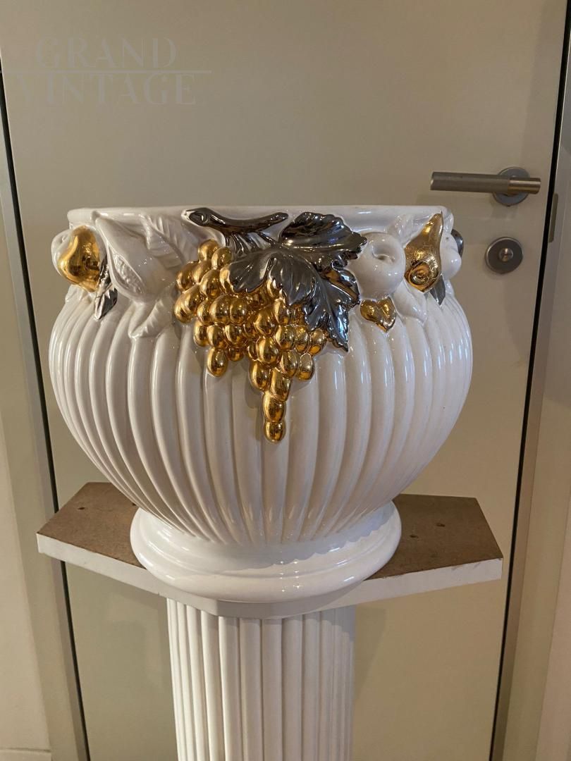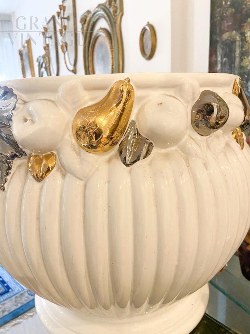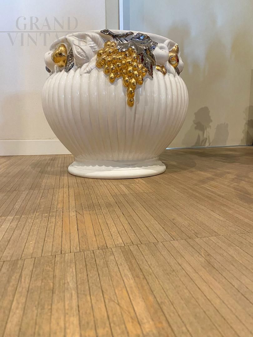 Pair of vintage white lacquered ceramic vases with gold grape decorations, Italy 1970s, in excellent condition, very spectacular.