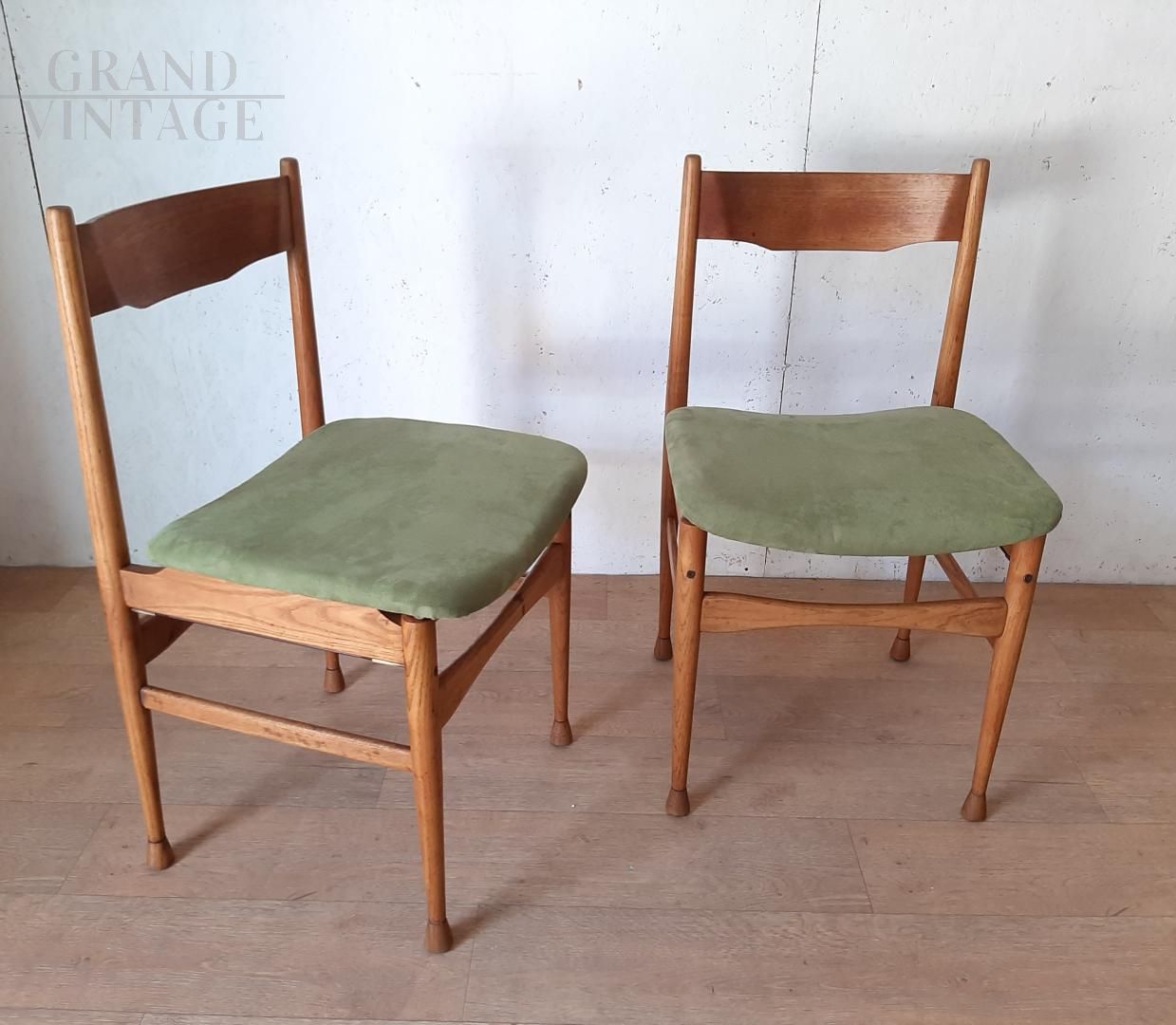 Pair of vintage Scandinavian style chairs from the 1960s in beech with green fabric seat redone. They show natural signs of aging as shown in the photos,
