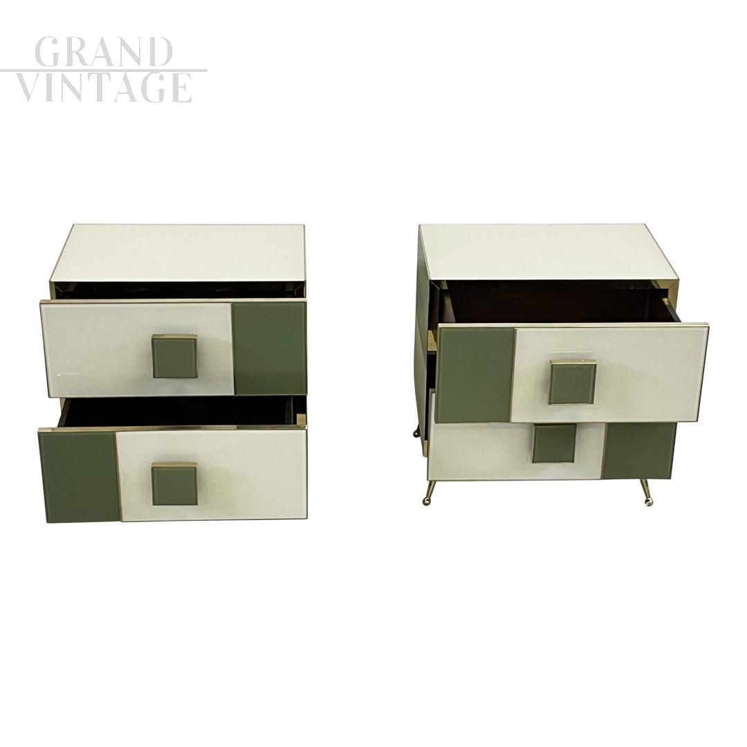 Pair of vintage style bedside tables with two drawers, entirely handmade in the 2000s, with wooden structure covered with white and green glass, handle profiles and feet are in golden brass. Dimensions: width 59.5 cm, depth 42 cm, height 62 cm.