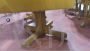 Pair of 70's swivel armchairs in ocher yellow skai, adjustable in height, with walnut wood legs and brass feet. In good condition, with signs of wear clearly visible in the photos.