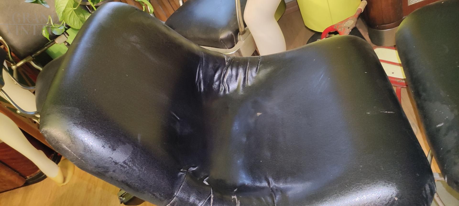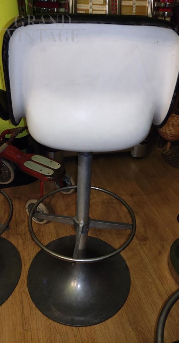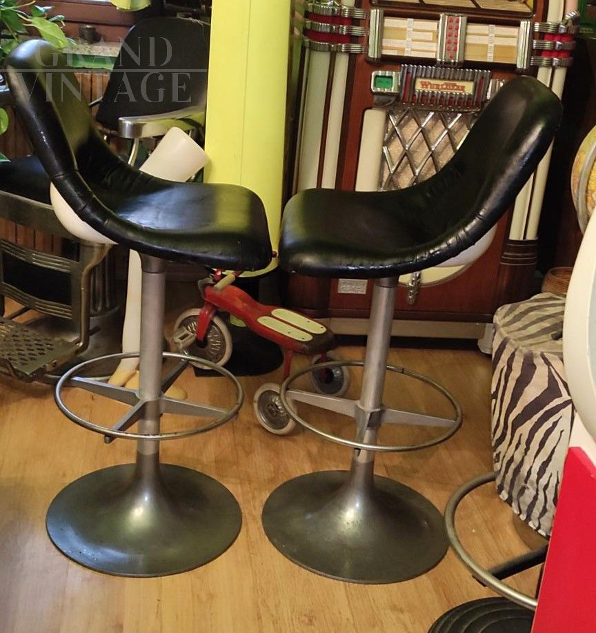 Pair of high vintage Tulip model stools padded and covered with black imitation leather, with plastic structure on steel base, complete with footrest. Good general state of conservation, presents the natural signs of aging both in the steel and in the coating, as shown in the photo.