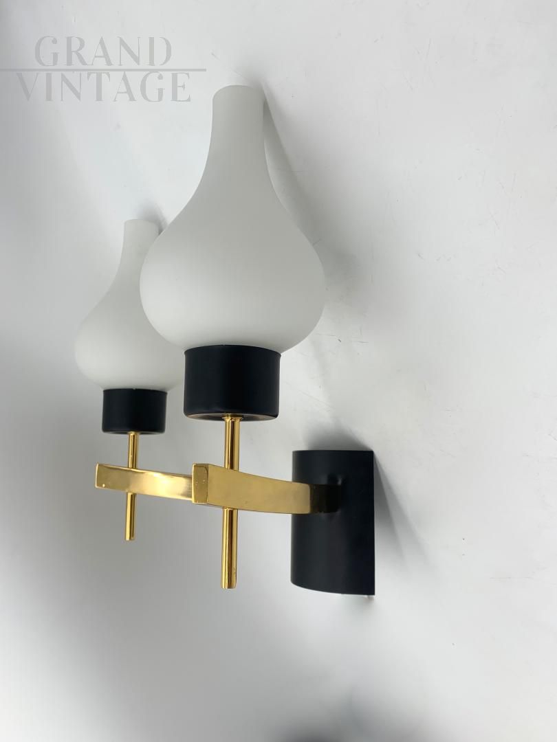 Very particular pair of appliques wall lights attributed to Stilnovo, each with two light points in milky white glass on a structure in brass and black lacquered iron. The wall lights are in excellent condition, with few natural signs of aging and with non-cracked glasses, and each has a newly redone electrical system with 2 E14 type light bulb connections. The glass parts can be removed from the structure for safer transport. Upon request, the lamps can be prepared for the American electrical system.