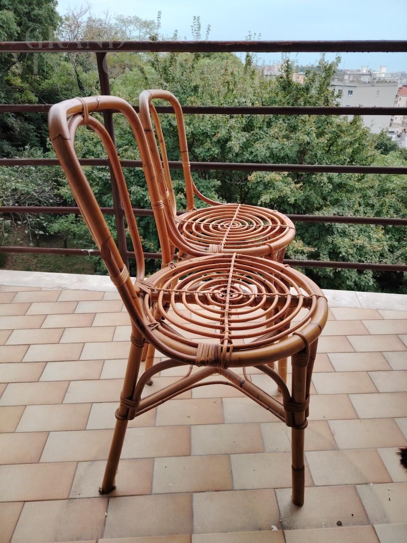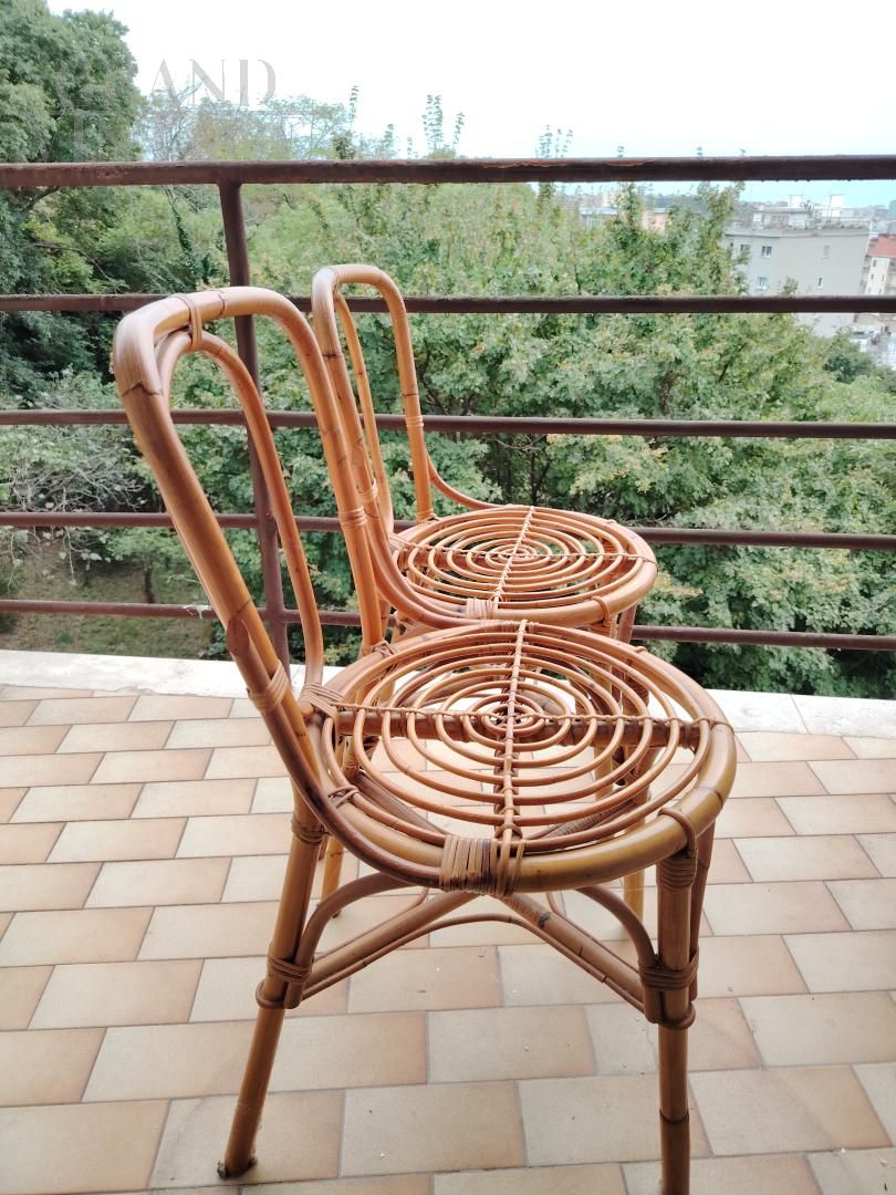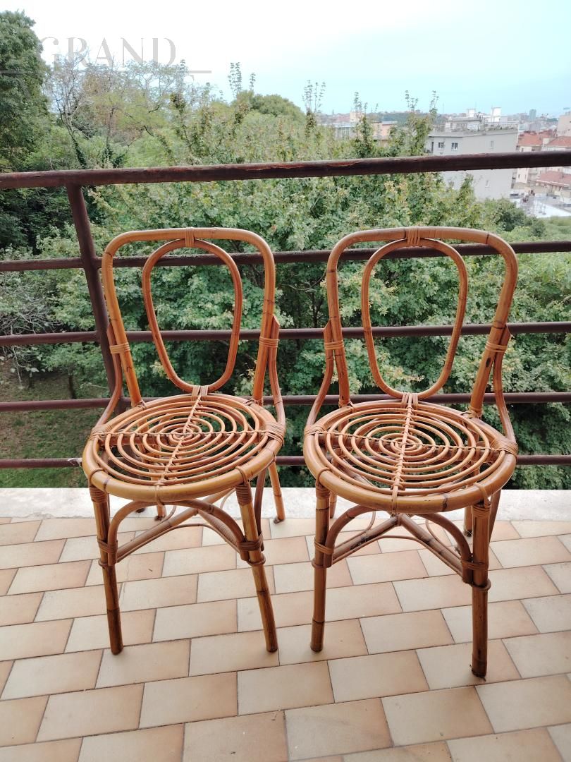 Pair of vintage bamboo and wicker chairs with distinctive spiral-woven seats.