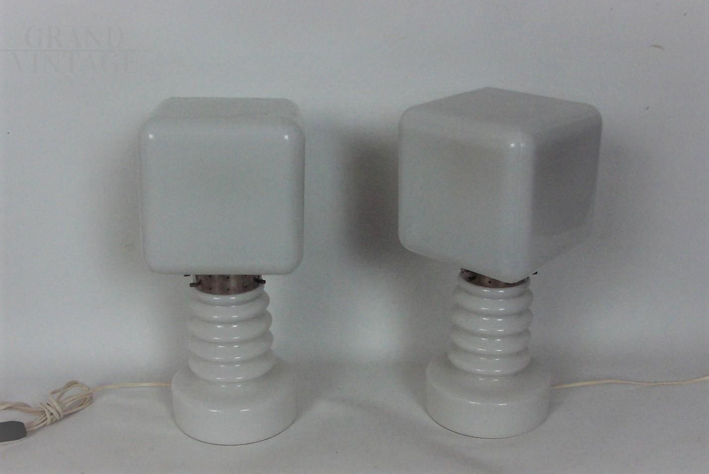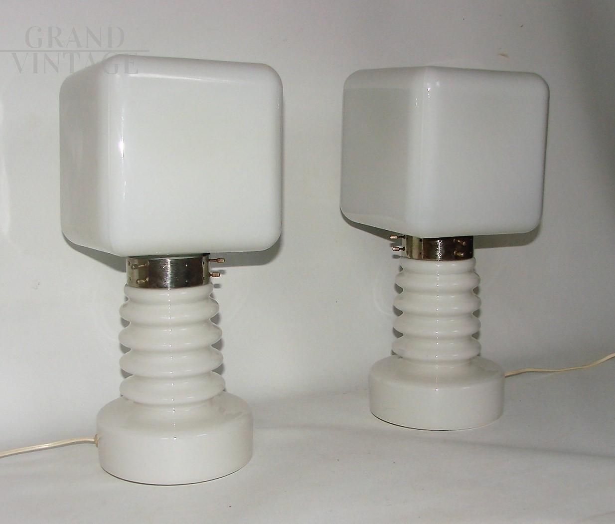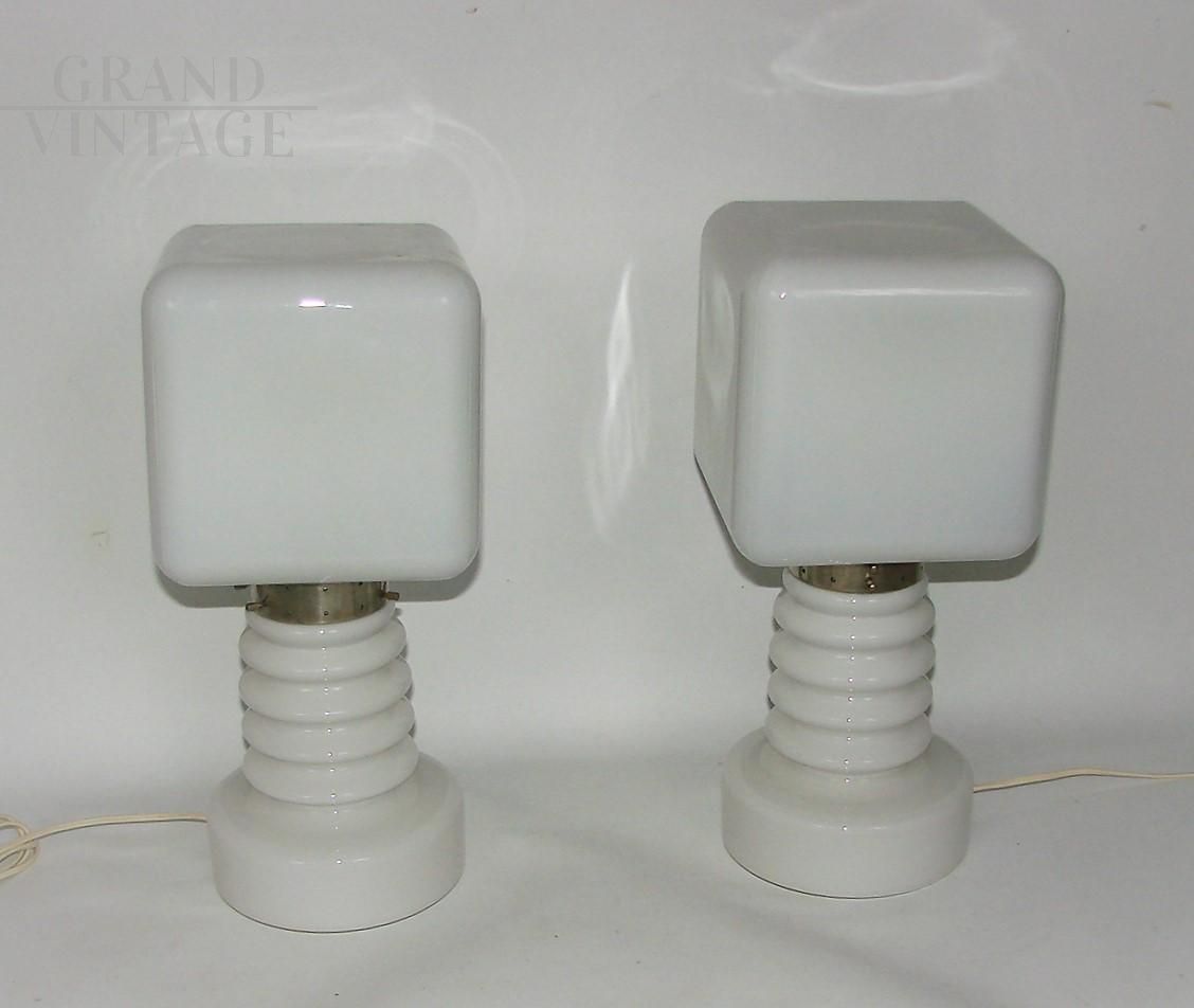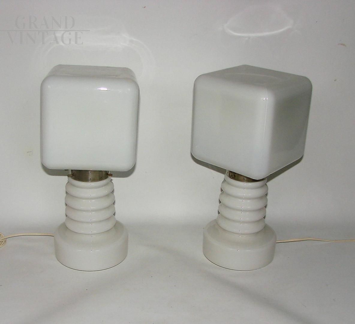 Pair of Vitropol lamps in white glass with classic screw structure and cube lampshade, Poland 1970s, in excellent condition. Lamps require E27 bulbs.