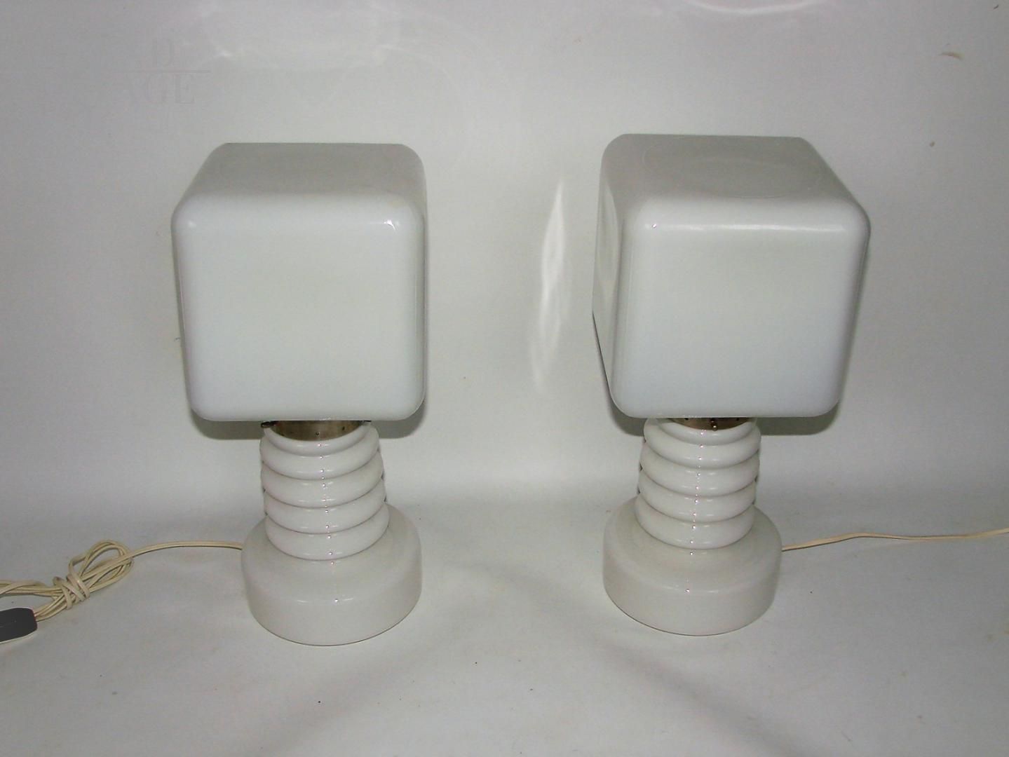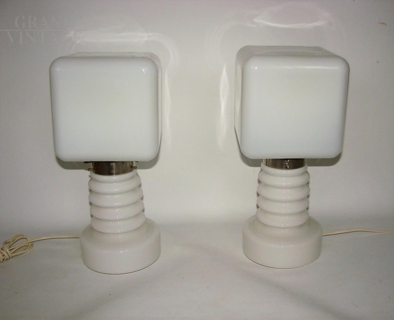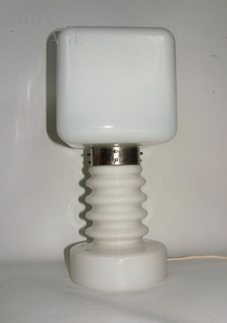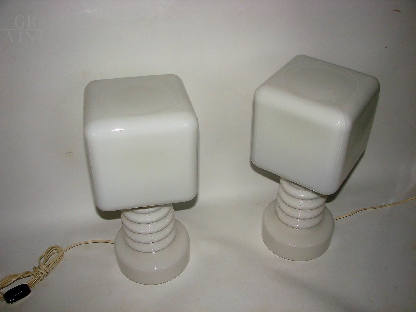 Pair of Vitropol lamps in white glass with classic screw structure and cube lampshade, Poland 1970s, in excellent condition. Lamps require E27 bulbs.
