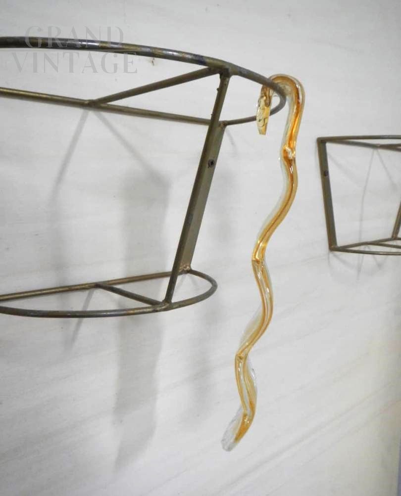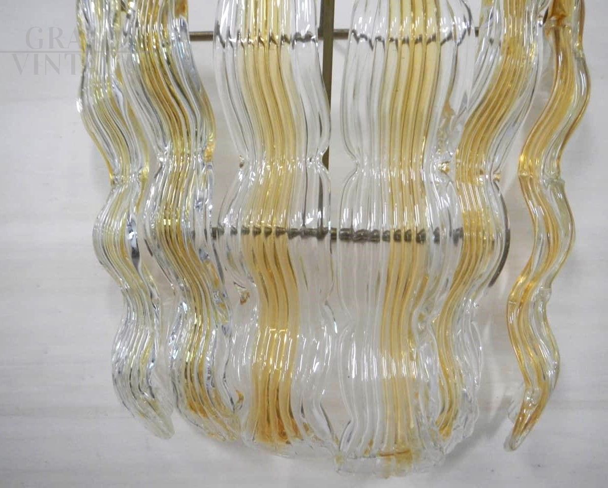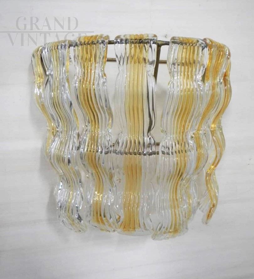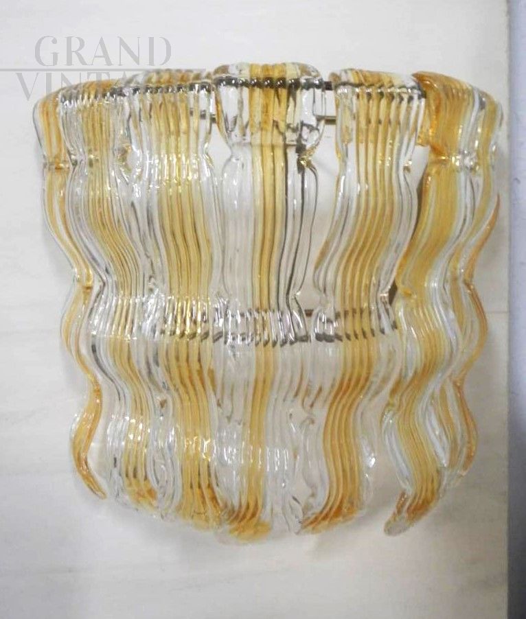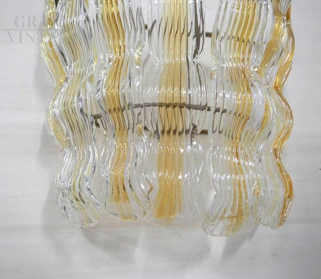 Pair of Murano glass wall lights with 8 hand-made corrugated glass plates with yellow color, with iron support to hang them.