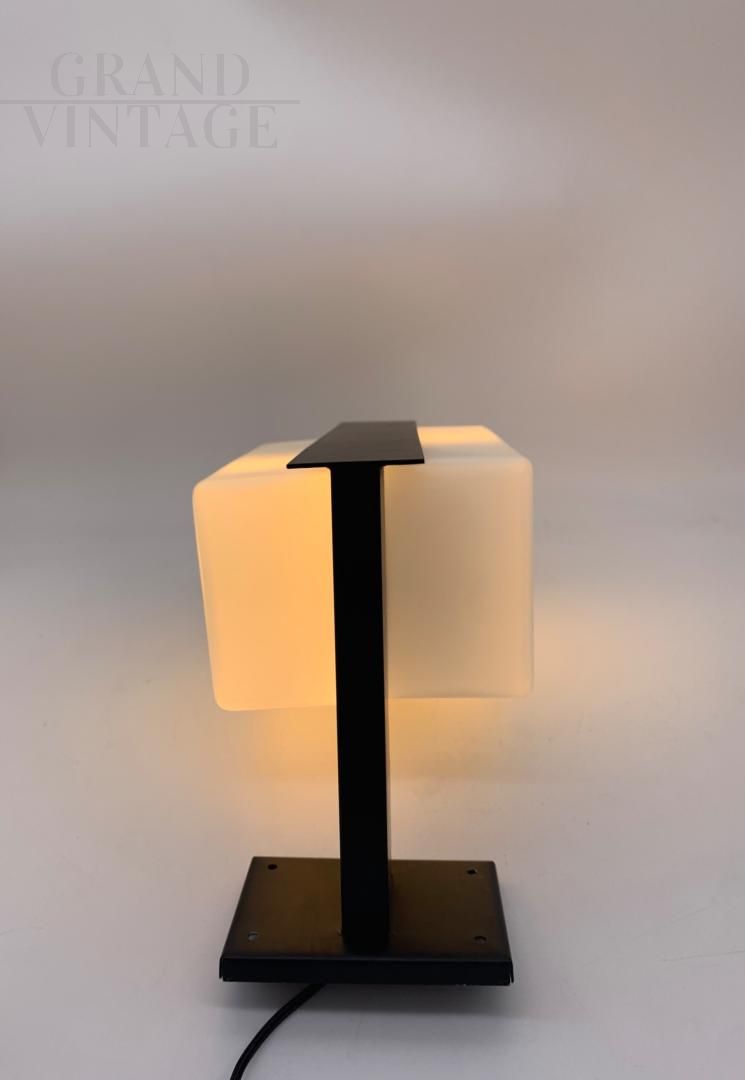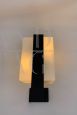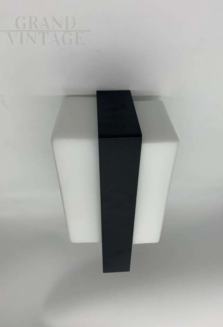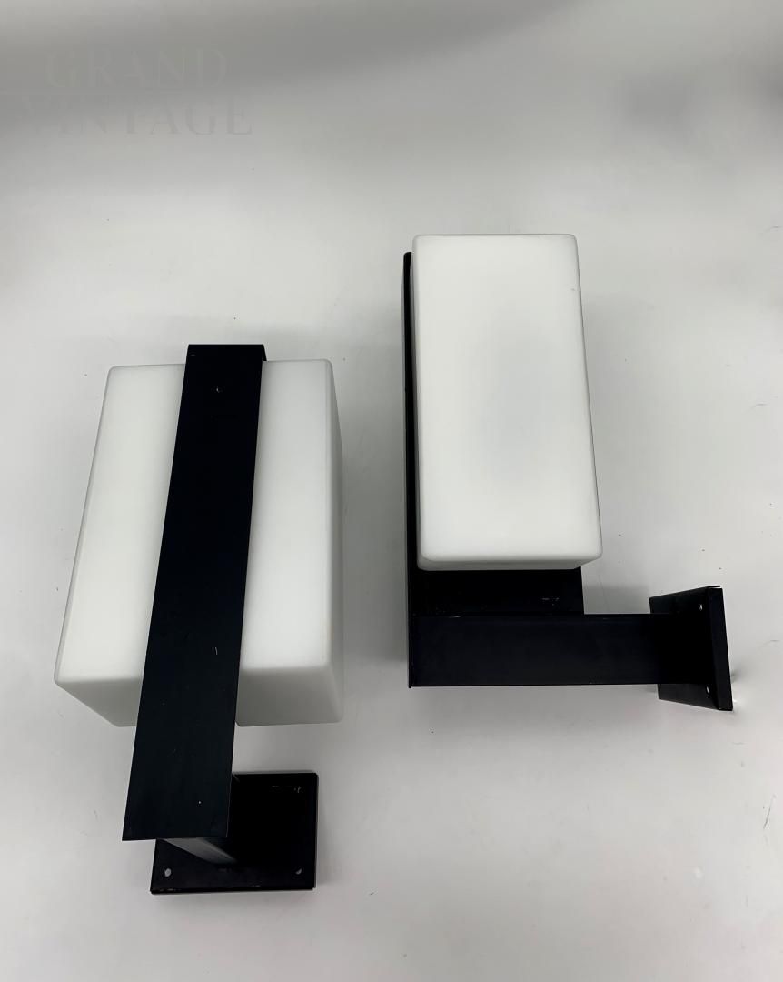 Fantastic pair of 1950s wall lights attributed to Stilnovo with milky white squared glass on a black lacquered iron structure, each wall light has two E14 bulb sockets, also suitable for the use of LED bulbs. Some signs of the time.