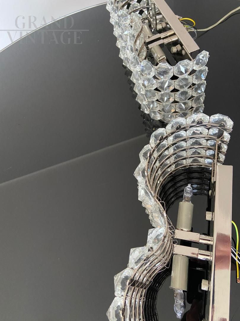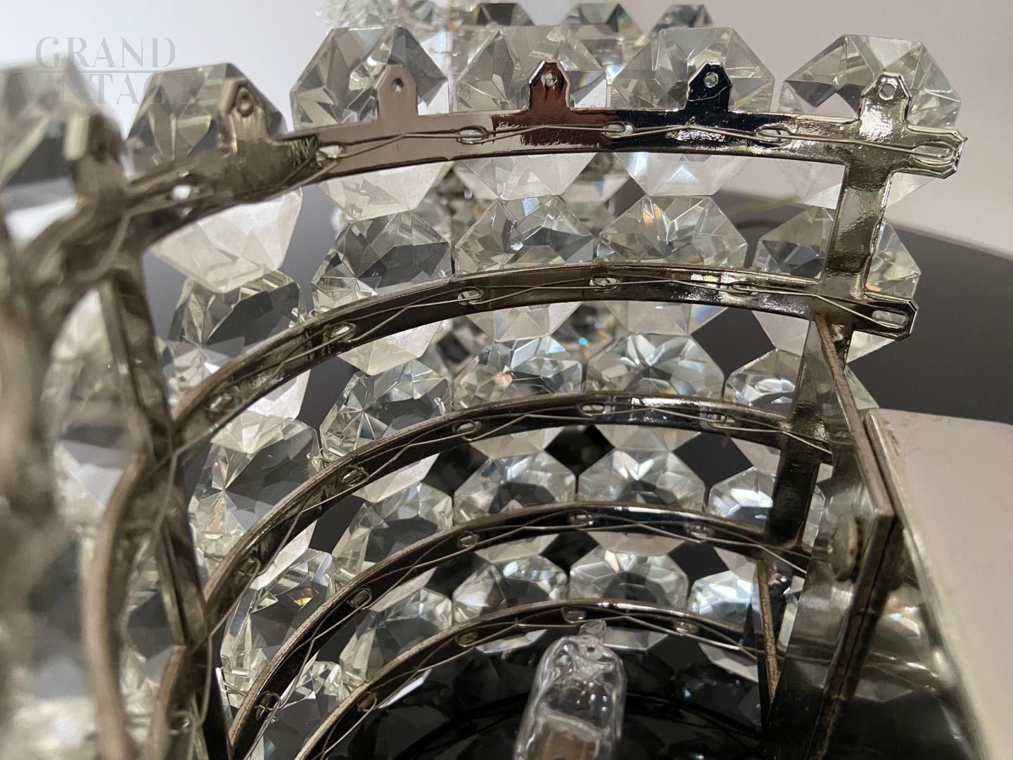 Pair of vintage wall lights appliques with octagonal faceted crystal drops, Italy 1980s. A light installation with a luxurious and elegant design, these wall lamps have a polished nickel finish, which, together with the faceted crystals, helps to create a very particular lighting effect.