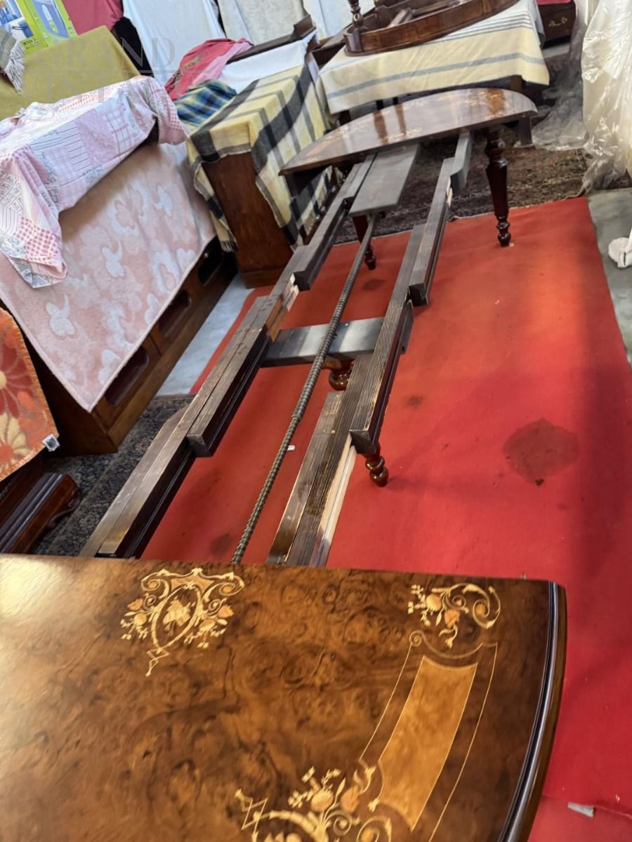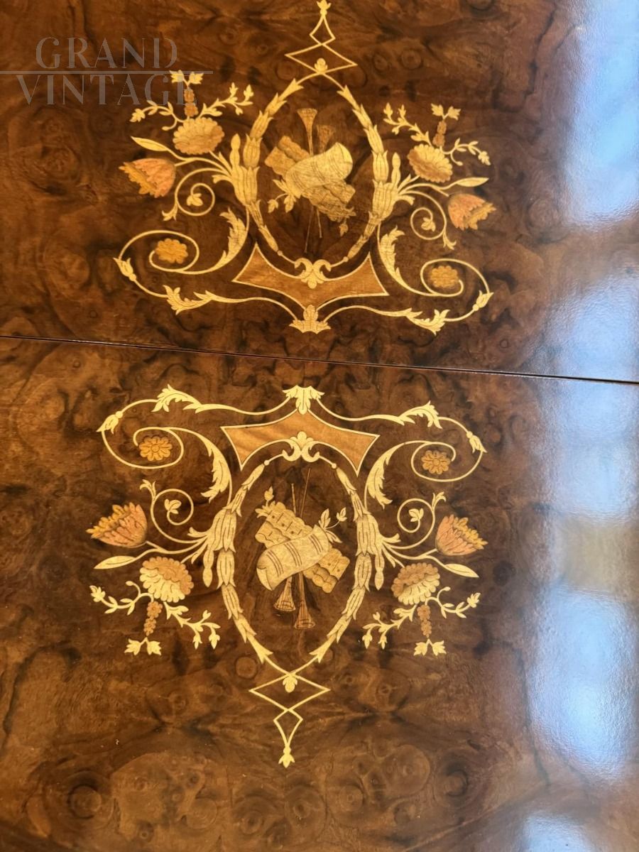 Palladian crank-extendable table with inlays of flowers and musical instruments