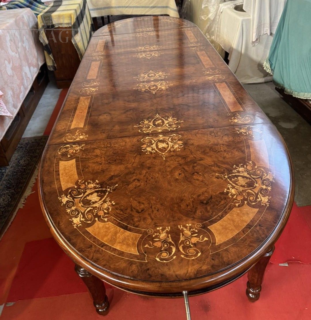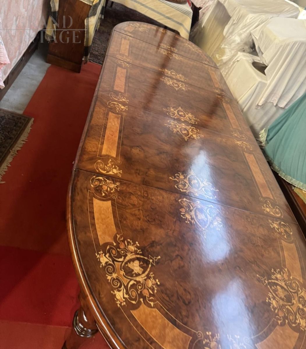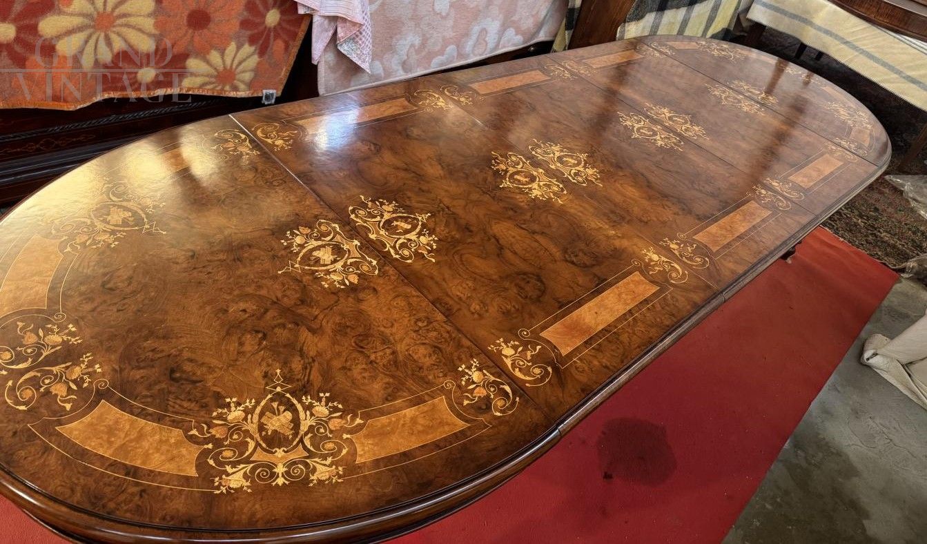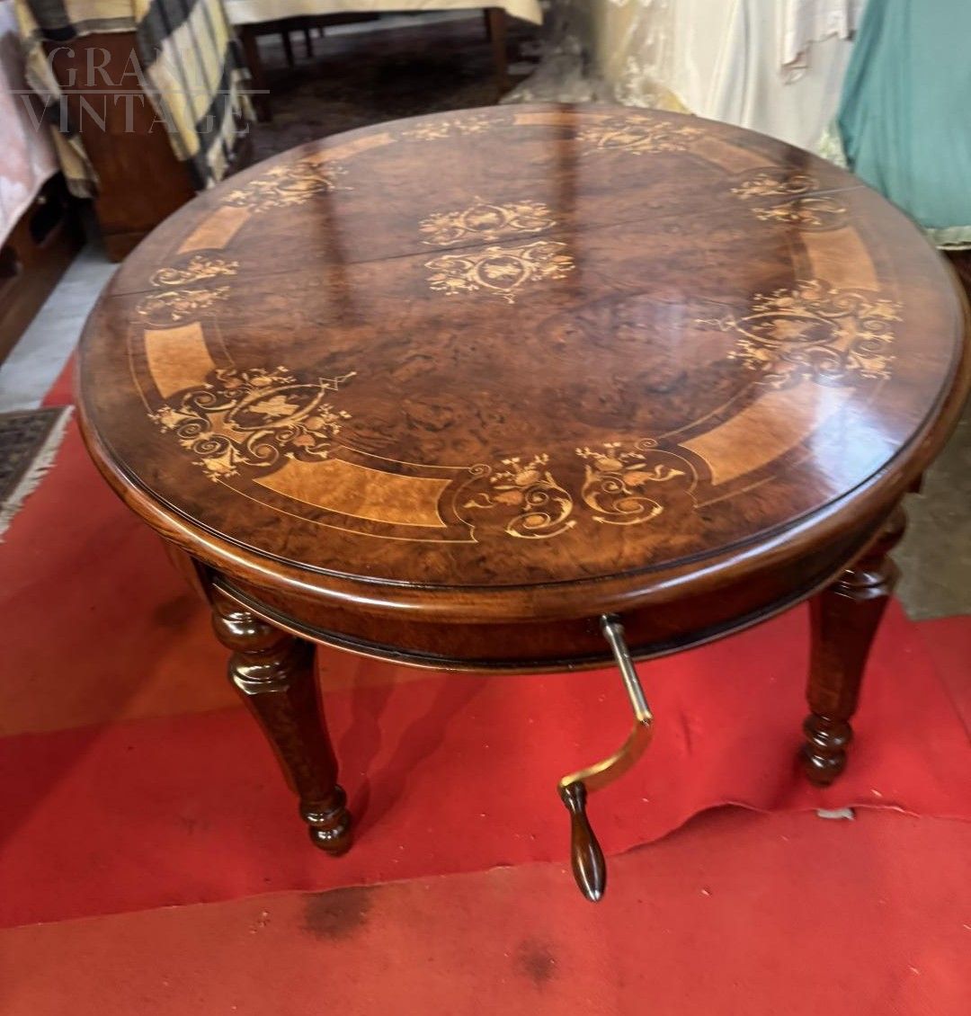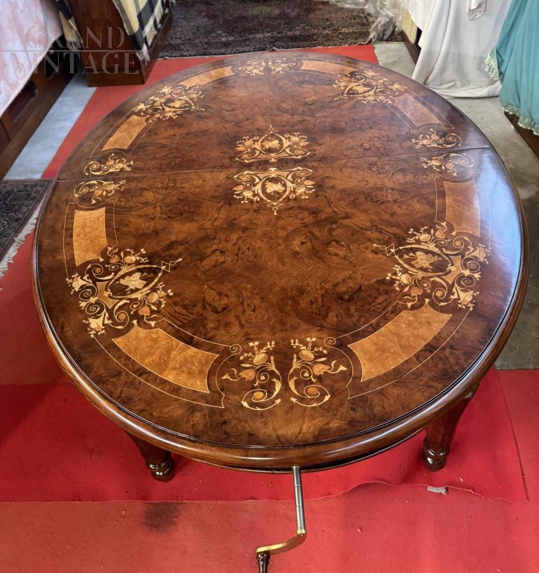 Stunning extendable crank-operated walnut table inlaid with floral motifs and carved maple, boxwood, rosewood, and violets. In perfect condition, it comes with three extension leaves, from a Palladian villa in the Veneto region.