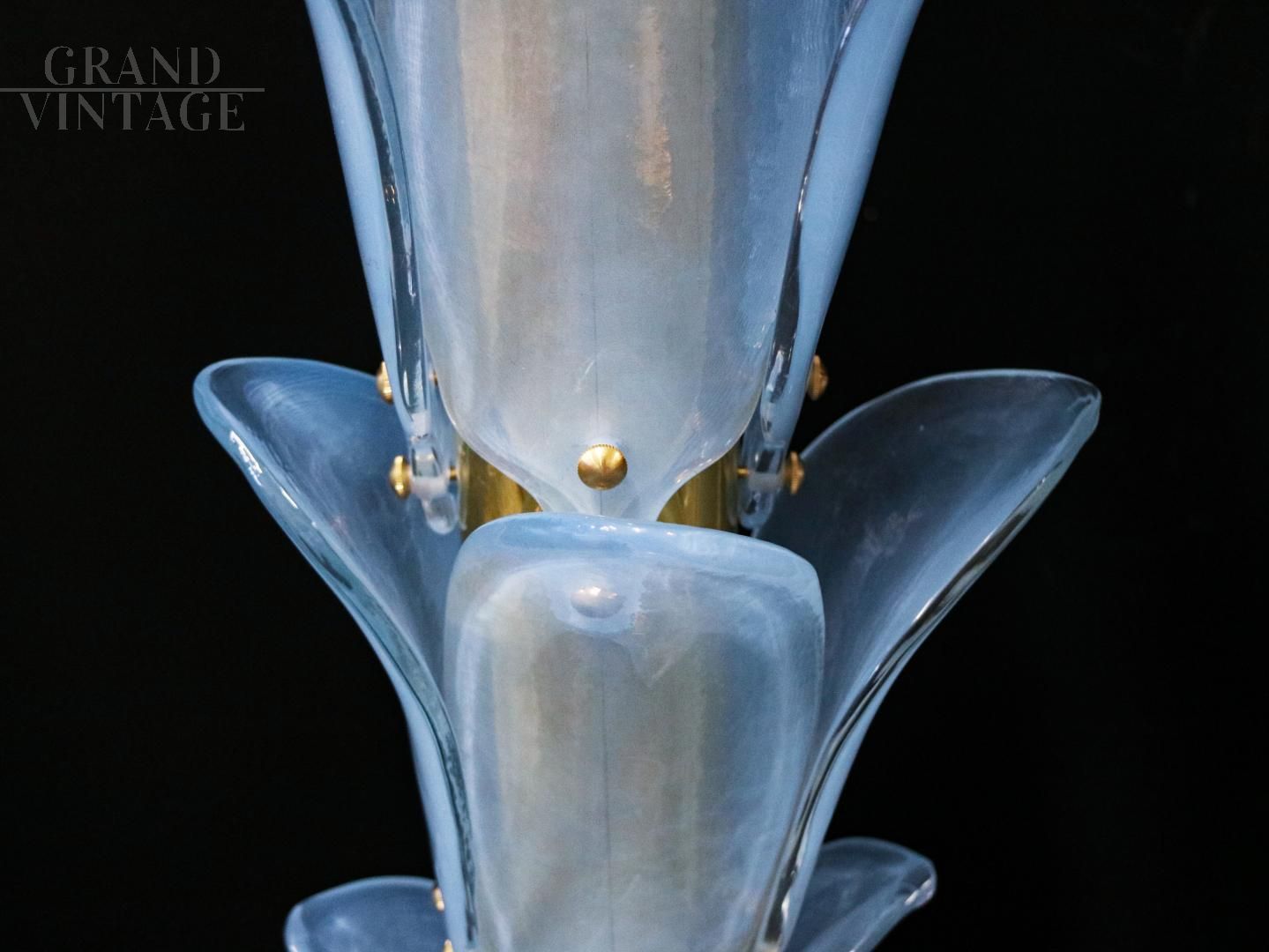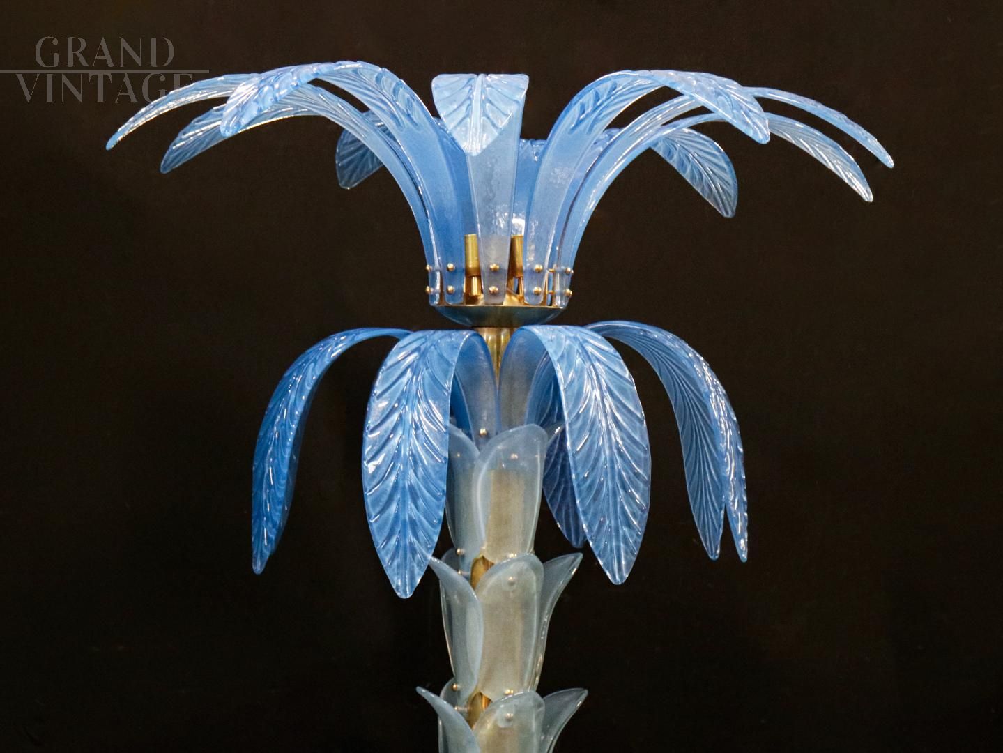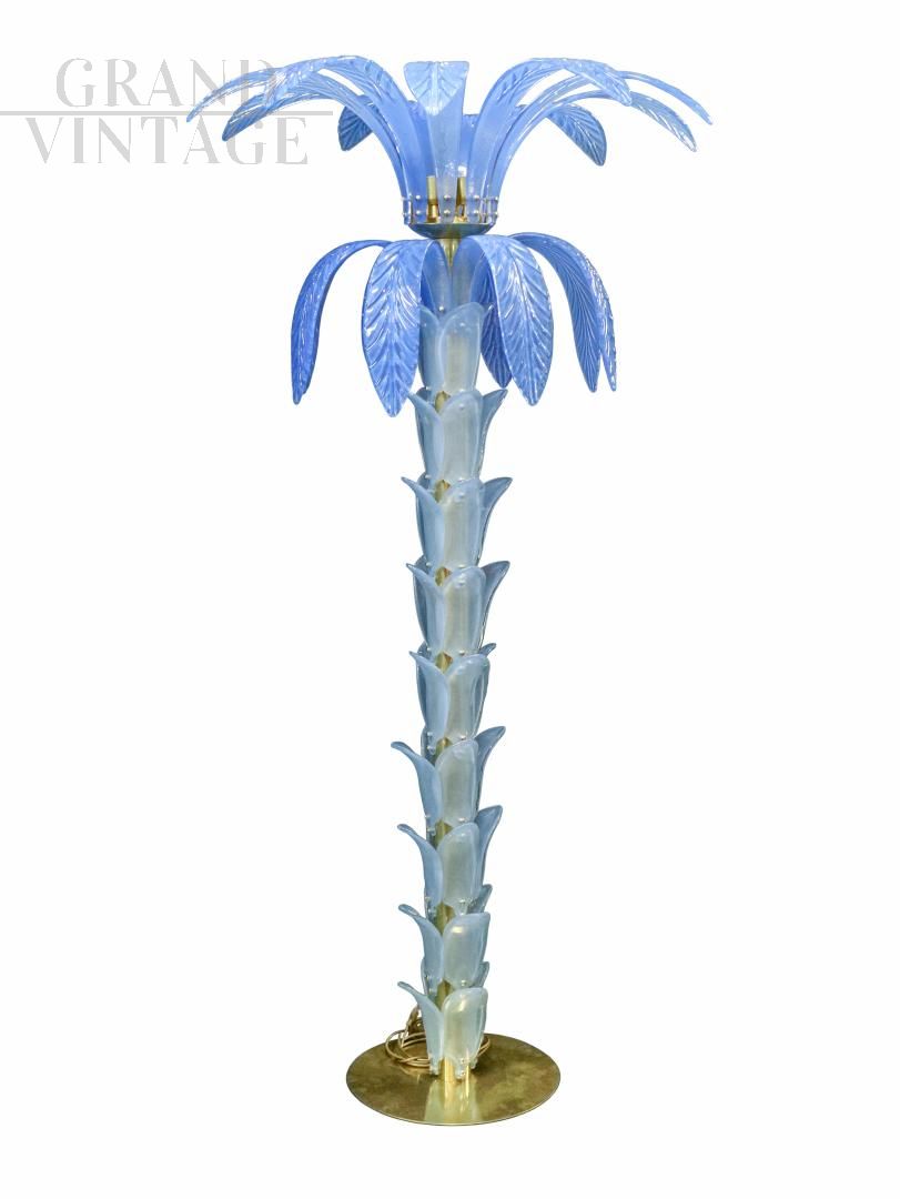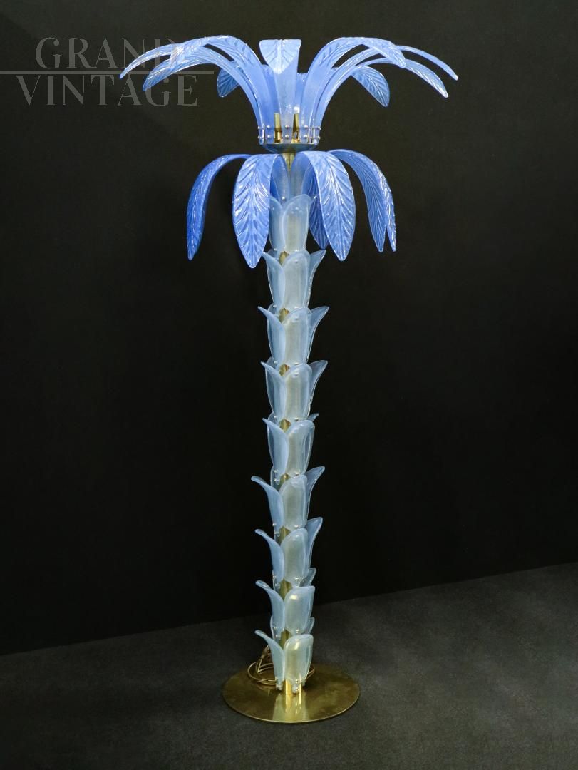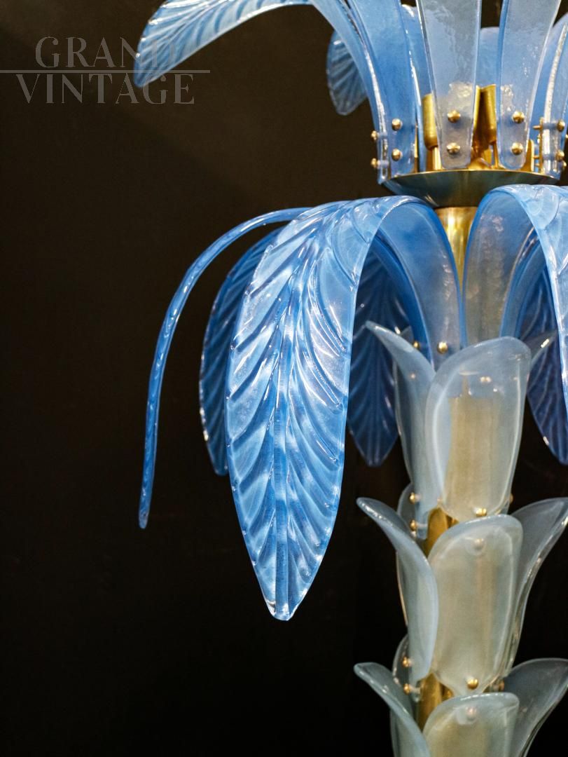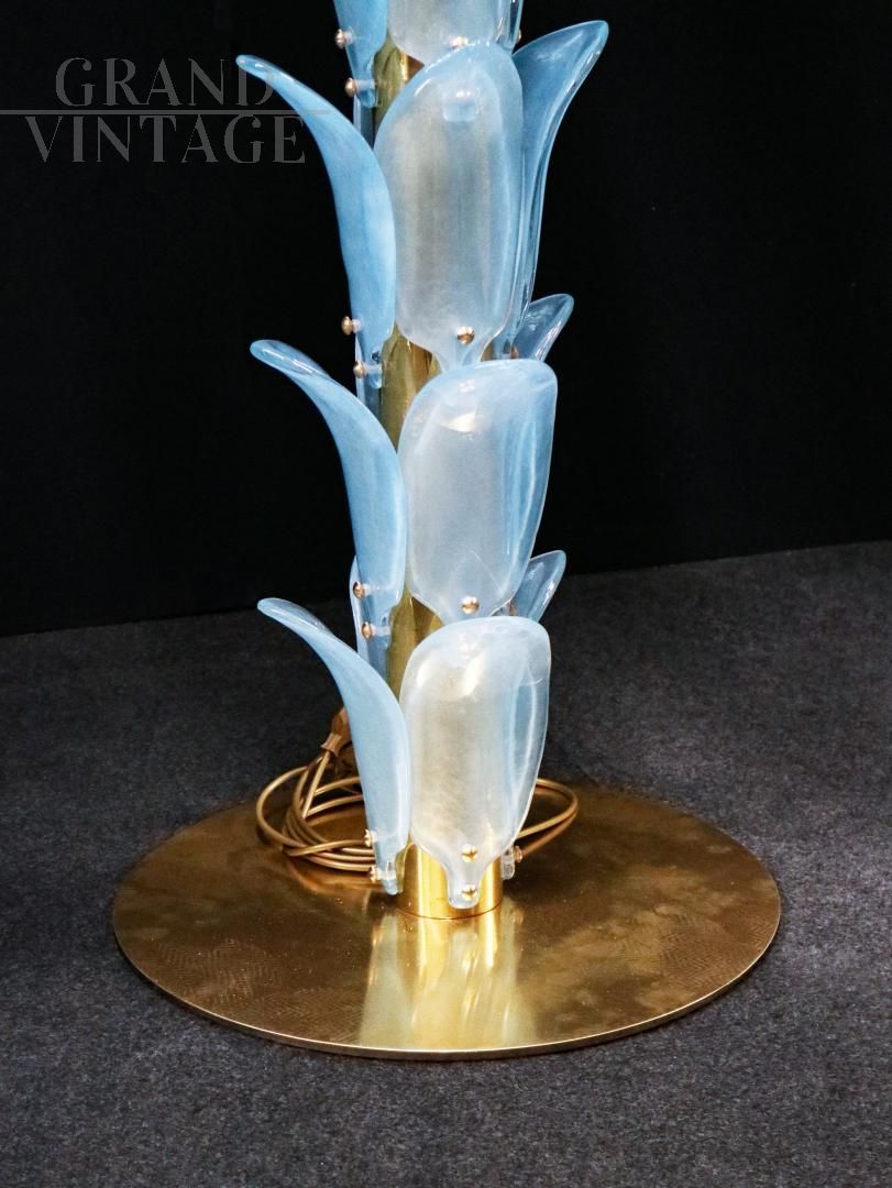 Palm-shaped Murano glass floor lamp, late 1960s - early 1970s, with structure, base and lamp holder in gilded brass, stem fins and leaves in light blue Murano glass.