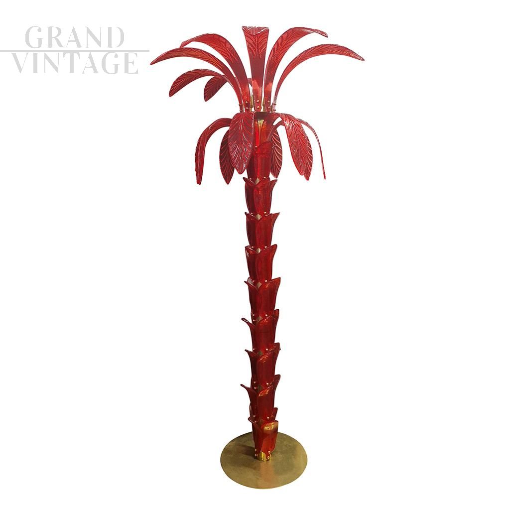 Floor lamp in red Murano artistic glass which reproduces the trunk and leaves of a palm tree with pieces of glass, composed of a brass circular base and a brass stem on which thirty-six small leaves in red Murano glass have been fixed; in the upper part, twenty large leaves, also in red Murano glass, have been inserted in two orders of ten. In the center of the second row of leaves there are four sockets for adjustable E14 type bulbs.
