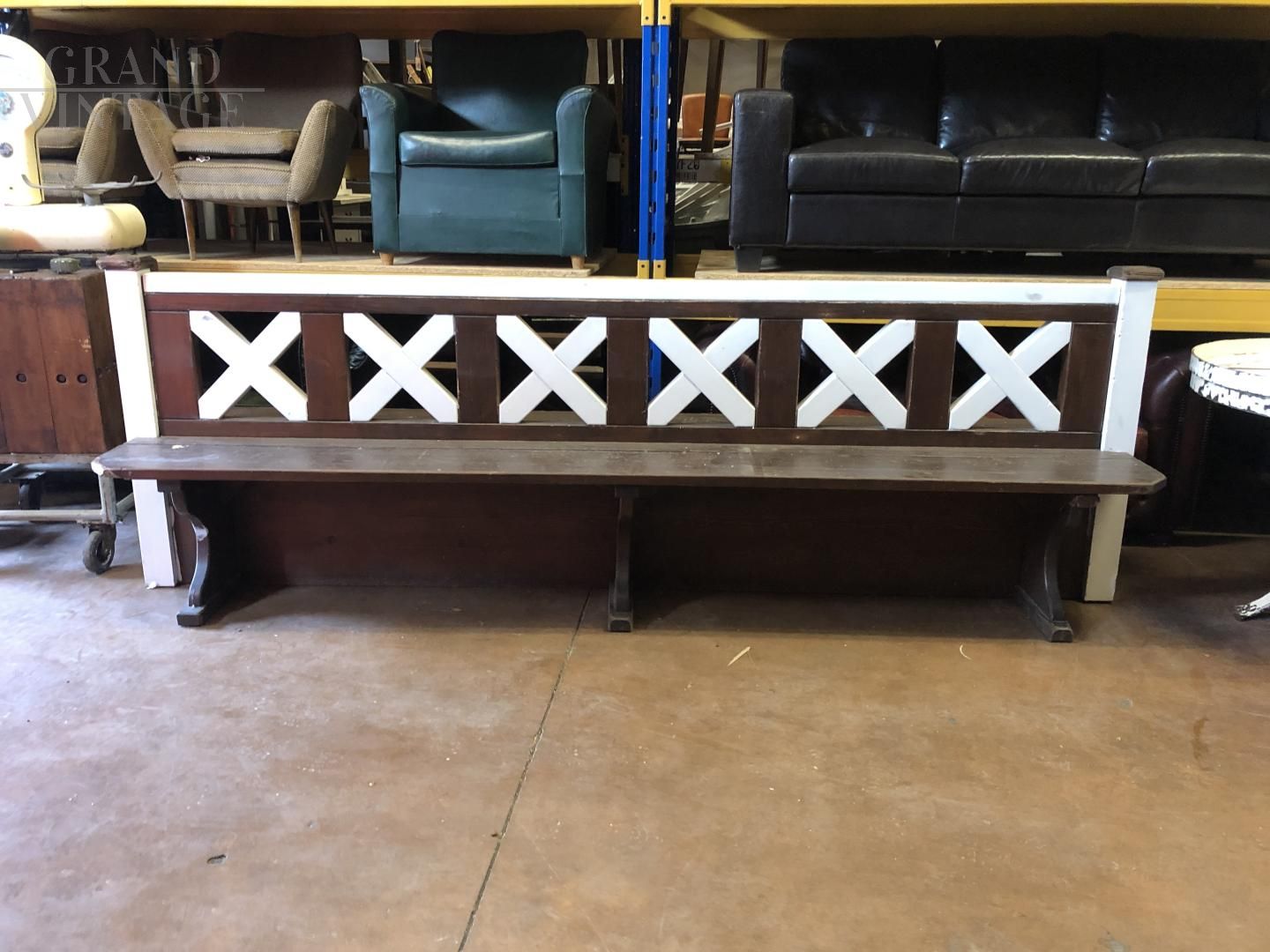 Beautiful vintage wooden bench with seats on both sides, perfect to be placed in the center of a room or in the sheltered part of a garden. The seats are foldable and can be kept up.