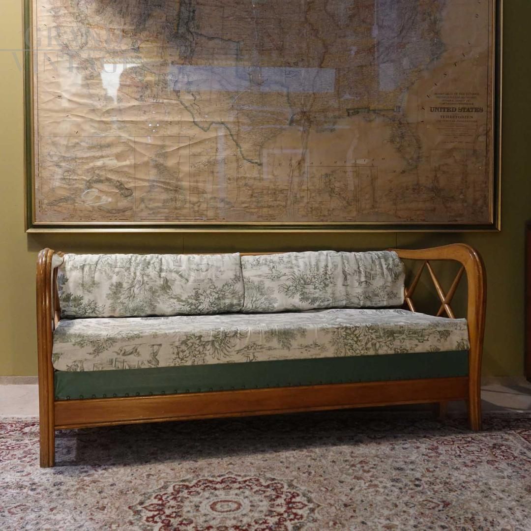 Beautiful vintage sofa in the style of Paolo Buffa with the classic curved wood structure, covered in toile de jouy fabric, with a rustic and welcoming soul, perfect for recreating warm and relaxed atmospheres. The soft lines and natural materials evoke the charm of country houses, making it ideal for shabby, farmhouse or boho chic style environments.