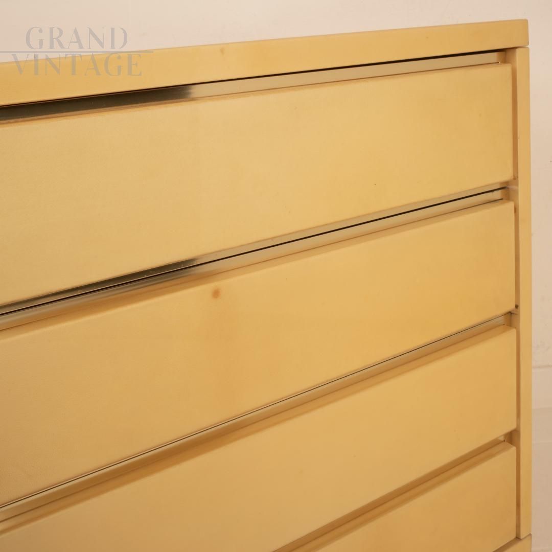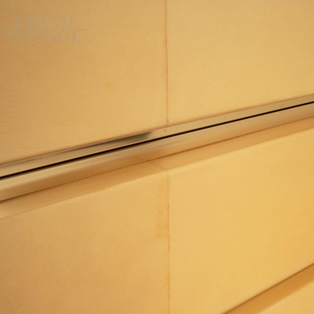 Elegant parchment chest of drawers by Aldo Tura for Tura Milano made in Italy around the end of the 1960s. The chest of drawers is made of wood covered with lacquered goatskin parchment with brass details. The drawers are spacious and containable. In practically perfect condition, despite its age, it may present slight natural signs of aging.