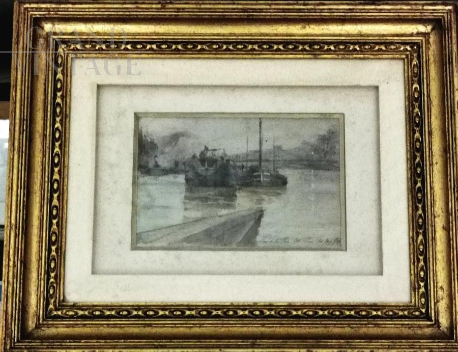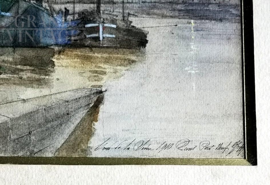 Watercolor on paper by Giovanni Greppi (Milan 1984 - 1960), signed titled and dated 1910, depicting Paris Pont Neuf sur la Seine (Paris, New Bridge over the Seine).