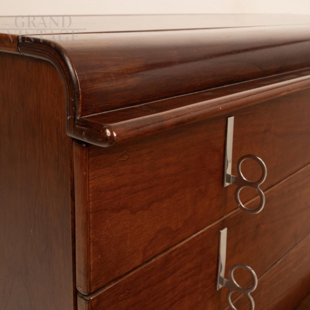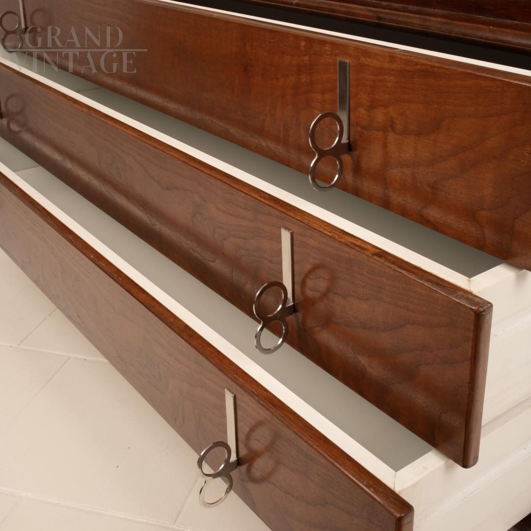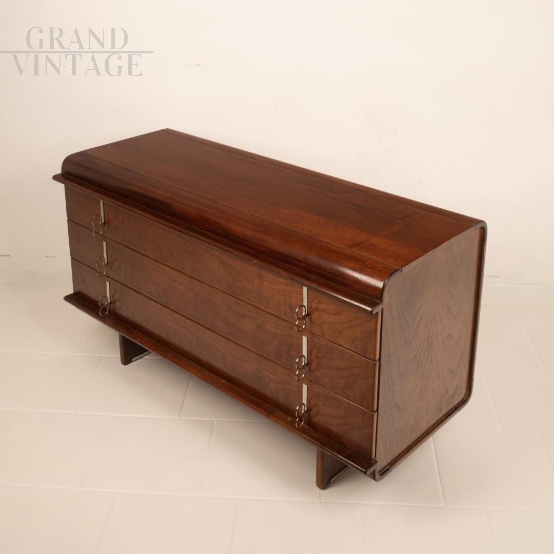 An iconic and rare piece of Italian design, this chest of drawers belonging to the "Pellicano" series represents one of the most sophisticated and recognizable creations by Vittorio Introini, a visionary designer who was able to combine functionality, experimentation and architectural rigor. Produced by Saporiti Italia around 1960, this chest of drawers perfectly embodies the innovative spirit of Italian modernism of the time. Made of walnut veneer with a warm and deep patina, the structure stands out for its sinuous and enveloping profile, with curved corners and chiselled details that betray a very high quality of execution. The slightly rounded top and the connected sides give the piece of furniture a sculptural elegance and a visual dynamism unusual for the time.