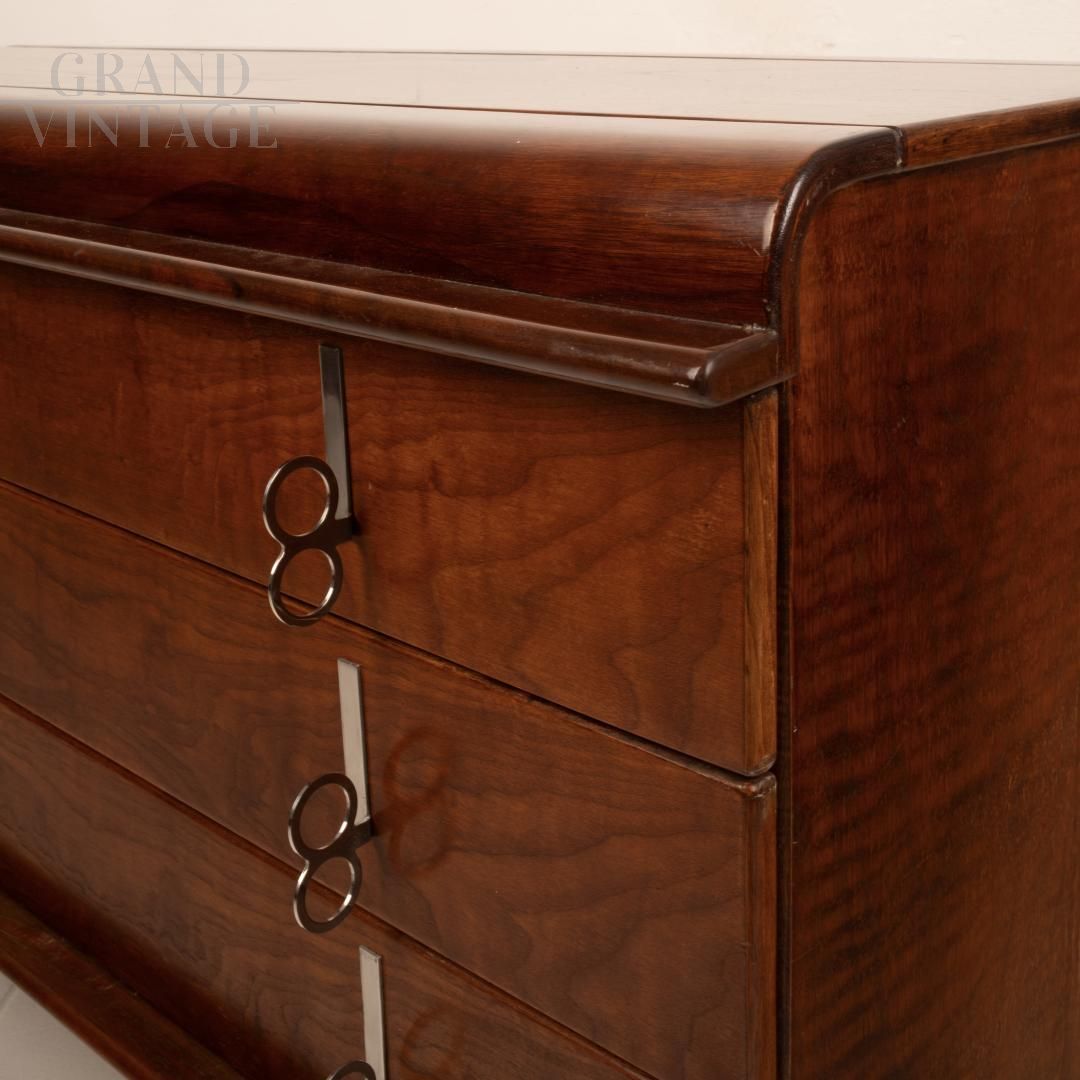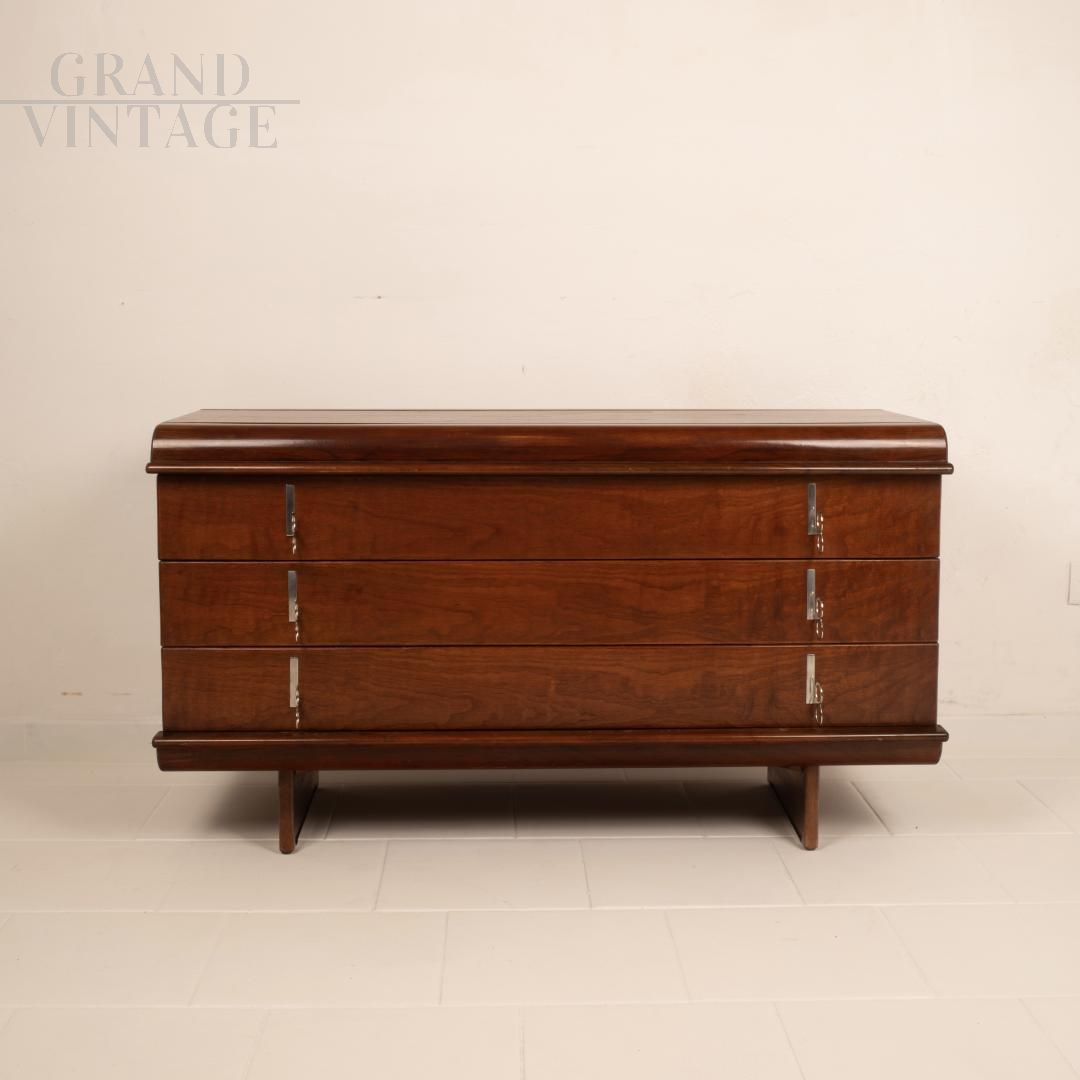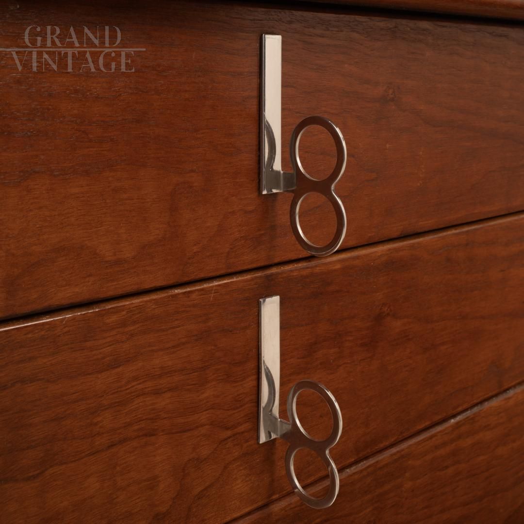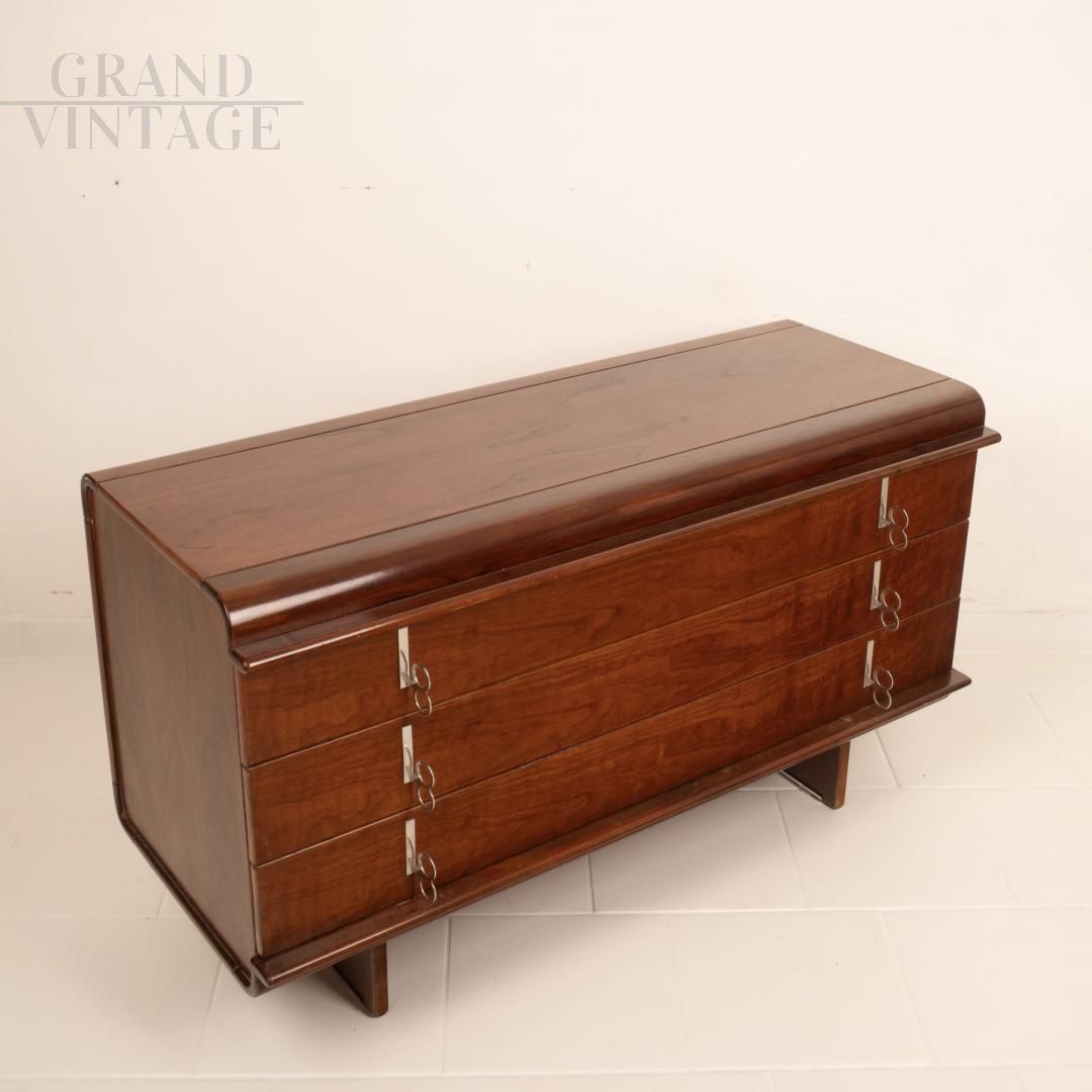 An iconic and rare piece of Italian design, this chest of drawers belonging to the "Pellicano" series represents one of the most sophisticated and recognizable creations by Vittorio Introini, a visionary designer who was able to combine functionality, experimentation and architectural rigor. Produced by Saporiti Italia around 1960, this chest of drawers perfectly embodies the innovative spirit of Italian modernism of the time. Made of walnut veneer with a warm and deep patina, the structure stands out for its sinuous and enveloping profile, with curved corners and chiselled details that betray a very high quality of execution. The slightly rounded top and the connected sides give the piece of furniture a sculptural elegance and a visual dynamism unusual for the time.